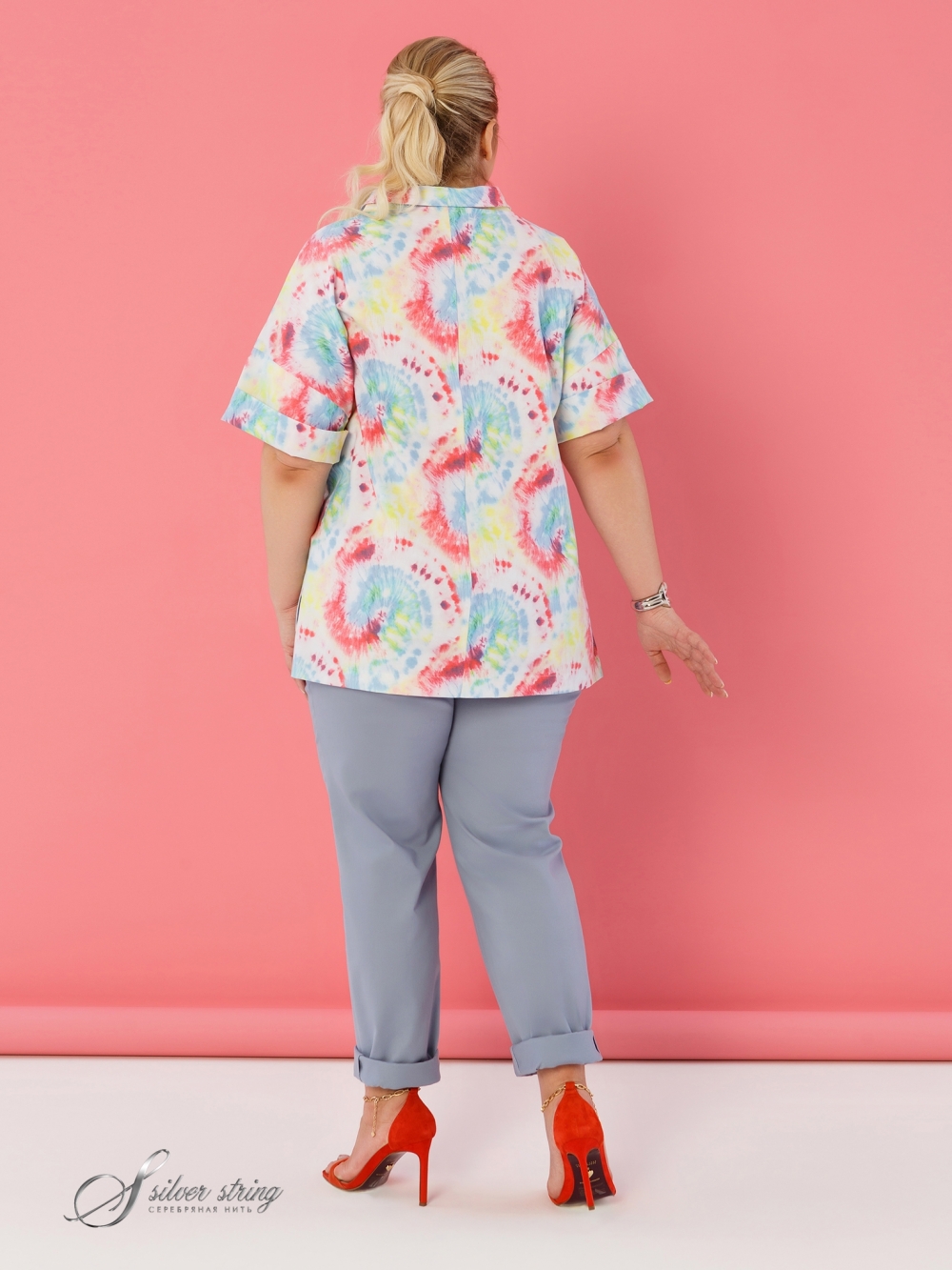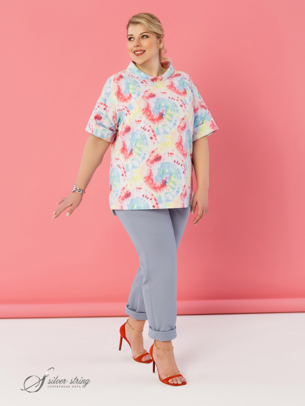 Эффектная Блузка Т-образного силуэта выполнена из ткани с ярким рисунком в стиле «тай-дай». Сатиновое переплетение нитей в полотне, придает материалу бархатистость и приятный блеск. Модель с рукавом покроя «кимоно», длиной до локтя. Низ рукава оканчивается мягким отворотом. Линия горловины слегка расширена к плечам и оформлена воротником-хомутиком. Изделие с асимметричной линией низа: спинка удлинена относительно полочки. В боковых швах обработаны разрезы. Модель отличает изысканный дизайн и практичность высококачественной ткани.
