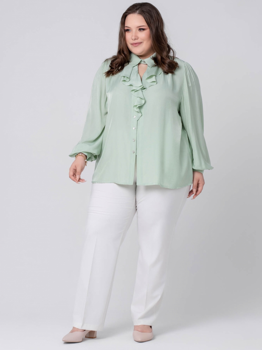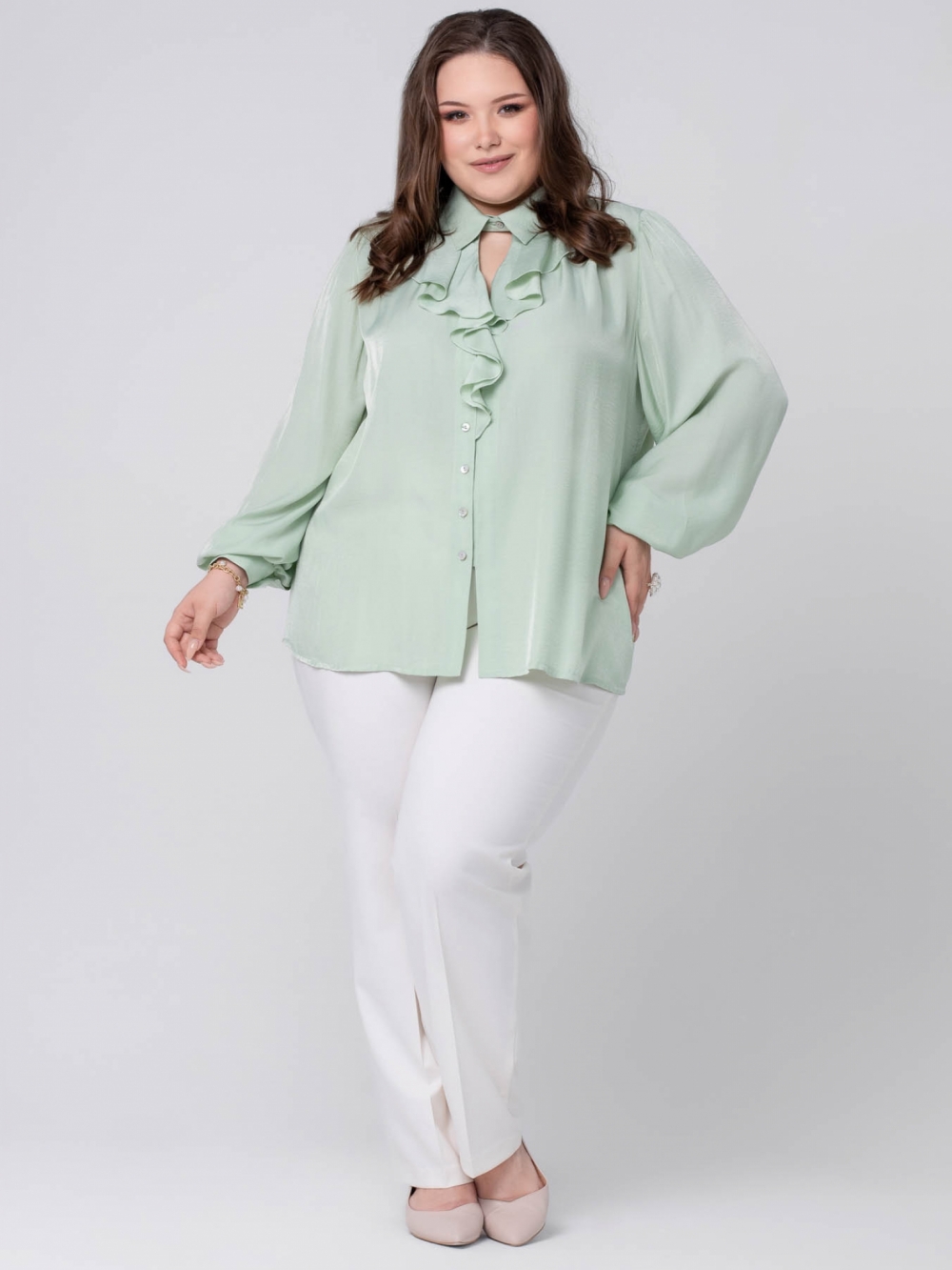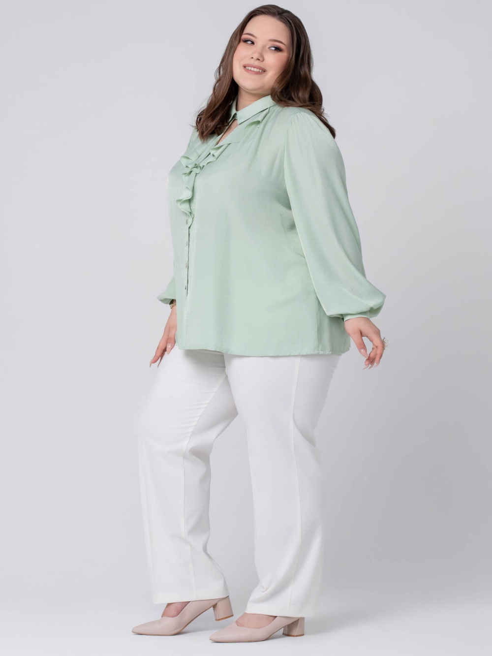 Нарядная блузка прямого силуэта выполнена из шелковистой ткани с блеском. Модель с рубашечным воротником на стойке и эффектным кокилье на полочке. Верхняя часть линия борта слегка отведена и образует V-образный вырез сразу под воротником. Застежка на пуговицы смещена вправо, позволяя кокилье спускаться симметричной волной к центру изделия. Рукав объемный, длинный, с притачной манжетой по низу. Обхват манжеты можно регулировать за счет парных пуговиц. Вдоль плечевых швов, ближе к горловине, заложены мягкие складки. Это идеальная модель, которая притягивает внимание изысканными нюансами и позволит чувствовать себя элегантно при любых обстоятельствах.