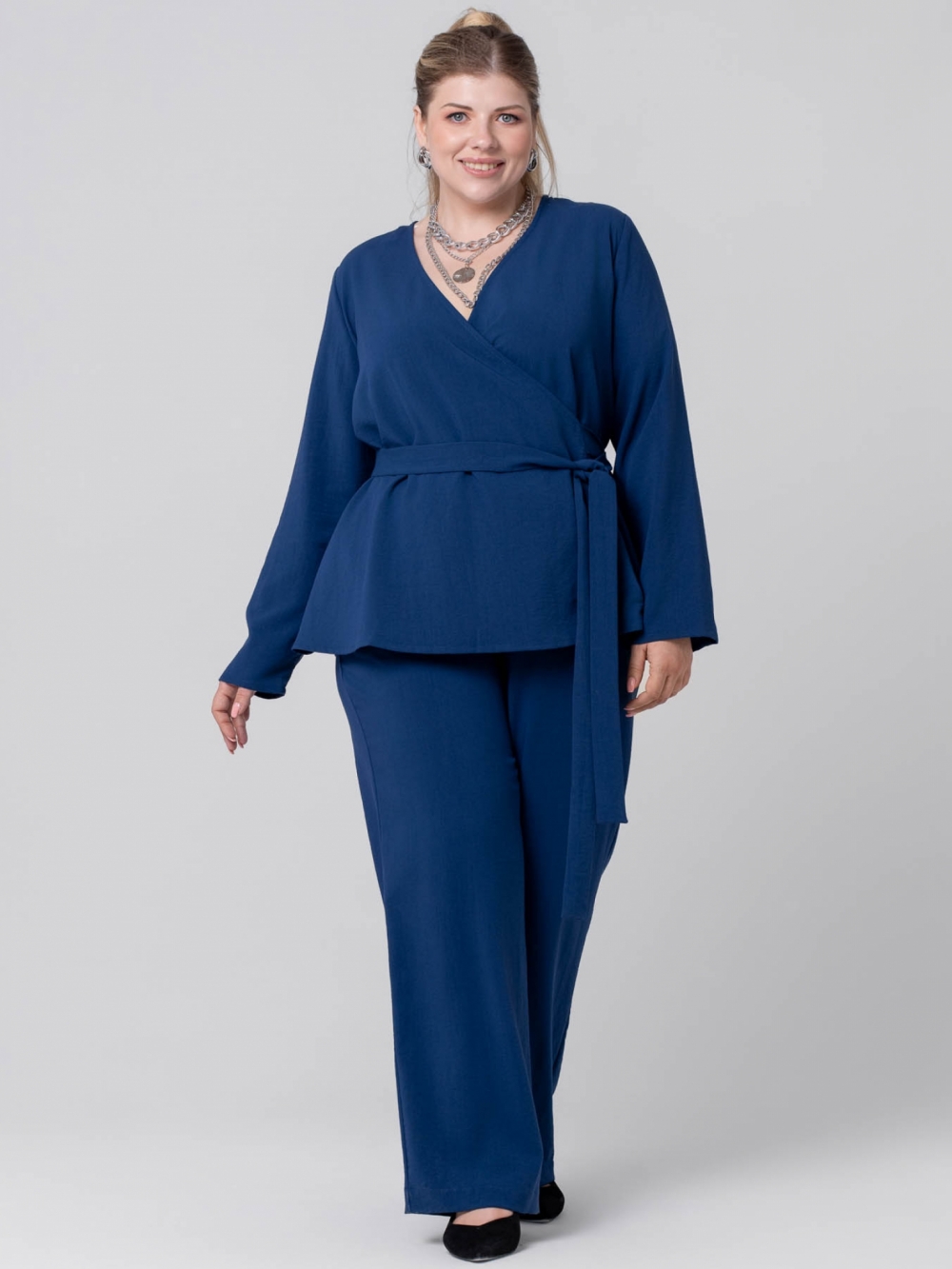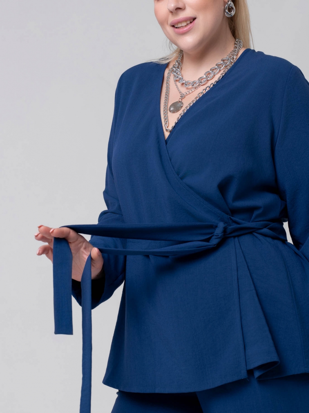 Эффектная блузка прямого силуэта выполнена из гладкокрашеной ткани с высоким содержанием натурального волокна. Модель с V-образным вырезом горловины, переходящим в «запах». На уровне талии закреплены части широкого пояса, которым фиксируется блуза на фигуре. Рукав длинный, прямого кроя, что позволяет носить его «на отворот». Модель прекрасно комплектуется с широкими брюками. Такой костюм выглядит очень элегантным и выгодно подчеркнет женский силуэт. Секрет заключается в идеальных лекалах и интересных деталях, которые не оставят Вас равнодушными.