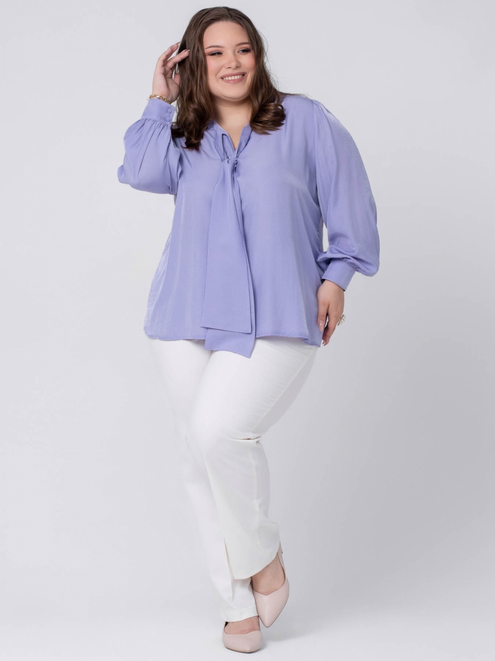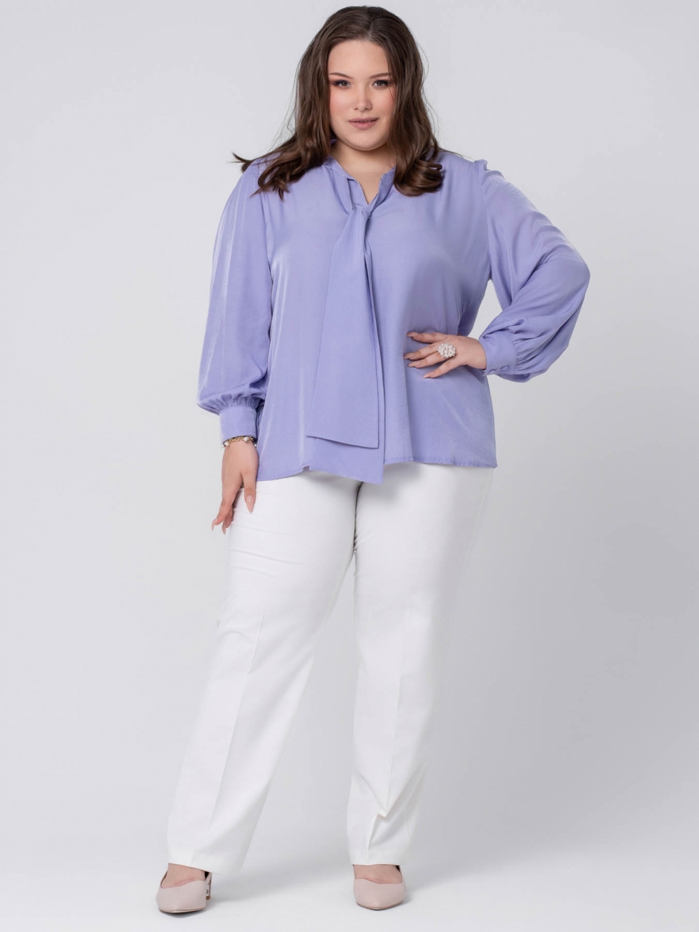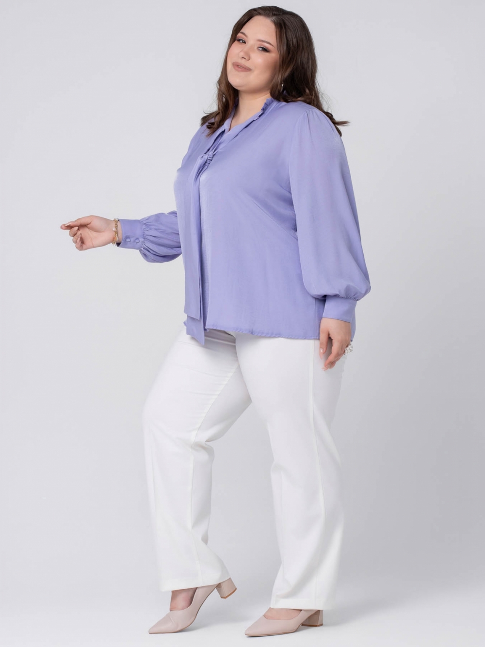 Нарядная блузка прямого силуэта выполнена из шелковистой ткани с блеском. Модель без застежки,с длинным втачным рукавом. Объемпритачной манжеты можно регулировать за счет парных пуговиц. Изысканная нежная рюша, по линии горловины, придает изделию эффектный вид. V-образный вырез по полочке можно скрепить при помощи галстука. Невесомая ткань и оригинальный крой модели придают образу трогательную женственность.