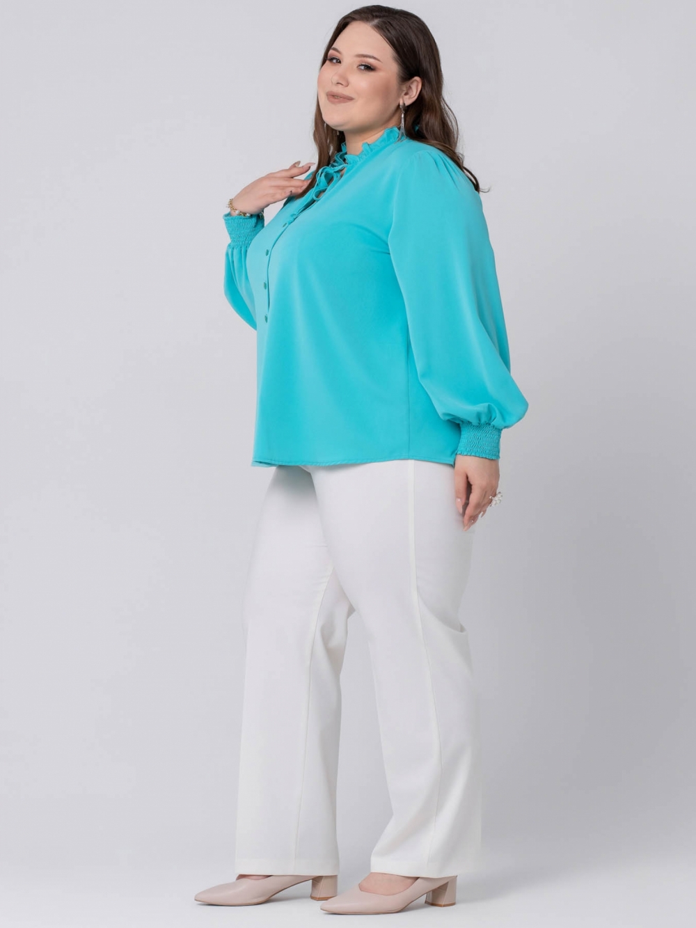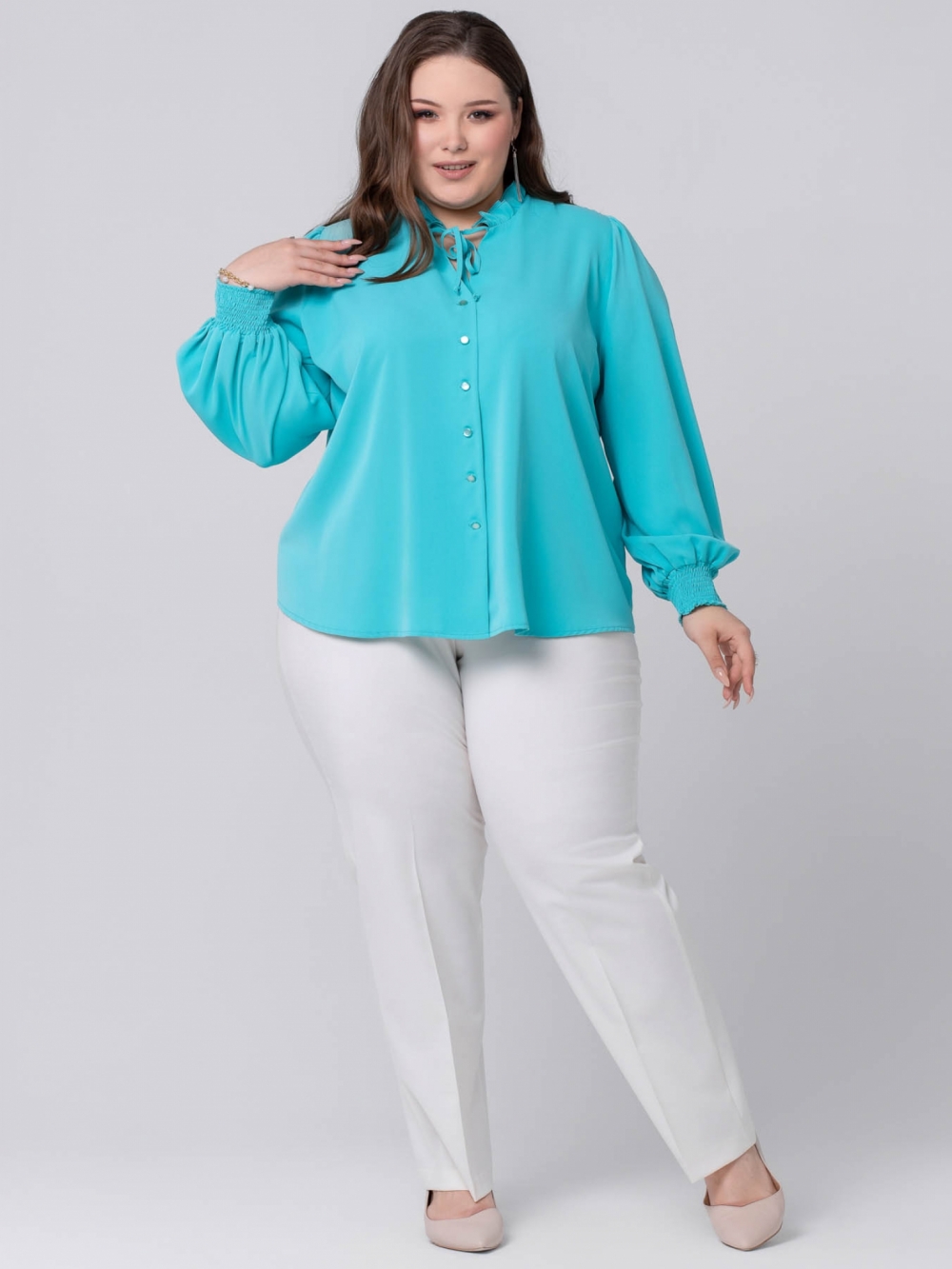 Нарядная Блузка из эластичной смесовой ткани, идеальна для создания элегантного образа! Модель прямого силуэта, с застежкой на пуговицы. Объемные рукава, присобранные на манжету, добавляют блузе особенный шарм. Эластичность манжеты достигается за счет параллельных строчек, выполненных с помощью тонкой резинки. Такая манжета удобно сядет на любом запястье. Изысканная декоративная рюша, по линии горловины, придает изделию эффектный вид. V-образный вырез по полочке можно скрепить при помощи тонкого шнура. Блузка сочетает в себе классику и тренд сезона: нежный женственный стиль.