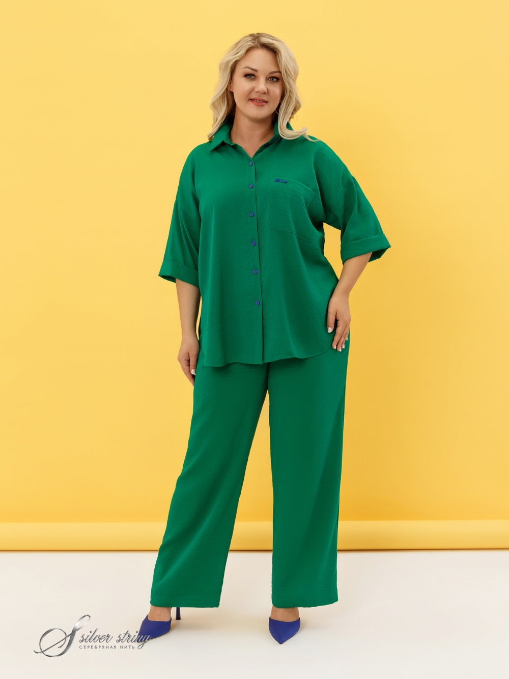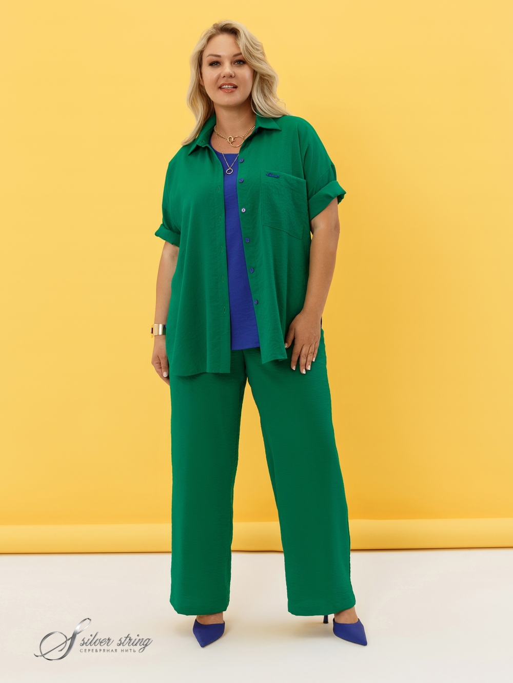 Яркая Блузка-рубашка, в стиле спорт шик, выполнена из фактурной смесовой ткани с «крэш» - эффектом. Модель прямого силуэта, с удлиненной линией плеча и прямым, просторным рукавом, длиной за локоть. Низ рукава оформлен мягким отворотом. Воротник рубашечный, на стойке. По борту расположена застежка на контрастные пуговицы. Декоративный элемент, в цвет пуговиц, закреплен на нагрудном кармане. В боковых швах обработаны разрезы скругленной формы. Модель отлично подойдет для создания разнообразных эффектных ансамблей.