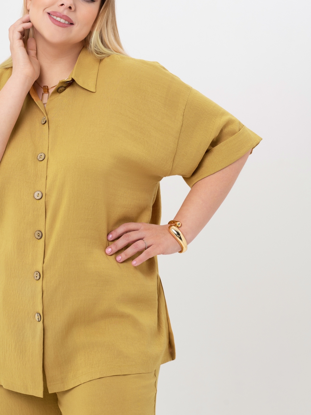Современная блузка-рубашка Т-образного силуэта выполнена из однотонной вискозной ткани с эластаном. Модель с удлиненной линией плеча и просторным рукавом длиной за локоть. Низ рукава оформлен отворотом. По борту обработана застежка на пуговицы, изготовленные из кокосовой скорлупы. Воротник рубашечный, на стойке. В боковых швах расположены разрезы. Изделие отлично скрывает проблемные зоны фигуры, а невесомая ткань делает модель незаменимой и Вам, скорее всего, захочется проводить в ней все жаркие дни.