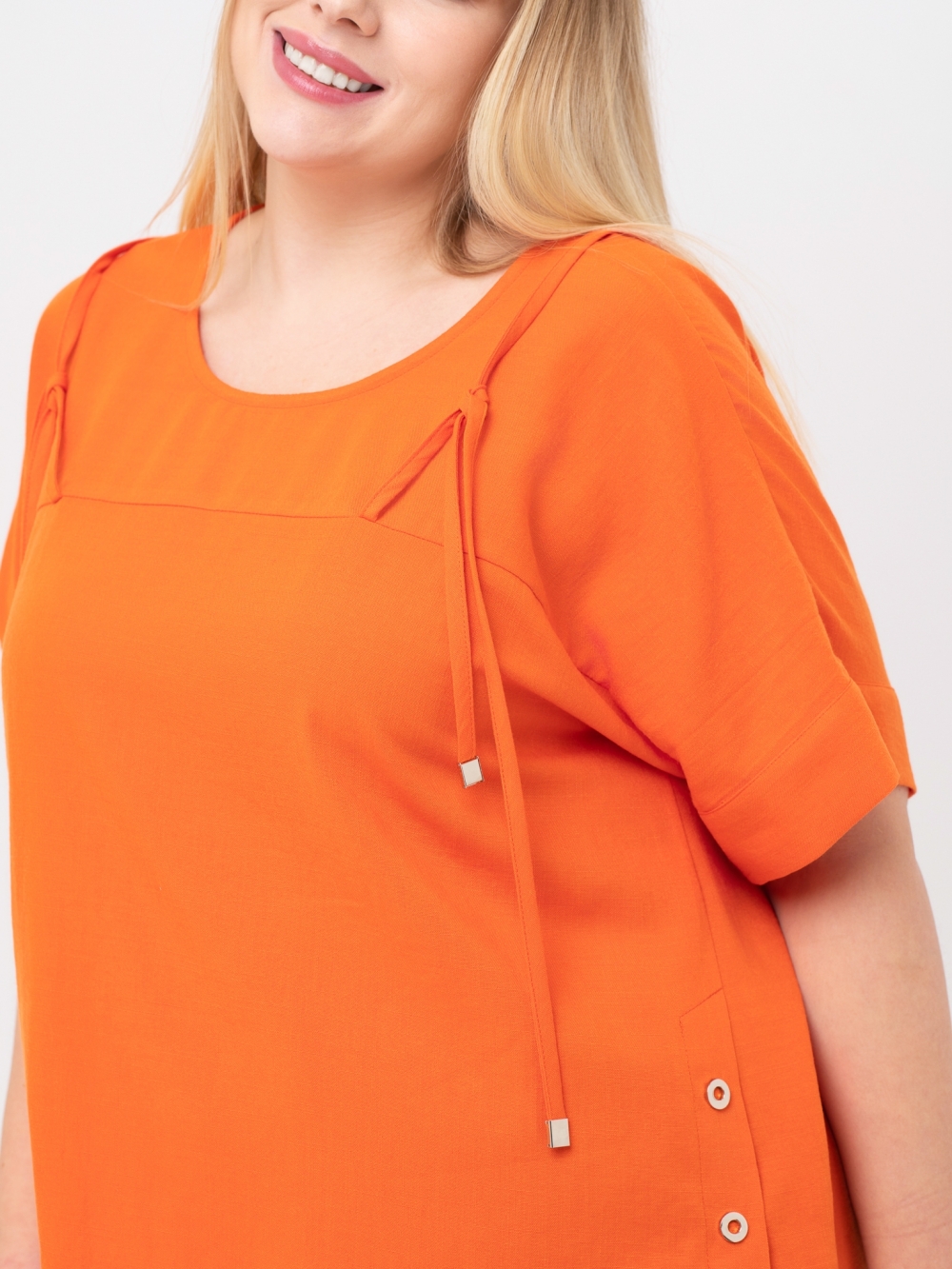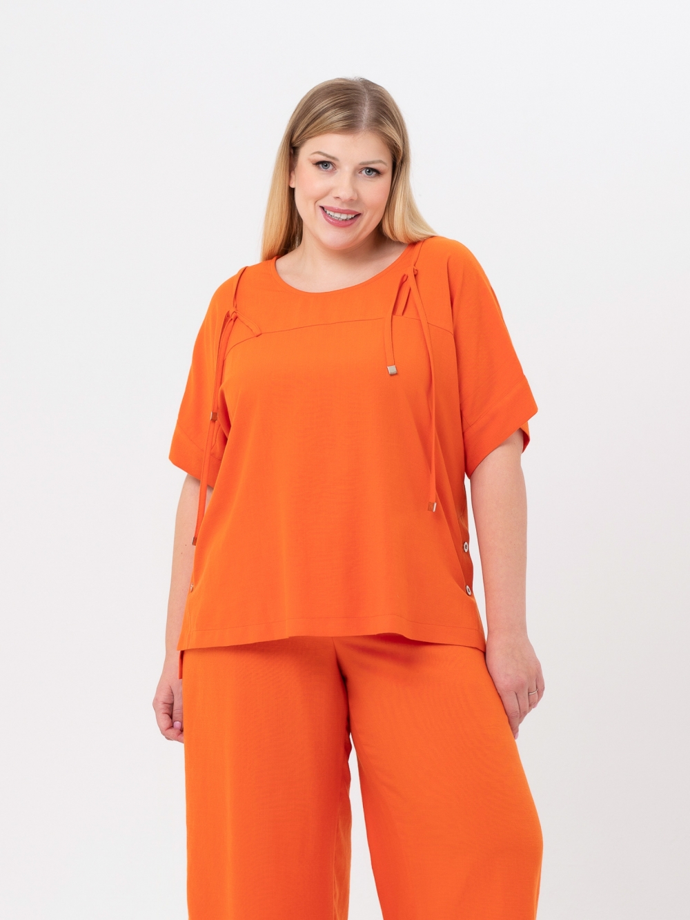 Идеальный выбор для повседневного стиля - комфортная блузка Т-образного силуэта из смесовой ткани с высоким содержанием натурального волокна. Прямой рукав покроя кимоно, длиной до локтя, обеспечивает удобство и свободу движений. Вырез округлой формы. На полочке и спинке расположены подрезные кокетки, в которые втачаны тонкие, декоративные шнурки с металлическими наконечниками, которые завязаны на плечах. В боковых швах обработаны разноуровневые шлицы, с декоративными кнопками. Нестандартный подход к дизайну и делает эту блузу незаменимой для создания современного, городского образа.