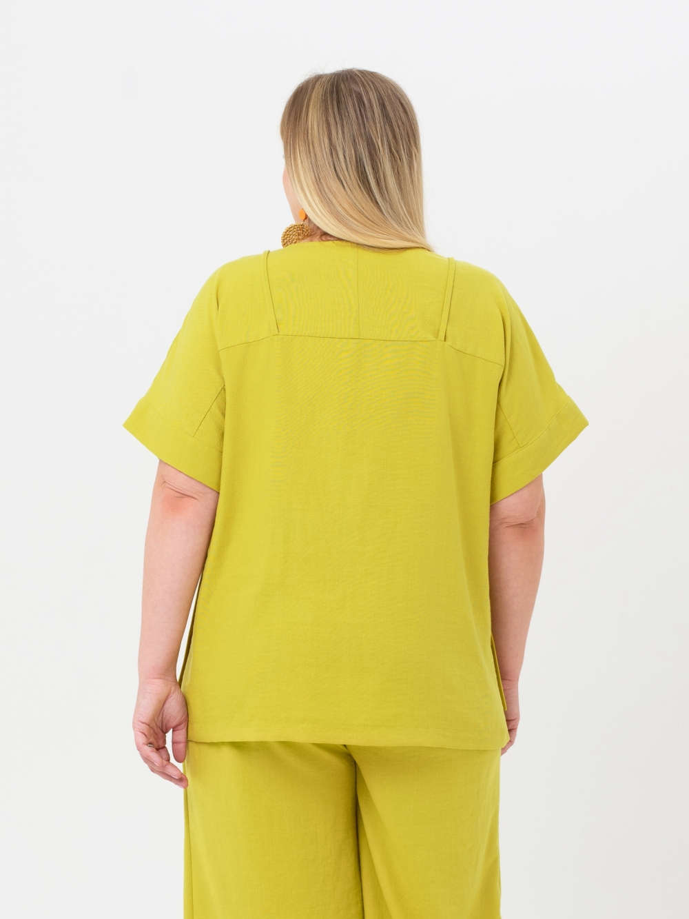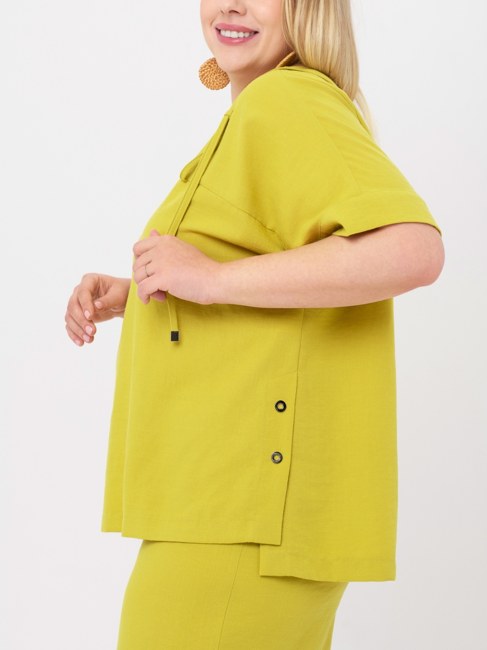 Идеальный выбор для повседневного стиля - комфортная блузка Т-образного силуэта из смесовой ткани с высоким содержанием натурального волокна. Прямой рукав покроя кимоно, длиной до локтя, обеспечивает удобство и свободу движений. Вырез округлой формы. На полочке и спинке расположены подрезные кокетки, в которые втачаны тонкие, декоративные шнурки с металлическими наконечниками, которые завязаны на плечах. В боковых швах обработаны разноуровневые шлицы, с декоративными кнопками. Нестандартный подход к дизайну и делает эту блузу незаменимой для создания современного, городского образа.