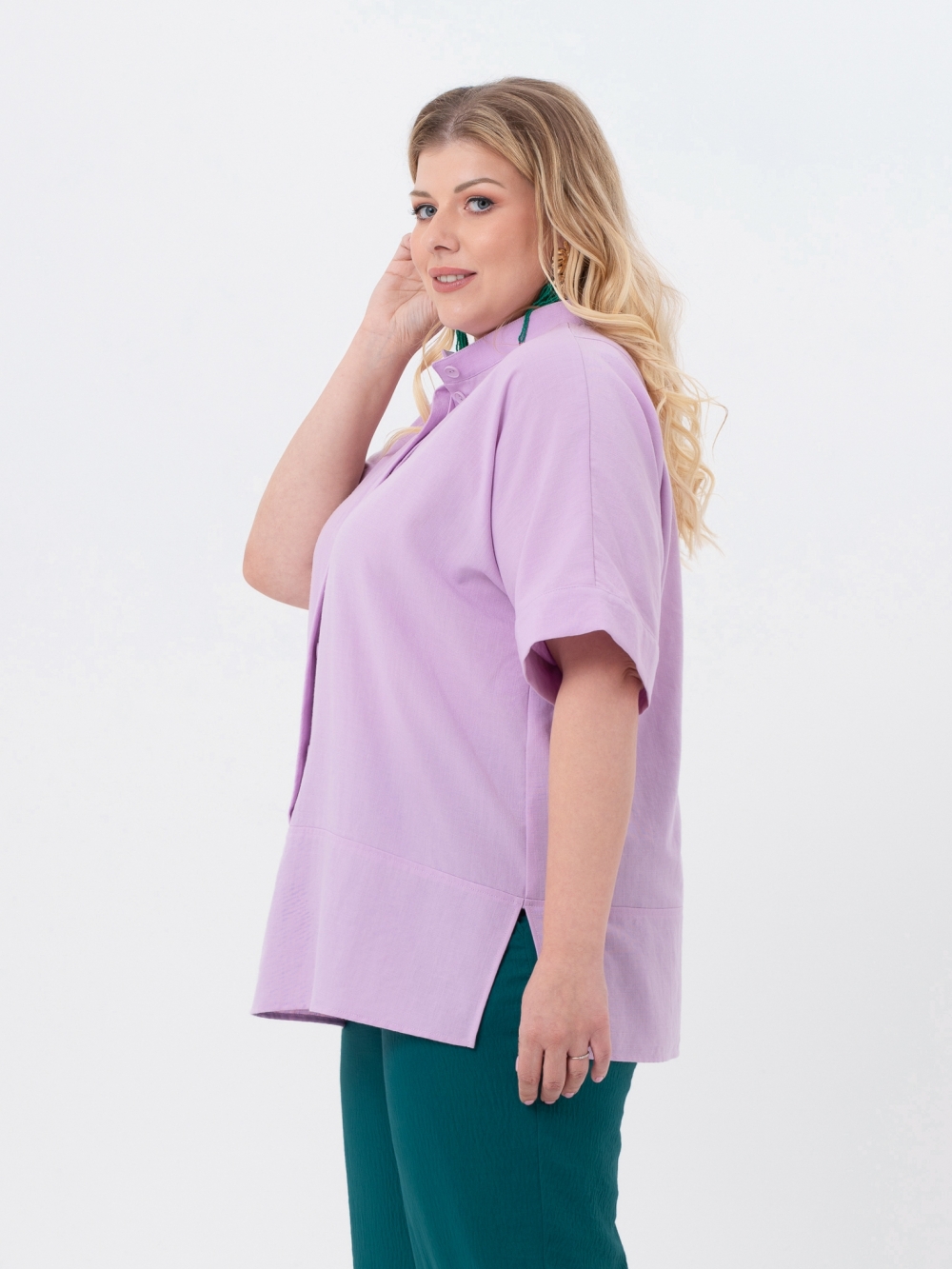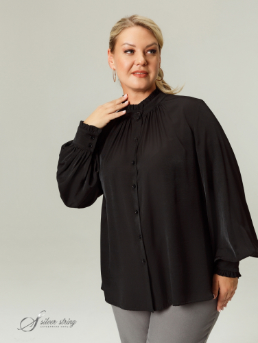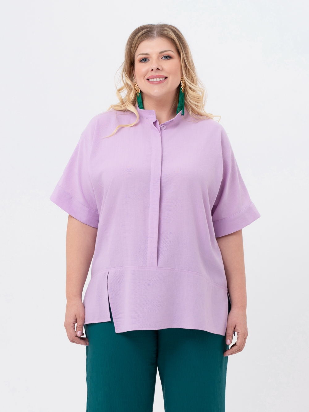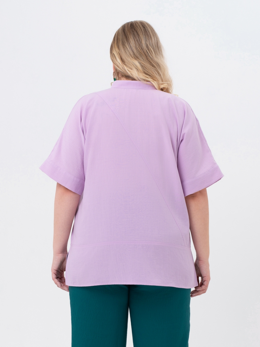 Уникальная блузка свободного силуэта из однотонной, смесовой ткани с высоким содержанием натурального волокна. Модель асимметричного кроя: разноуровневые, диагональные подрезы по полочке и спинке создают замысловатый геометрический рисунок. Воротник-стойка. Супатная застежка на пуговицы доходит до подреза по низу полочки. Цельнокроеный рукав, длиной до локтя, оканчивается притачным отворотом. В боковых швах обработаны разрезы, которые вместе с асимметричным низом придают модели графичность и динамику. Модель прекрасно маскирует проблемные зоны, создавая ощущение комфорта и свободы.