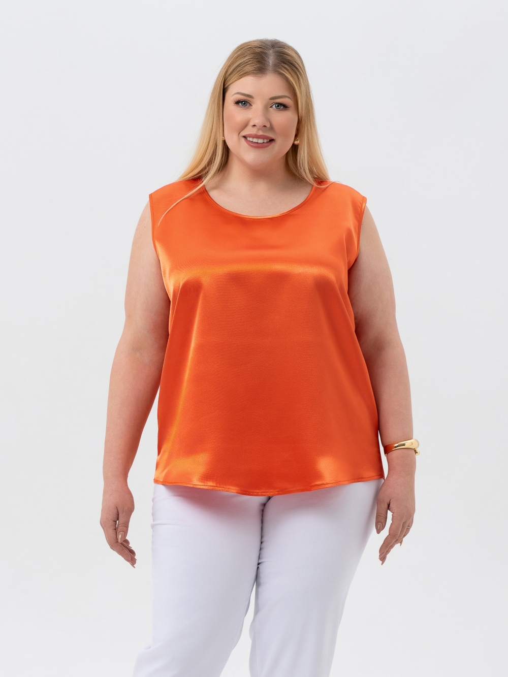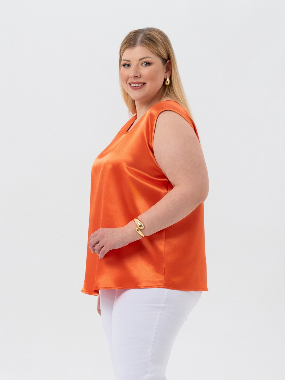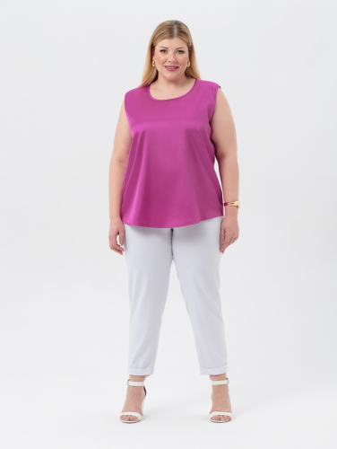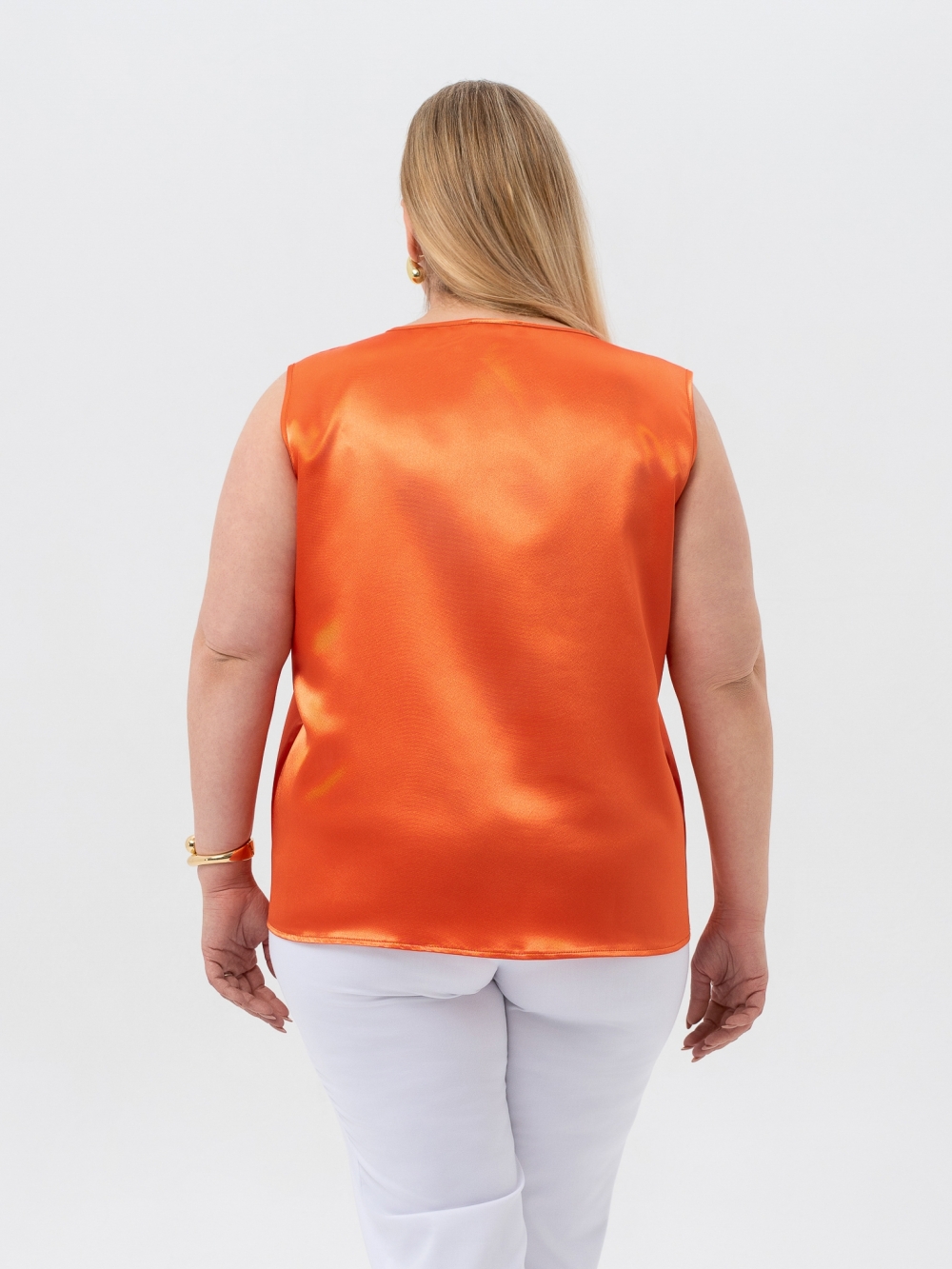 Изысканный топ, без рукавов, с круглым вырезом, создан из нежной шелковистой ткани с легким крэш-эффектом. Яркий цвет блузы привлекает внимание и делает образ запоминающимся. Этот топ идеально подходит для создания стильного летнего образа, сочетаясь как с повседневной, так и с вечерней одеждой.