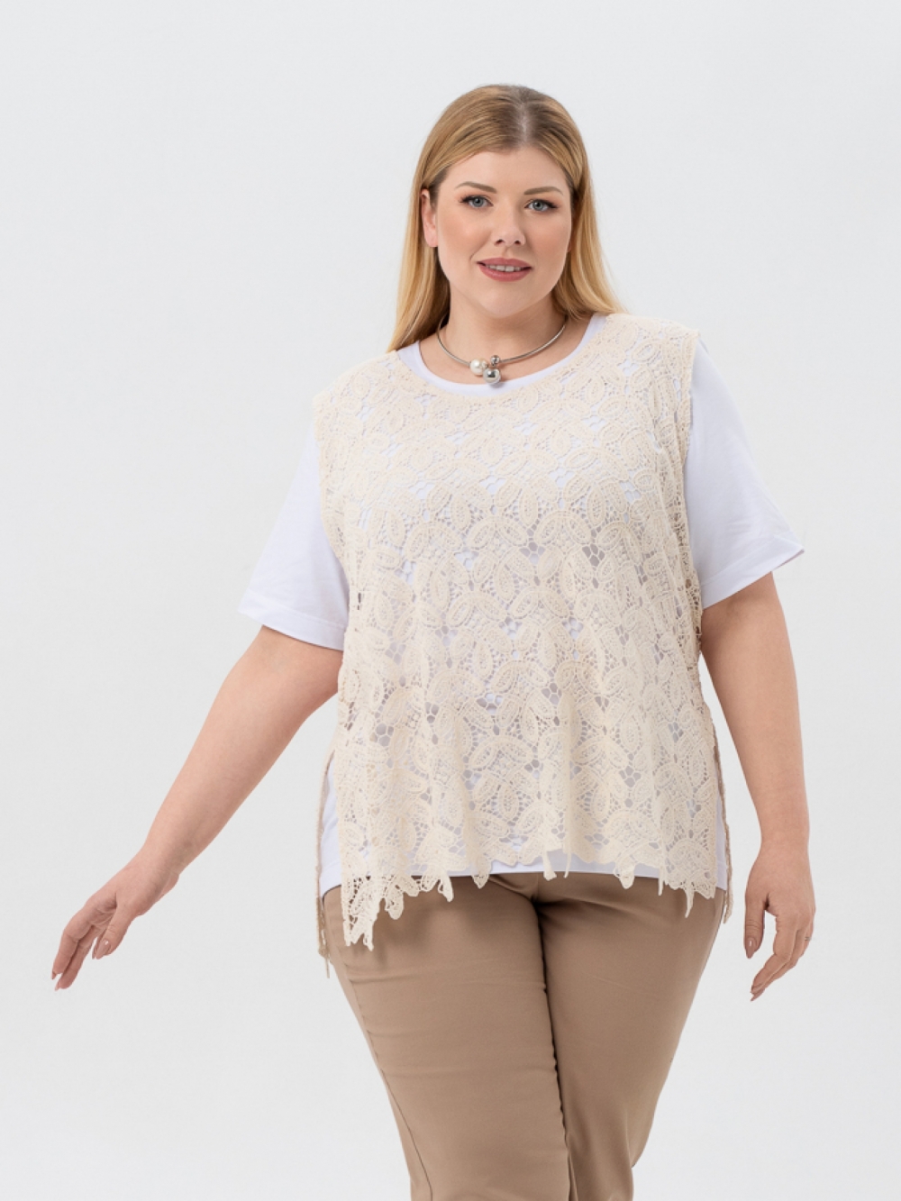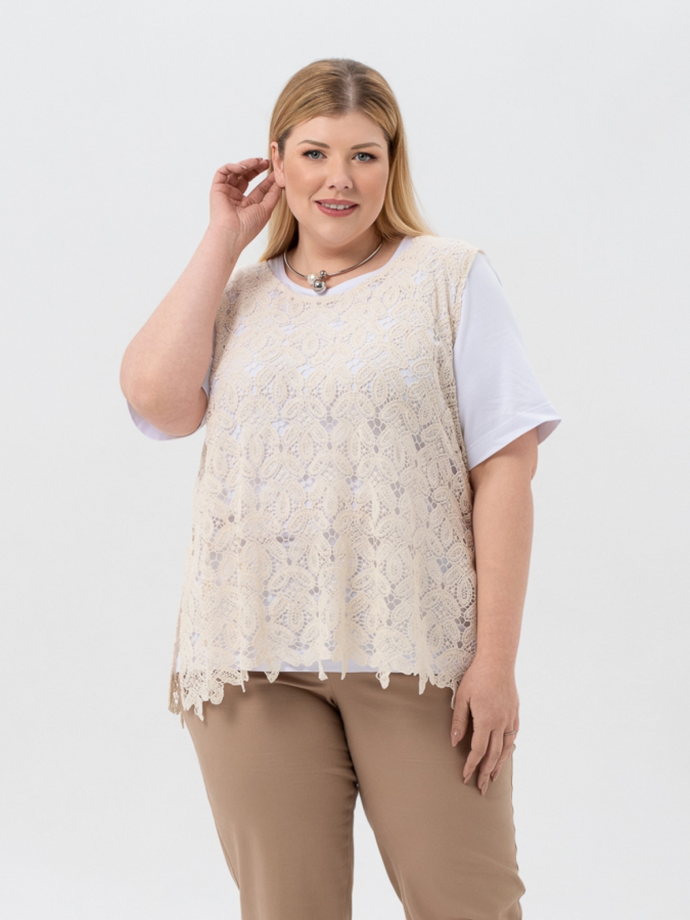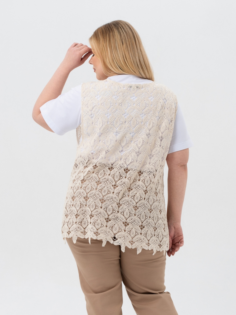 Нарядная блуза-топ изготовлена из кружевного полотна оттенка «айвори». Модель прямого силуэта, с удлиненной линией плеча, без рукава. Вырез горловины округлой формы. Это эффектная модель незаменима для создания комплектов для торжественных случаев и праздничных мероприятий, она прекрасно сочетается с различными жакетами, кардиганами и блузонами.