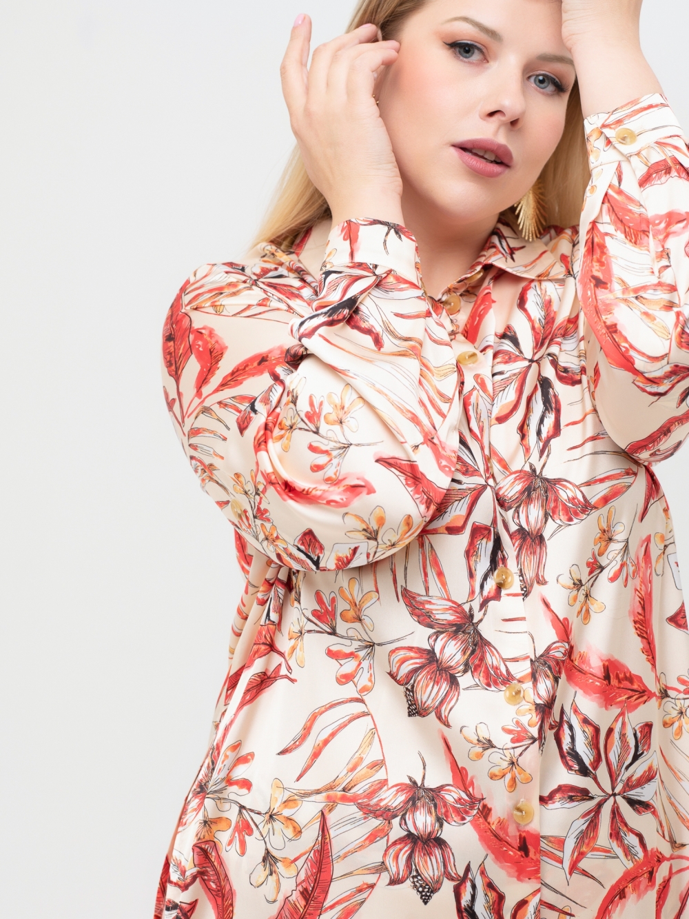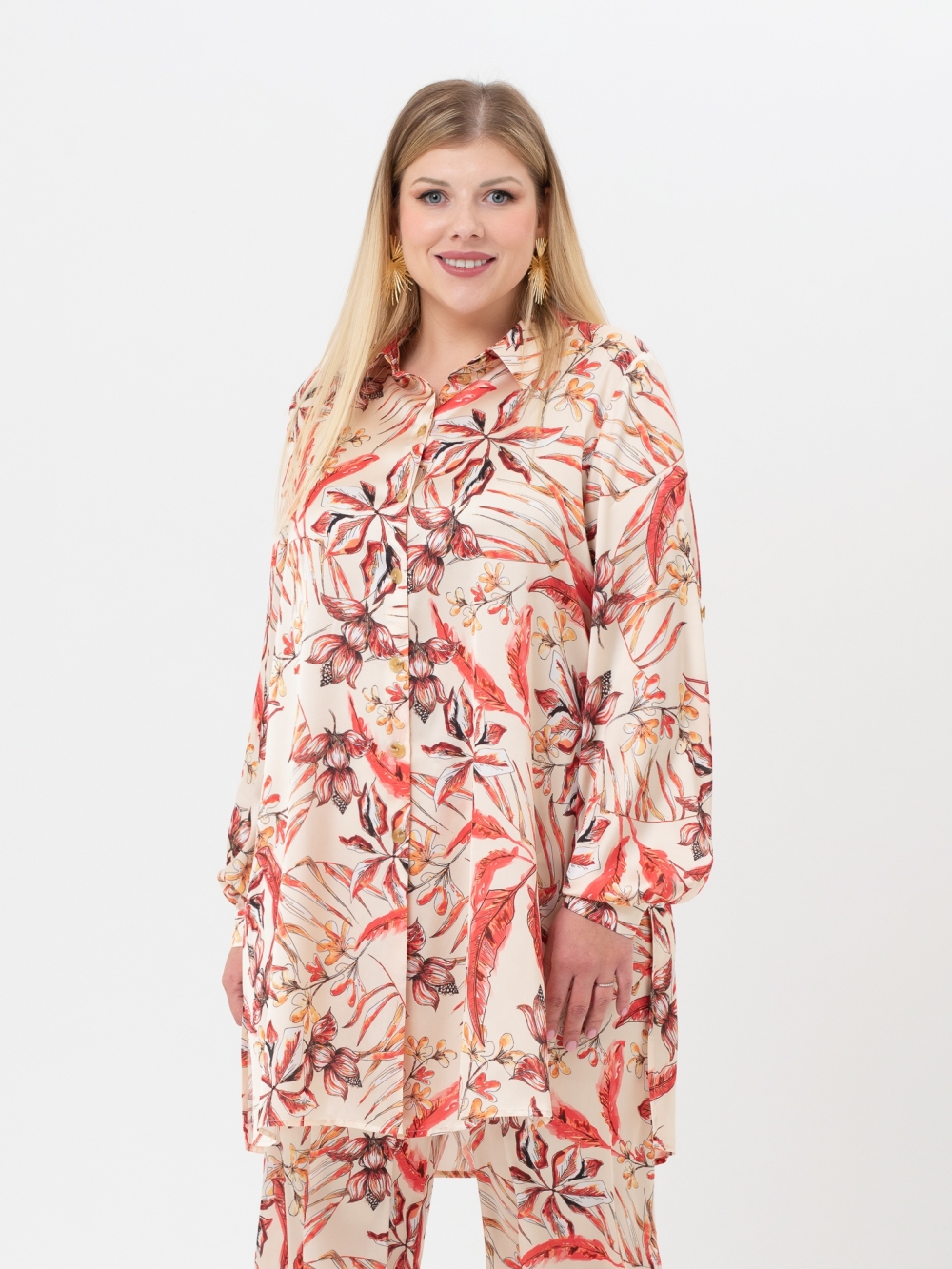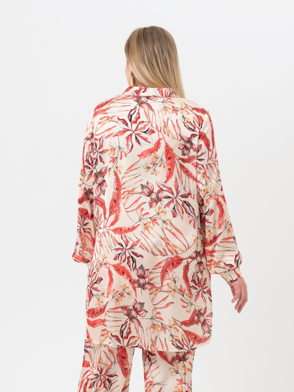 Эта эффектная, удлиненная блузка в «пижамном стиле» выполнена из шелковистой ткани с причудливым рисунком, который можно рассматривать не отрываясь. Модель прямого силуэта, с длинным втачным рукавом, с притачной манжетой. Объем манжеты регулируется за счет парных пуговиц. Воротник рубашечный, на стойке, застежка на пуговицы. Особый шарм изделию придают высокие разрезы по бокам. Внутри рукава настрочена пата, с помощью, которой можно зафиксировать рукав, слегка присобрав его. Блуза отлично комплектуется с широкими брюками. Это идеальный выбор для создания элегантного образа, который привлекает внимание и вызывает сильные эмоции.