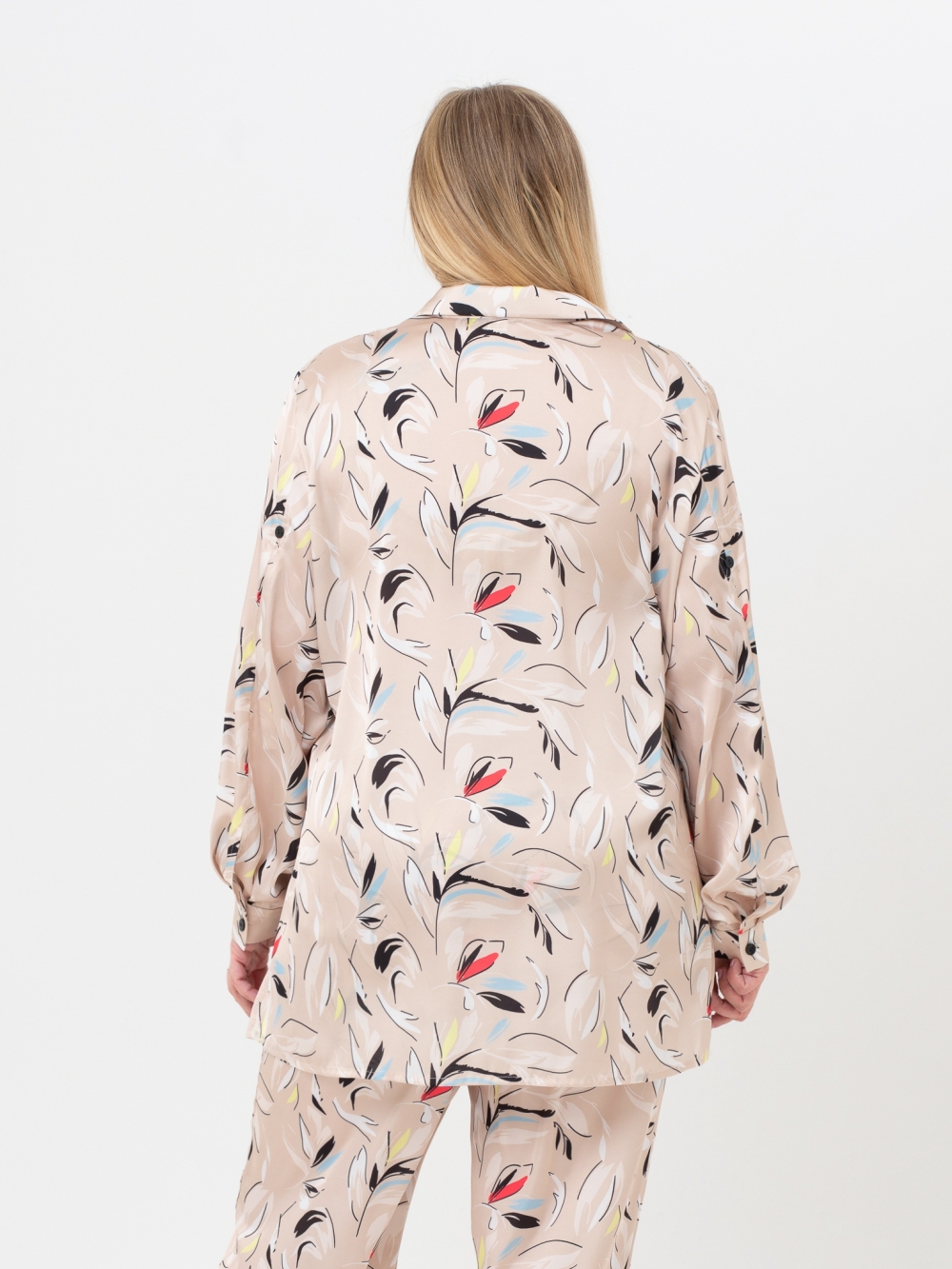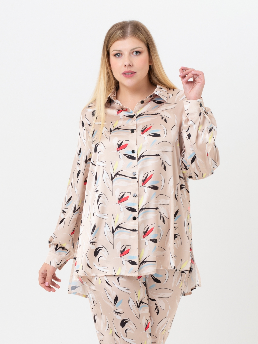 Эффектная блузка-рубашка, в «пижамном стиле», выполнена из шелковистой ткани с удивительным рисунком, который просто завораживает своим изяществом. Модель прямого силуэта, с длинным втачным рукавом, с притачной манжетой. Объем манжеты можно регулировать за счет парных пуговиц. Воротник рубашечный, на стойке. На полочке обработана застежка на пуговицы. Особый шарм изделию придают высокие разрезы по бокам. Внутри рукава настрочена пата, с помощью, которой можно зафиксировать рукав, слегка присобрав его. Блуза отлично комплектуется с широкими брюками. Эффектная ткань и отличная посадка модели подчеркнёт шарм и стиль каждой женщины, независимо от её форм.