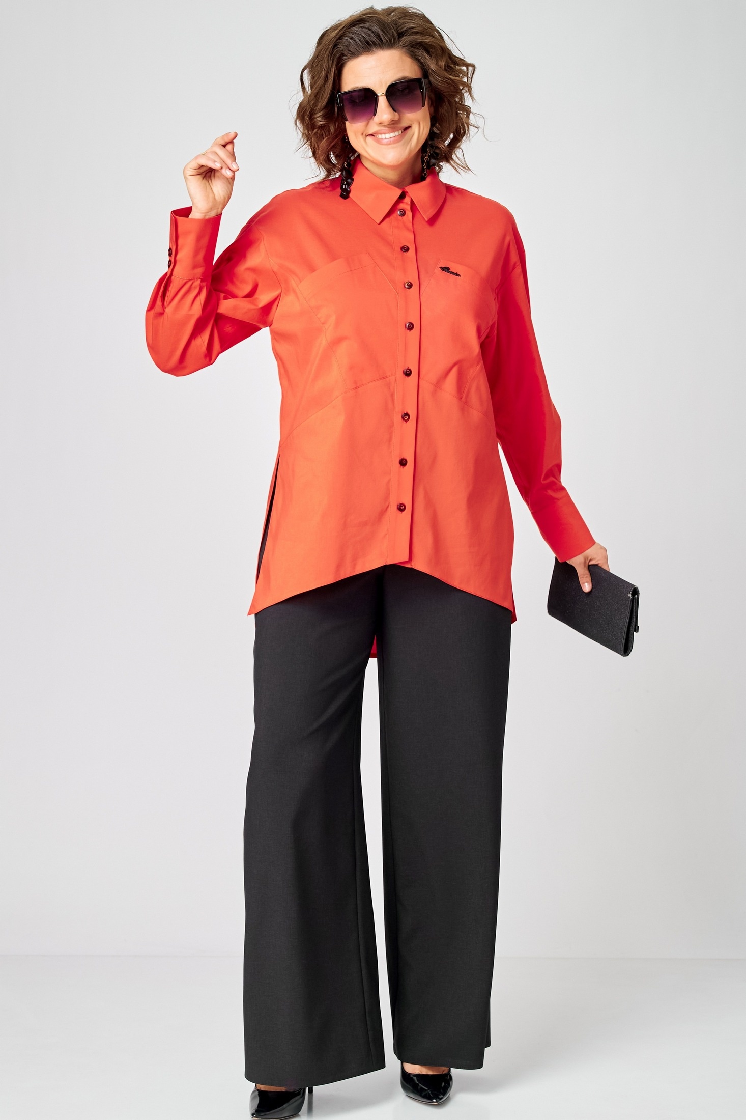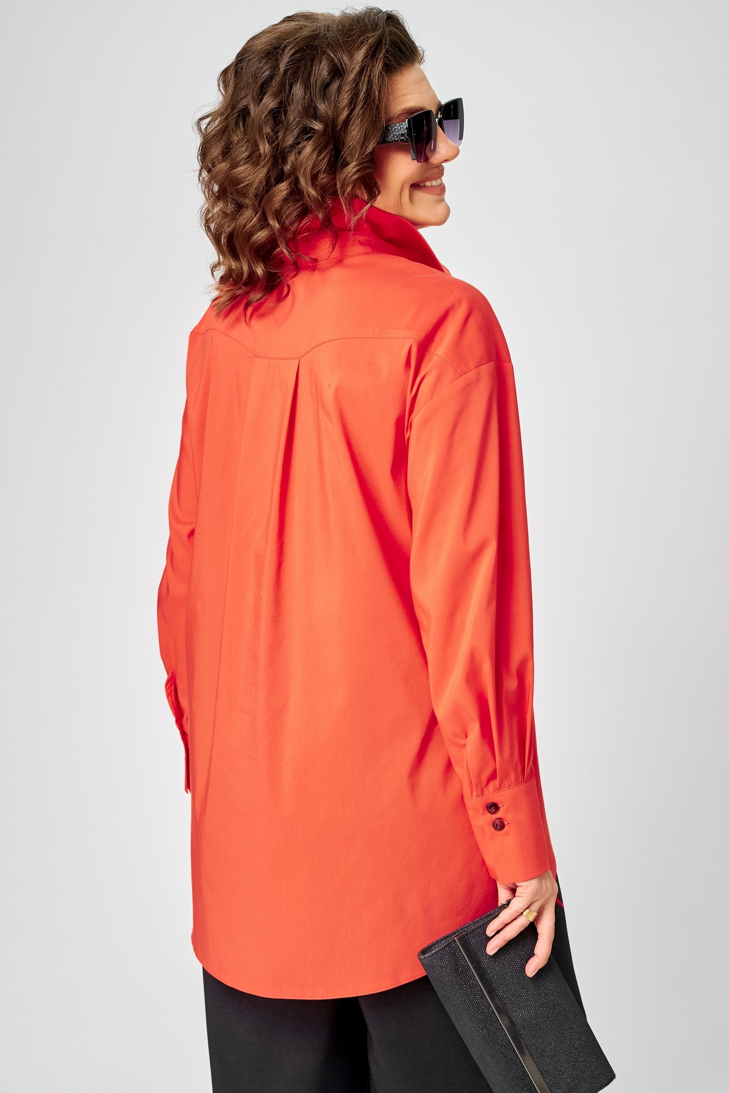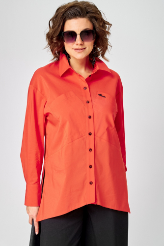 Блузка женская нарядно-повседневного элегантного стиля, прямого силуэта с фигурным низом, выполнена из шикарного дышащего однотонного хлопка. Вырез горловины воротник на стойке рубашечного типа, застежка доверху на обметанные петли и пуговицы. Рукав спущенный, втаной на притачной манете, в боковых швах обработаны разрезы. На полочках два функциональных накладных кармана, изящная металлическая бренд-лейбл и контрасные пуговицы придают изделию стильный и современный дизайн. По спинке фигурная кокетка и встречная складка, создают идеальную посадку. Универсальный силуэт, элегантный крой, стильный дизайн - все детали только подчеркивают достоинства фигуры. а необычный цвет, создает уверенный образ.