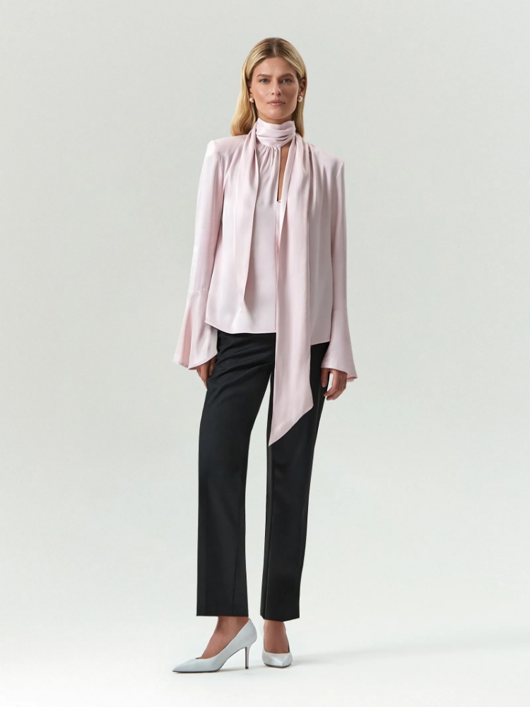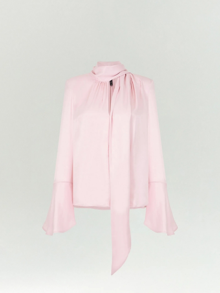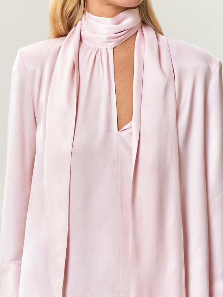 Лёгкая, мягкая и нежная блуза в цвете розового кварца подарит вдохновение к особому случаю. Элегантную модель-трансформер отличают расклешённые рукава, подплечники и оригинальное исполнение горловины. Отлётные части воротника можно стилизовать множеством разных способов, каждый раз создавая уникальный образ. Можно повязать как бант сбоку или по центру, набросить как шарф, сформировать высокий ворот, прикрыть или оставить на виду вырез. Блуза сочетается с любым базовым низом. Сделана из вискозы