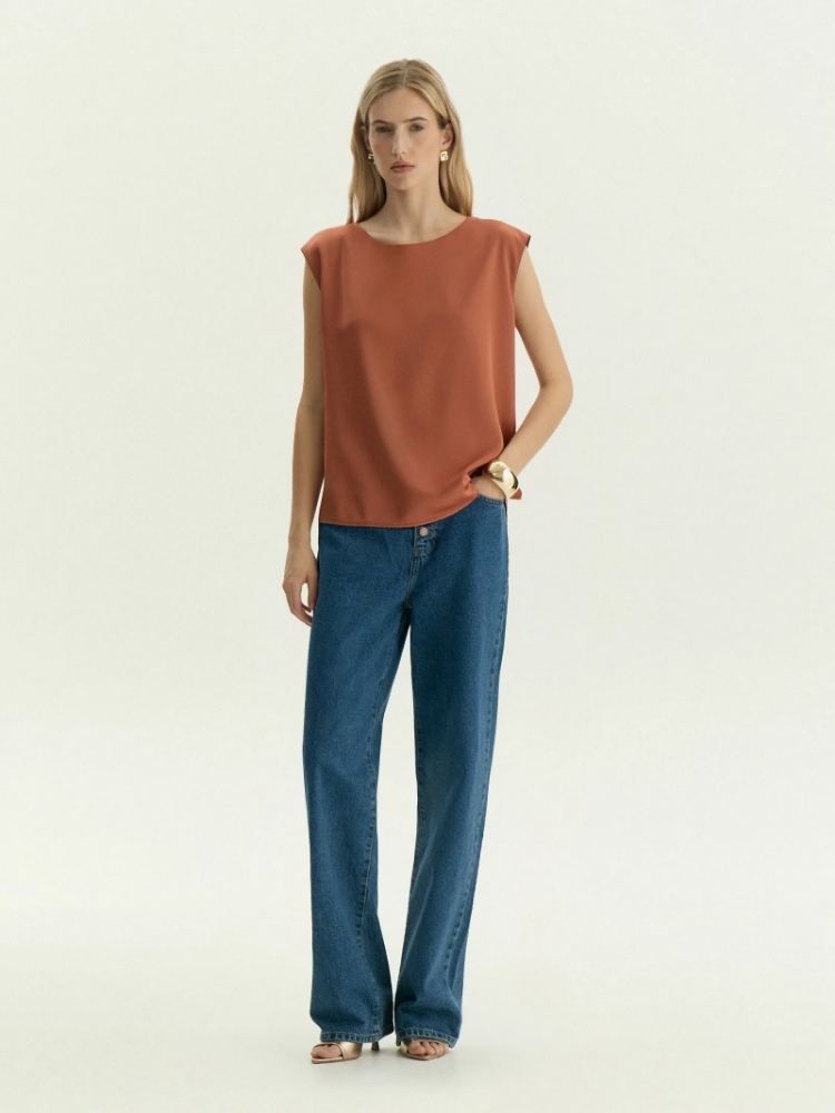 Топ в согревающем цвете между терракотовым и апельсиновым. Удобная модель без рукавов идеальна под жакеты. Прямой силуэт подойдёт любому типу фигуры. Топ станет лаконичным дополнением деловых и ежедневных образов. Выполнен без подкладки