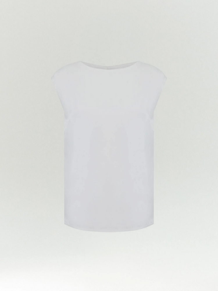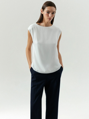 Базовая блуза в белом цвете сделана из приятного к телу, мягкого и шелковистого вискозного сатина. Топ без рукавов со спущенным плечом слегка прикрывает верхнюю часть руки и закрывает грудь, горловина подходит к ярёмной впадине. Удлинённая модель прямого кроя удобна для образов с жакетами, сочетается с базовым и с нарядным низом. Отлично садится на любую фигуру. Изделие выполнено на подкладке из вискозы