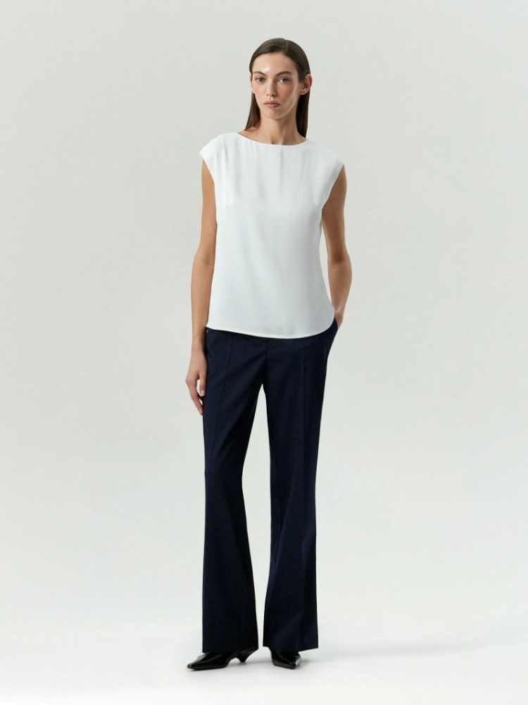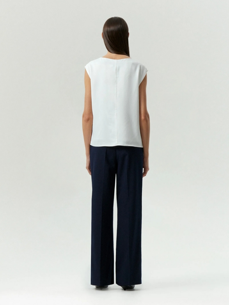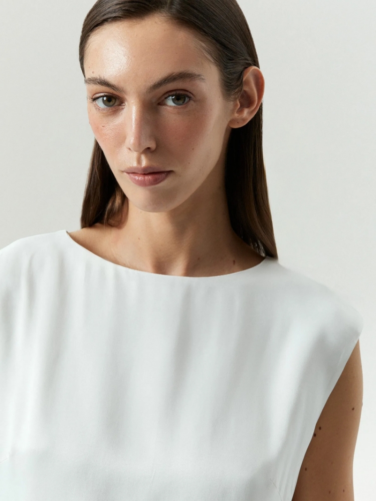 Базовая блуза в белом цвете сделана из приятного к телу, мягкого и шелковистого вискозного сатина. Топ без рукавов со спущенным плечом слегка прикрывает верхнюю часть руки и закрывает грудь, горловина подходит к ярёмной впадине. Удлинённая модель прямого кроя удобна для образов с жакетами, сочетается с базовым и с нарядным низом. Отлично садится на любую фигуру. Изделие выполнено на подкладке из вискозы