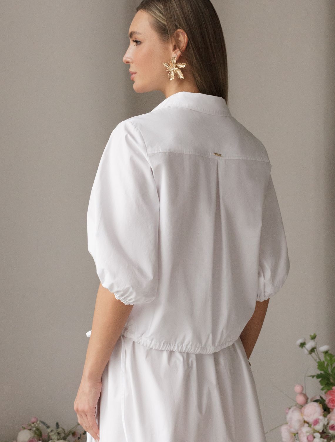 Укороченная блузка с пышными рукавами-фонариками выполнена из легкого хлопкового поплина. Супатная застежка на пуговицы из натурального перламутра. Внизу кулиса с лентами из основного полотна. В изделии будет комфортно, даже в самое жаркое время года. Подходит для любой фигуры. Сочетается в костюме с кюлотами D24.233 и юбкой D26.179 натуральный белый