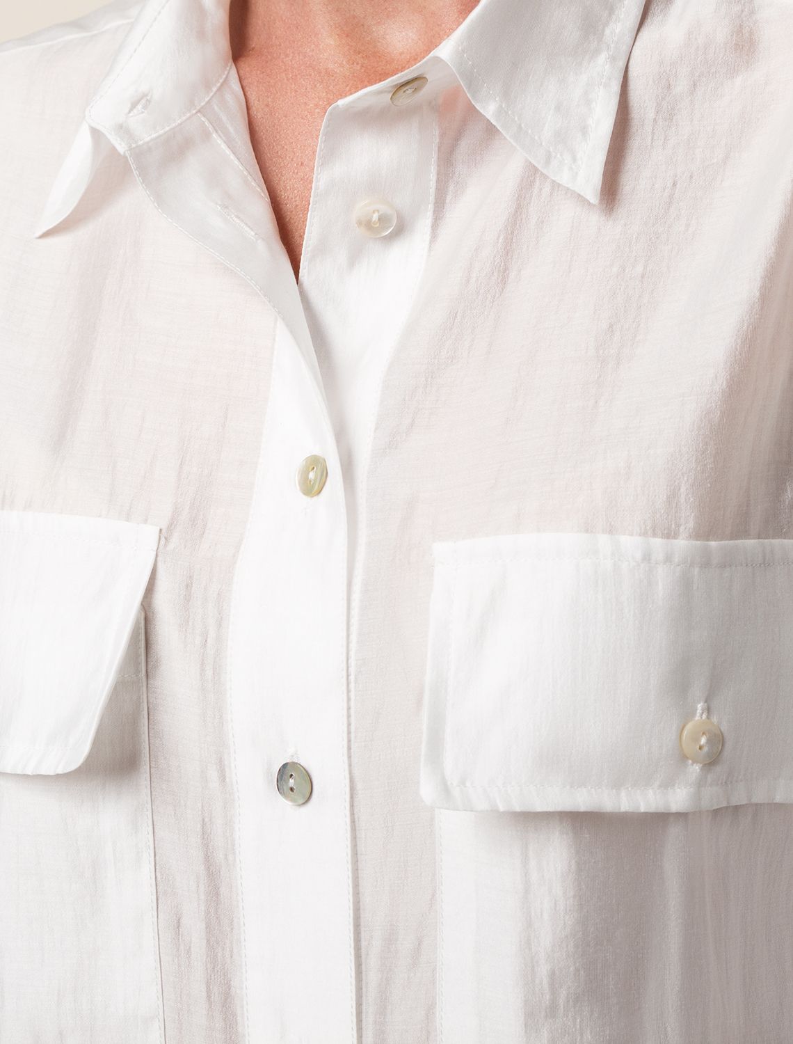 Блузка выполнена из полупрозрачного лиоцелла с эффектом шелка. Легкая и почти невесомая модель, приятно ощущается на теле. Застежка на пуговицы из натурального перламутра, подчеркивает роскошь. белый