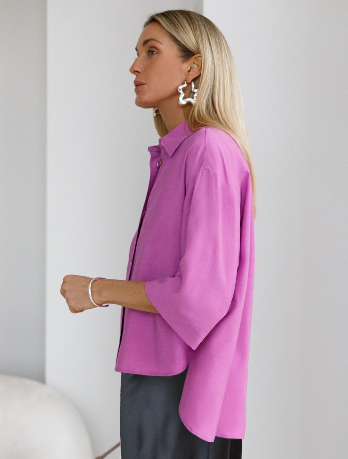 Летящая блузка с отложным воротником выполнена из премиальной вискозы и лиоцелла. Мягкий фактурный материал струится по телу. Вискоза обеспечивает отличную воздухопроницаемость и поддерживает комфортный микроклимат. Модель дополнена пуговицами из натурального перламутра, на спинке изделия металлический логотип бренда. Отлично впишется в нестрогий офисный дресс-код или в расслабленном повседневном образе с джинсами и юбками. фуксия