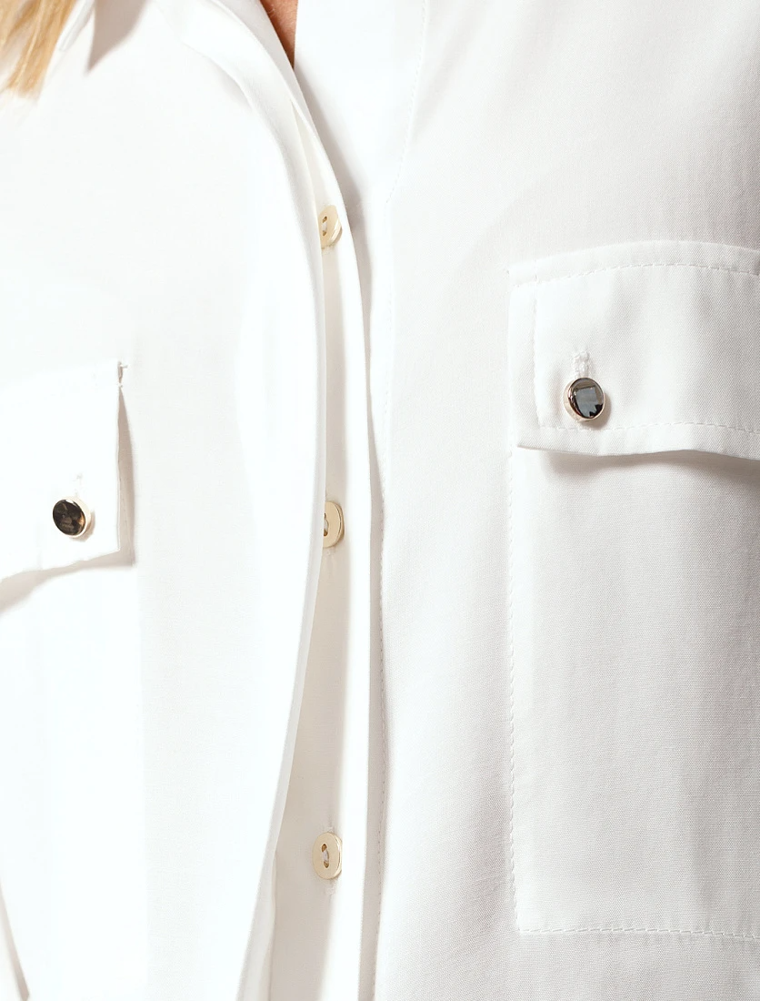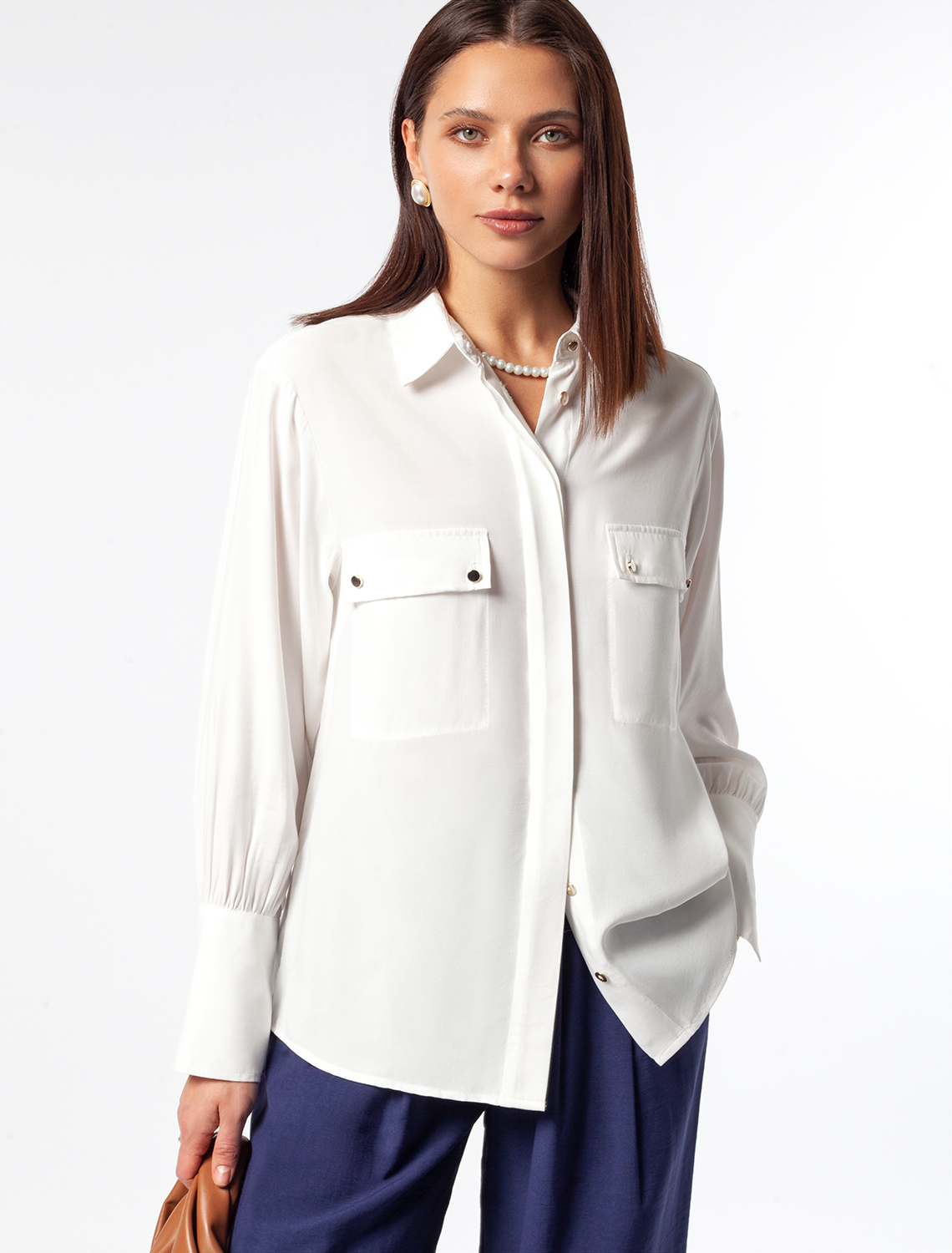 Блузка с имитацией карманов и удлиненными манжетами выполнена из премиальной вискозы и лиоцелла. На спинке изделия фирменный логотип бренда. Имитация карманов позволяет этому элементу выглядеть аккуратно без складок и фалд, которые вероятны на такой пластичной ткани.Застежка на золотистые пуговицы. Приятная на ощупь ткань охлаждает кожу в жаркую погоду. Отлично впишется в нестрогий офисный дресс-код или в расслабленном повседневном образе с джинсами.