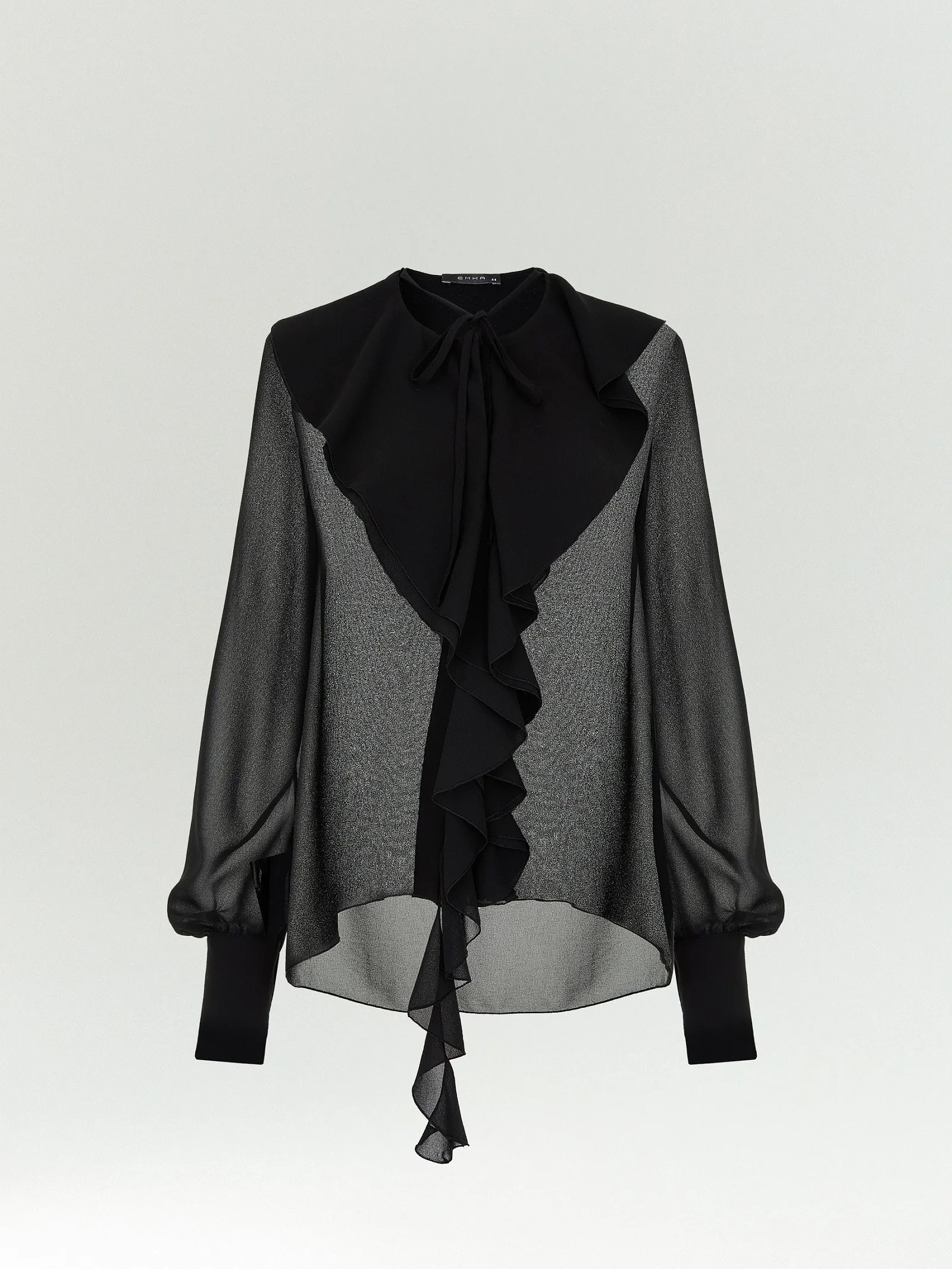 Полупрозрачная блуза из чёрного шифона соединяет в себе романтику и гранж. Асимметрично расположенные длинные воланы делают образ более драматичным, добавляют динамики. Блуза свободно садится, создаёт образ с чувством внутренней свободы. Воздушные рукава красиво драпируются в движении: этот динамичный объем переходит в сужение только у кистей. Рукава завершаются высокими манжетами. Вещь будет сочетаться с любым базовым низом. Отличное решение для коктейльных образов