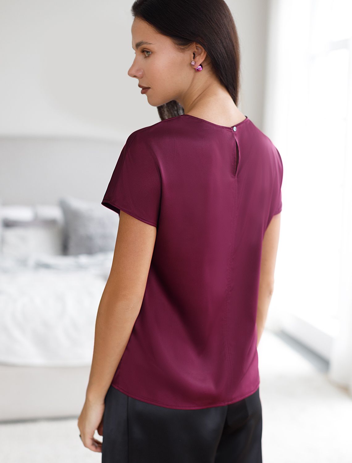 Стильная блузка винного цвета из сатина с удобной застежкой на пуговицу на спинке. Прямой крой и короткий рукав делают модель универсальной для любого сезона. Благородный блеск ткани подчеркивает элегантность, а удобная посадка обеспечивает комфорт. Благодаря эластану в составе ткань сохраняет первозданный вид, не образуя заломов. Ваш образ будет безупречен весь день! Блузка легко комбинируется с деловой одеждой и casual-вещами, подходит для разных случаев.