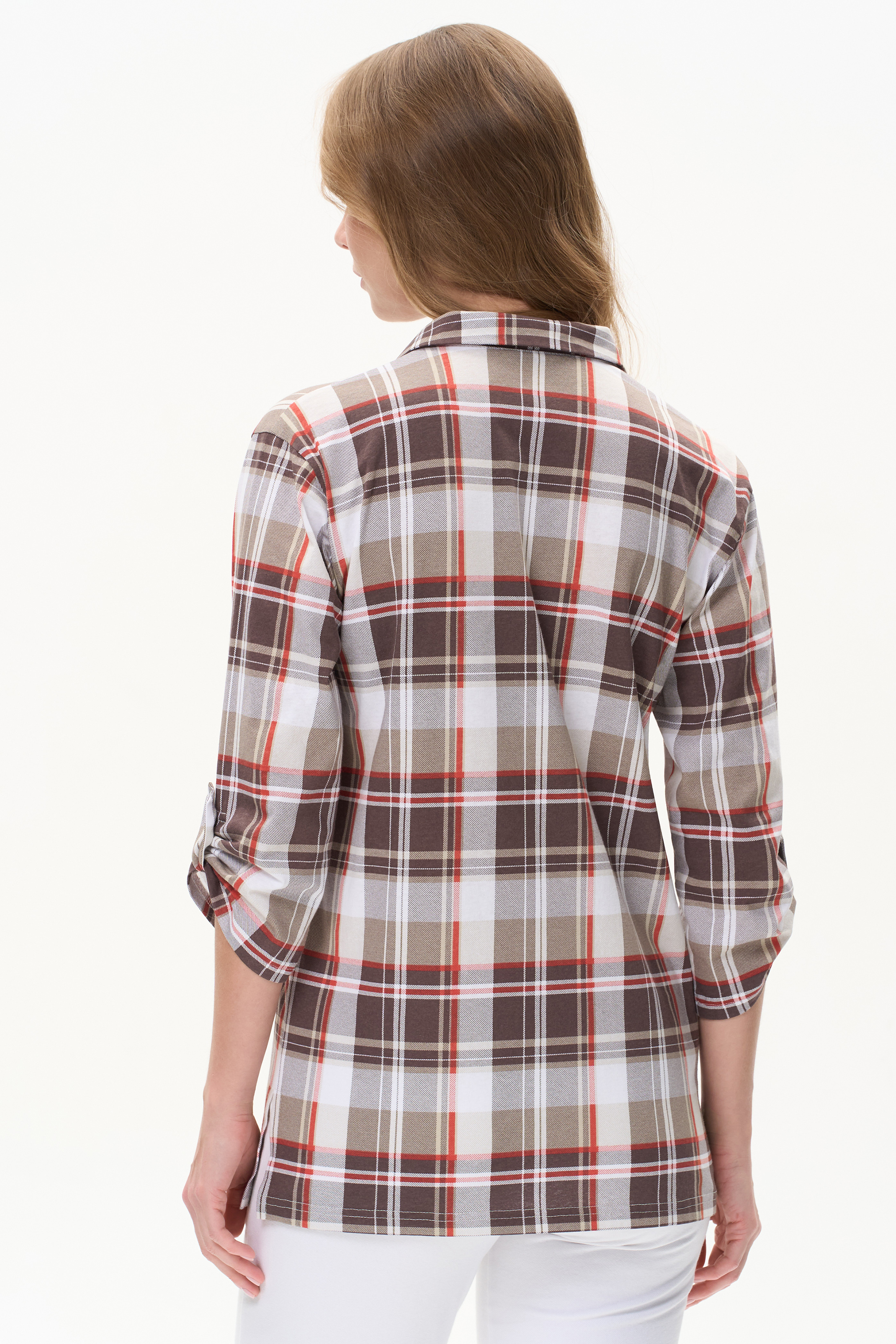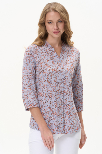 Рубашка прямого силуэта с отложным воротником из хлопкового полотна. Застежка на пуговицы. Накладной карман, по низу разрезы в боковых швах. Втачные рукава 3/4 с патами и пуговицами.Рост модели 175 см.