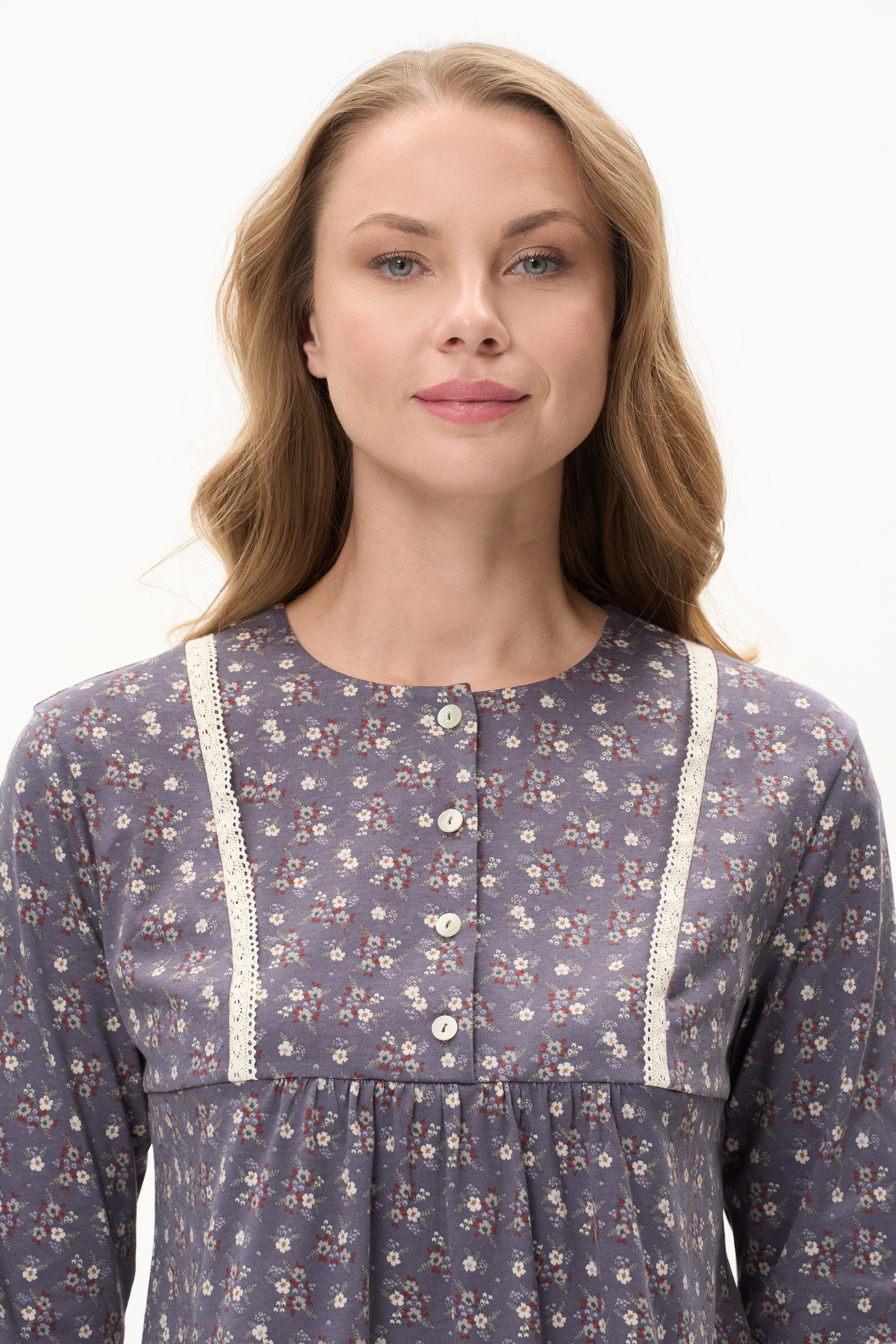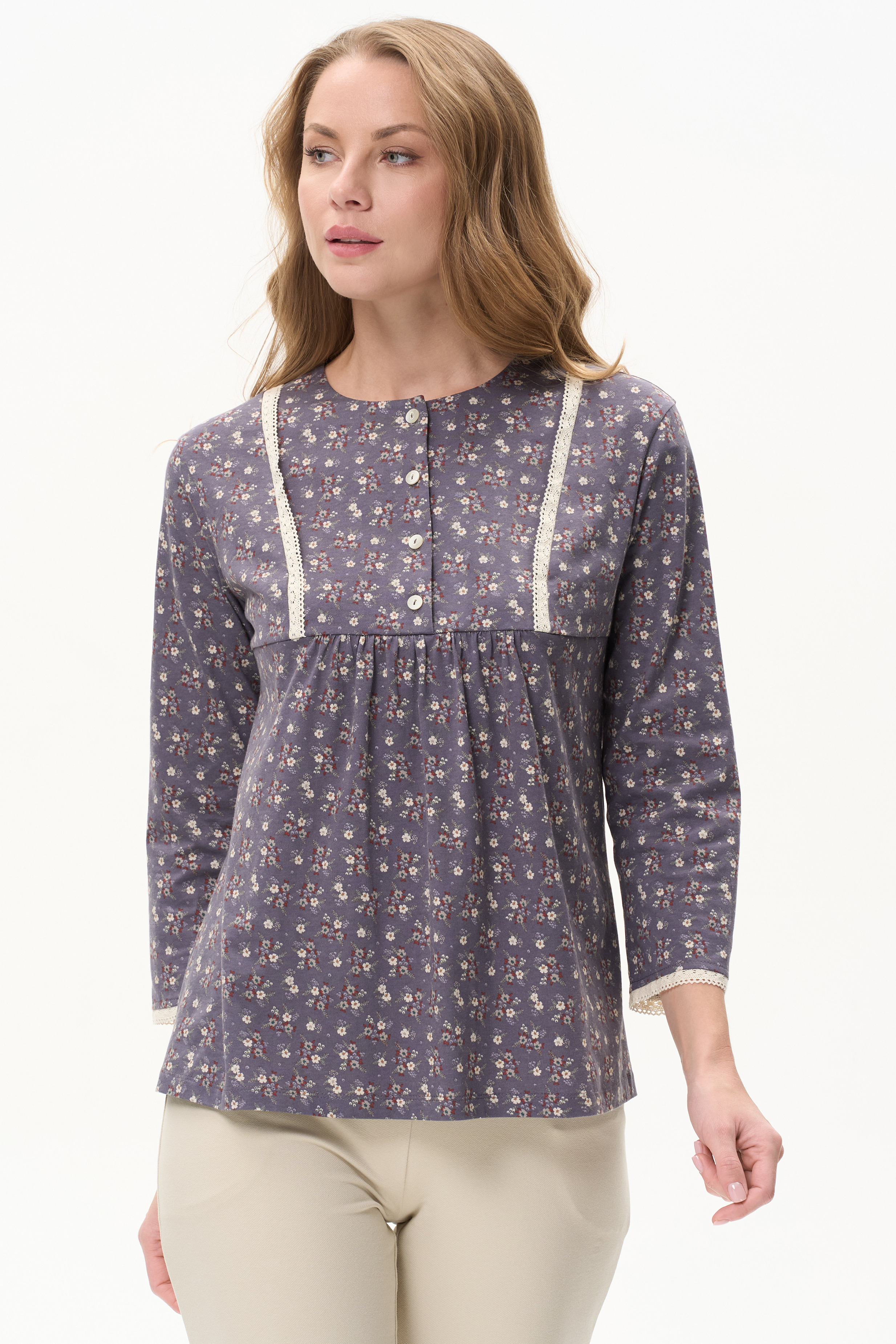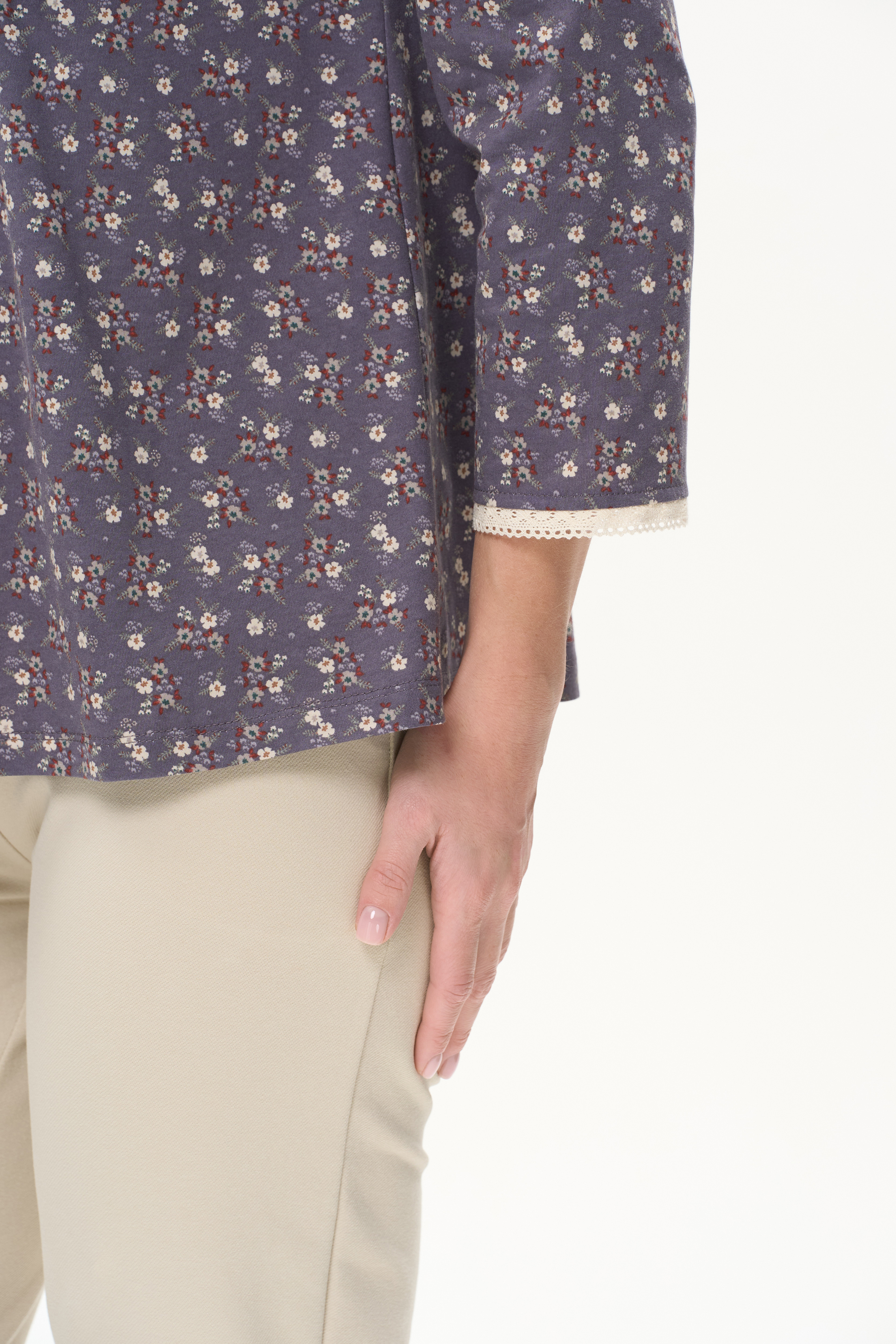 100% хлопок Блузка из кулирки качества ПЕ 145 гр. Модель свободная, слегка расширенного силуэта, круглый вырез горловины, планка с застежкой на четыре пуговицы, свободные втачные рукава длиной 3/4. Отделка хлопковым кружевом - трендовая нотка этой модели. Женственная блузка на любой случай, подходит для города, дома и отдыха. Рост модели 175 см.