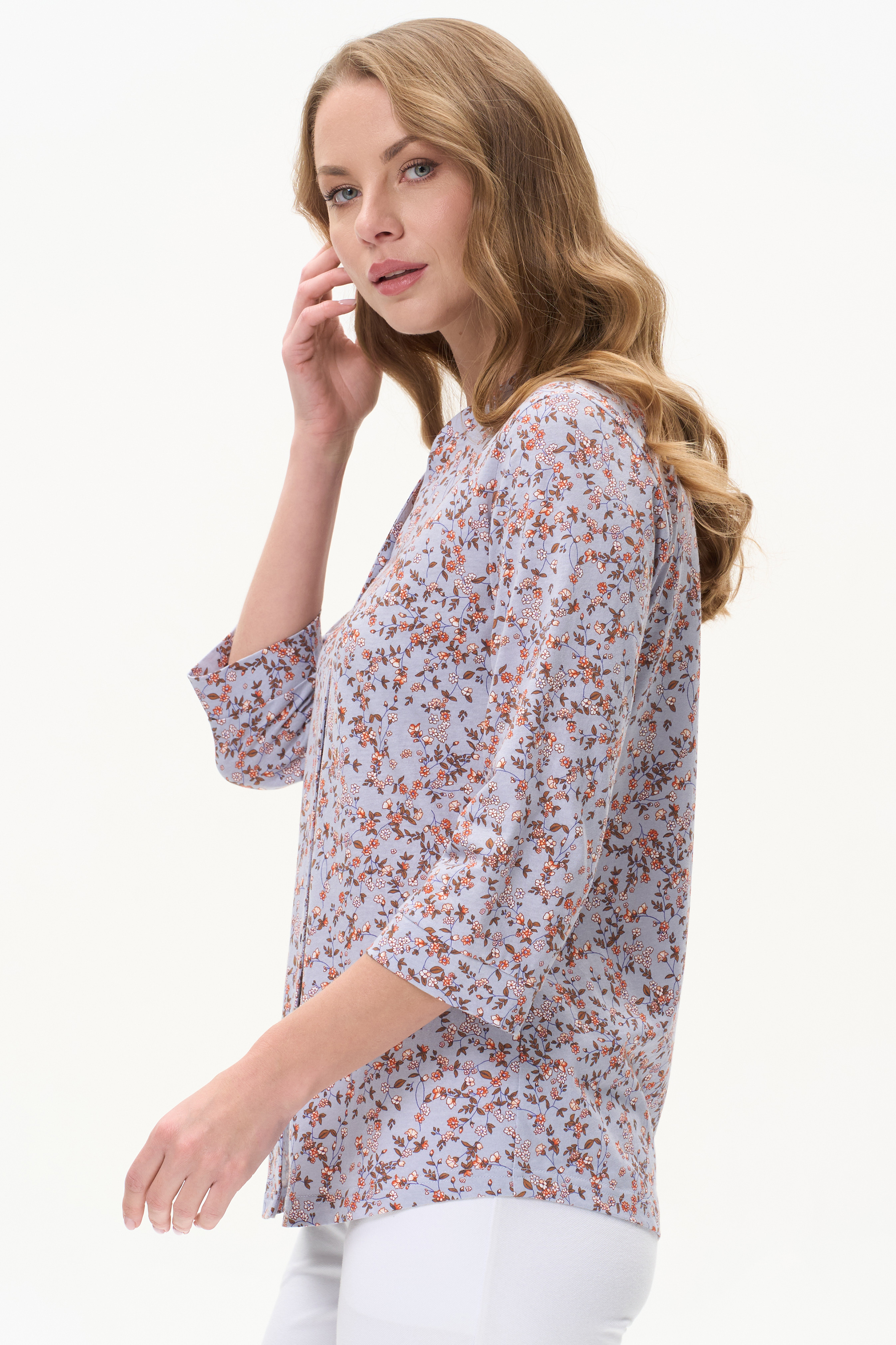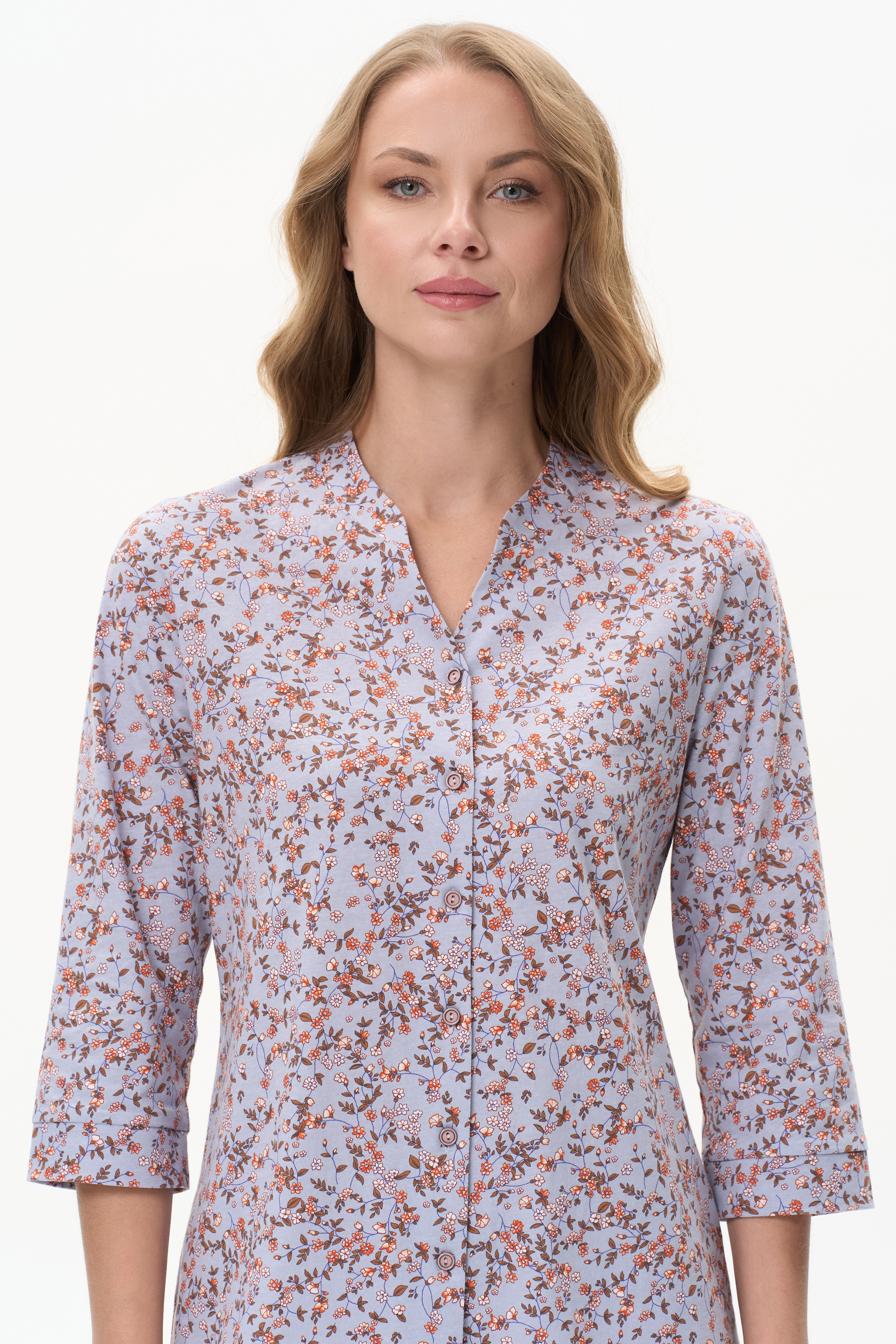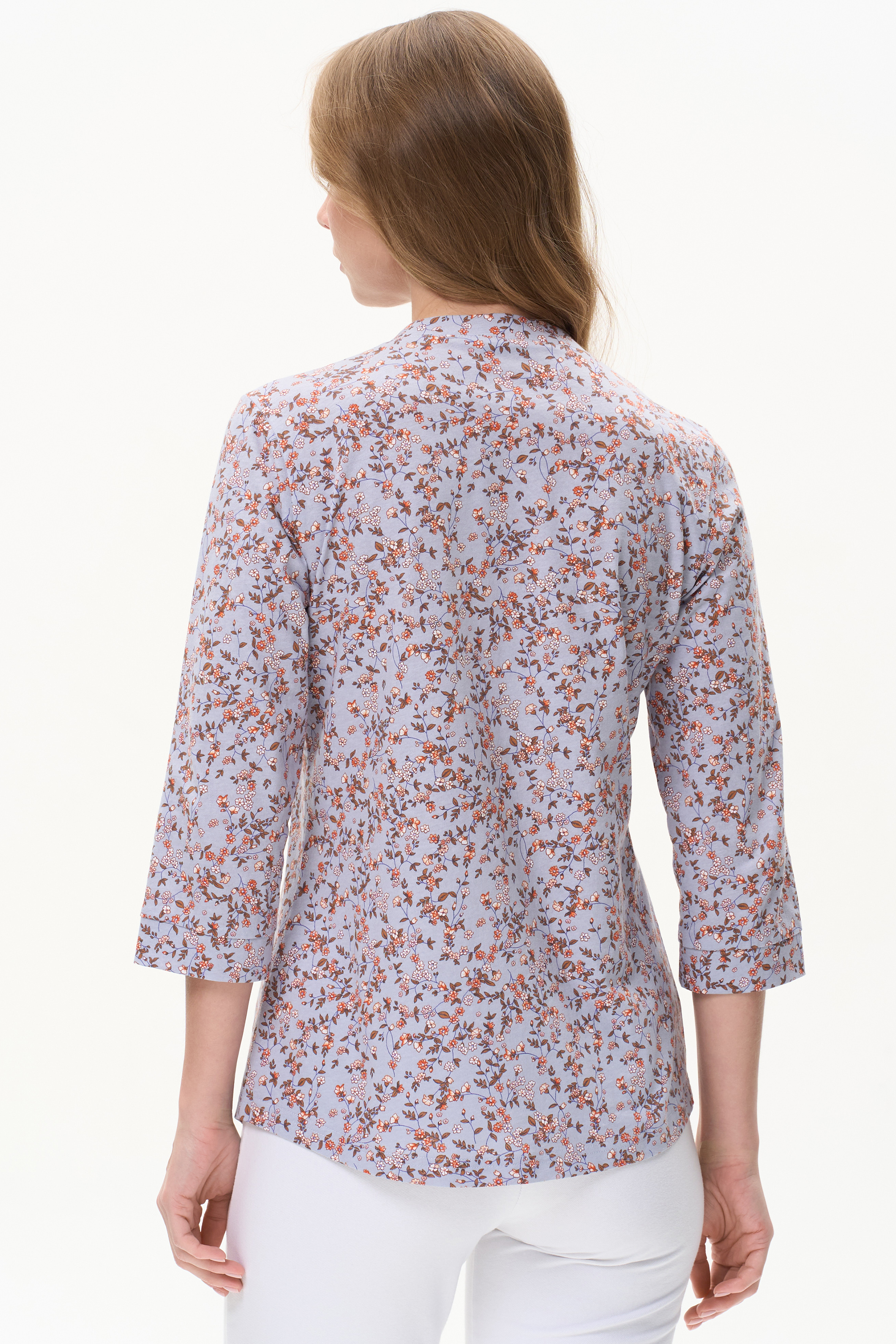 Блузка прямого силуэта из хлопкового полотна. Воротник стойка, переходящий в планку, застежка на пуговицы. Втачной рукав 7/8. Рост модели 175 см.