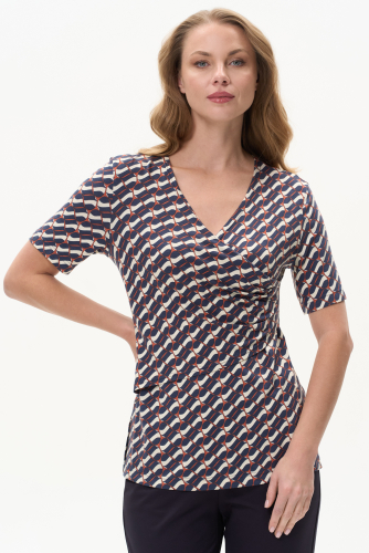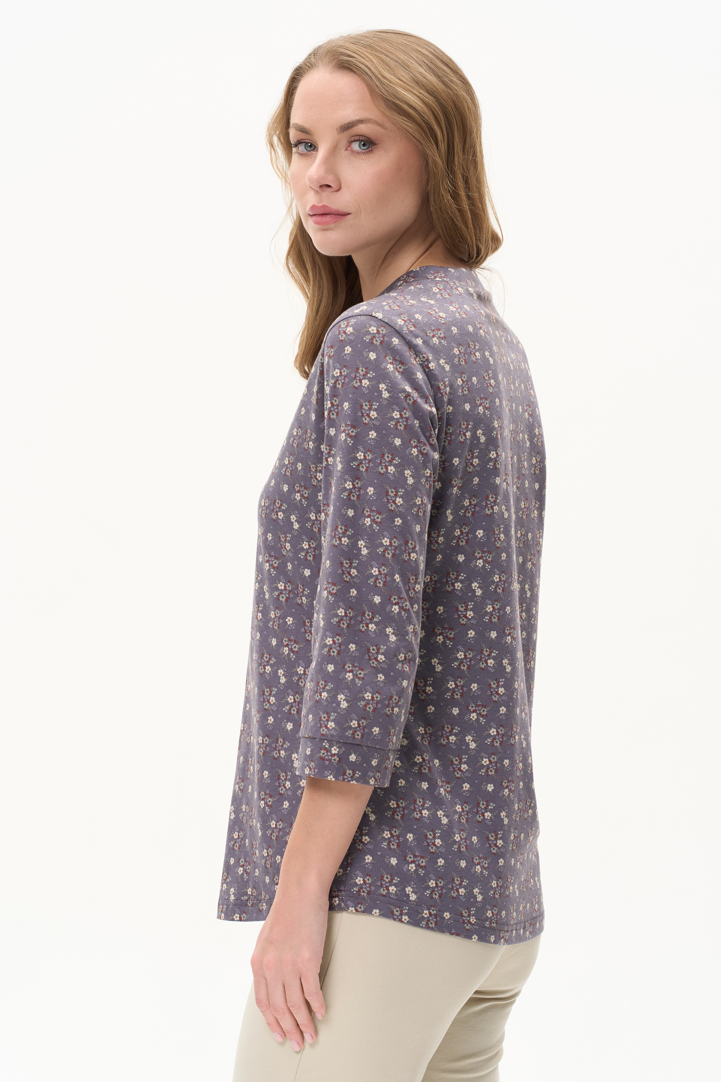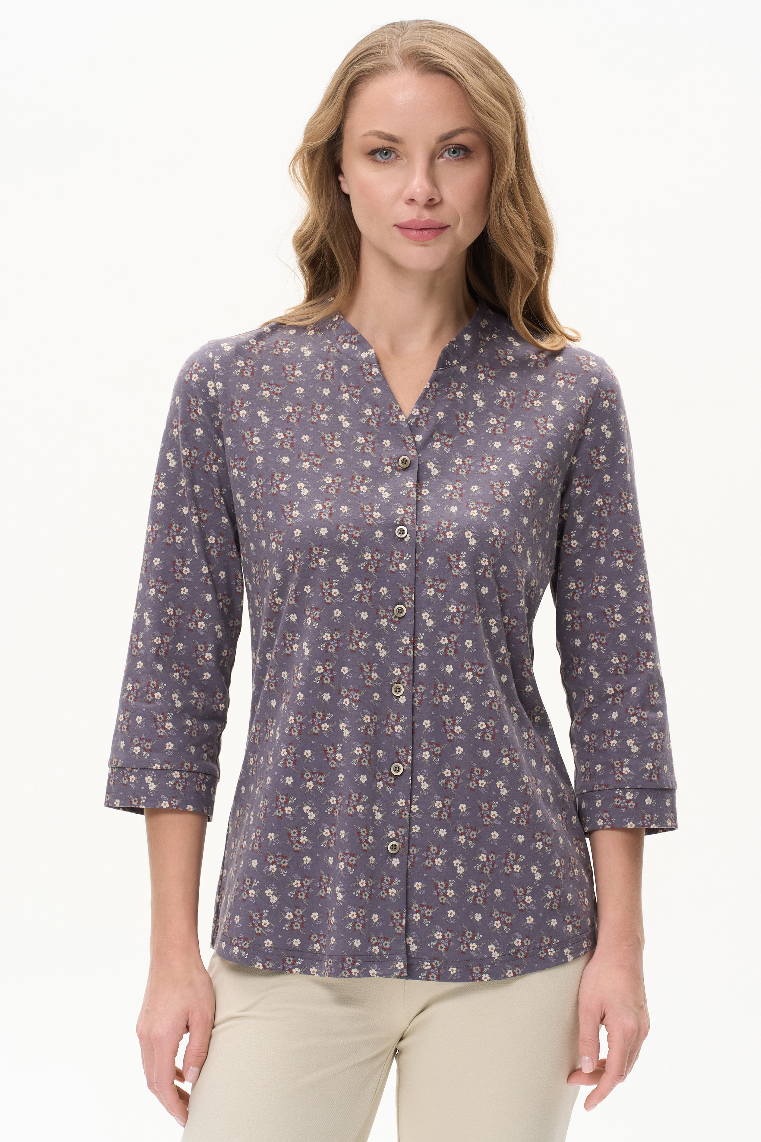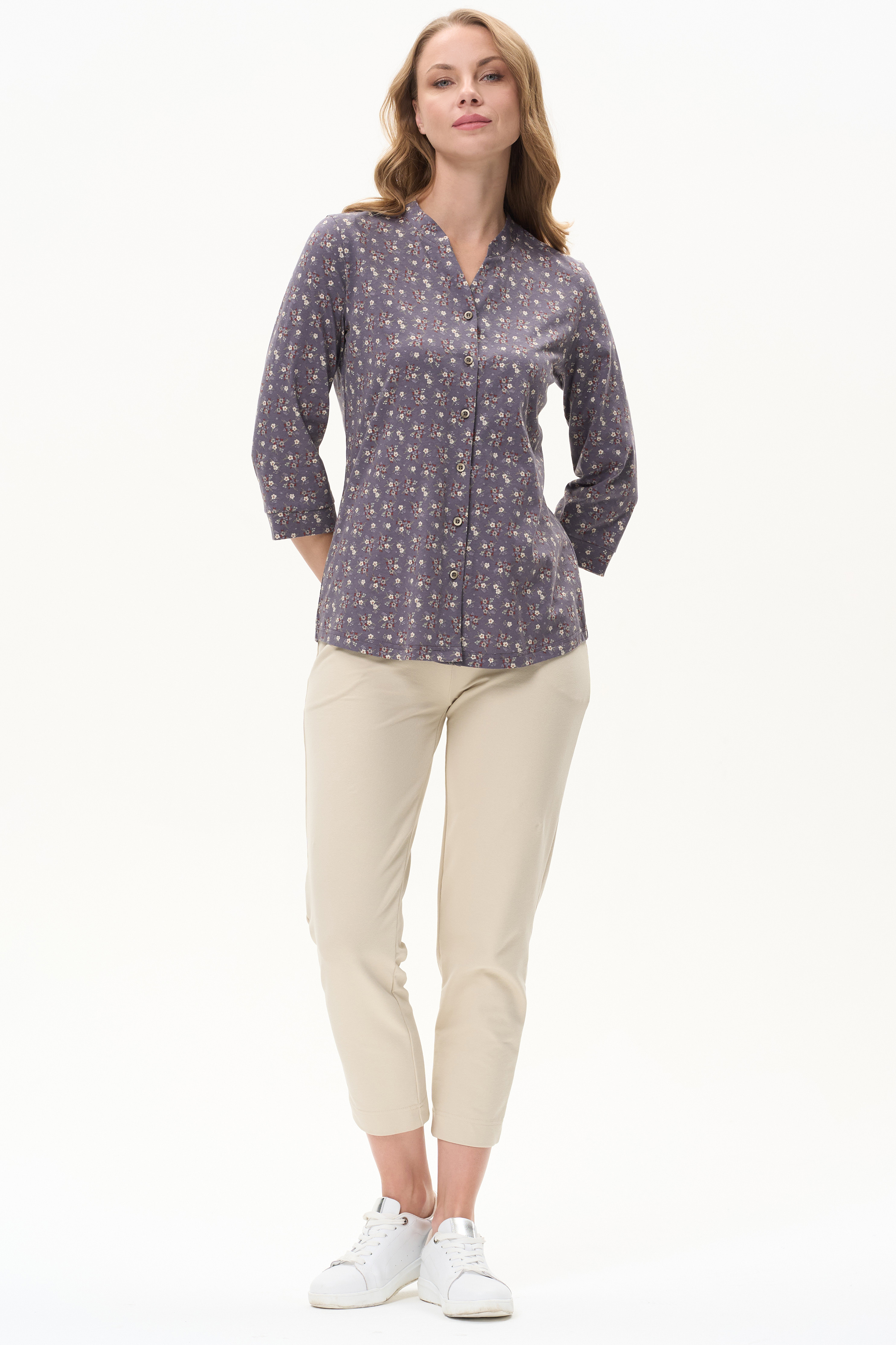 Блузка прямого силуэта из хлопкового полотна. Воротник стойка, переходящий в планку, застежка на пуговицы. Втачной рукав 7/8. Рост модели 175 см.