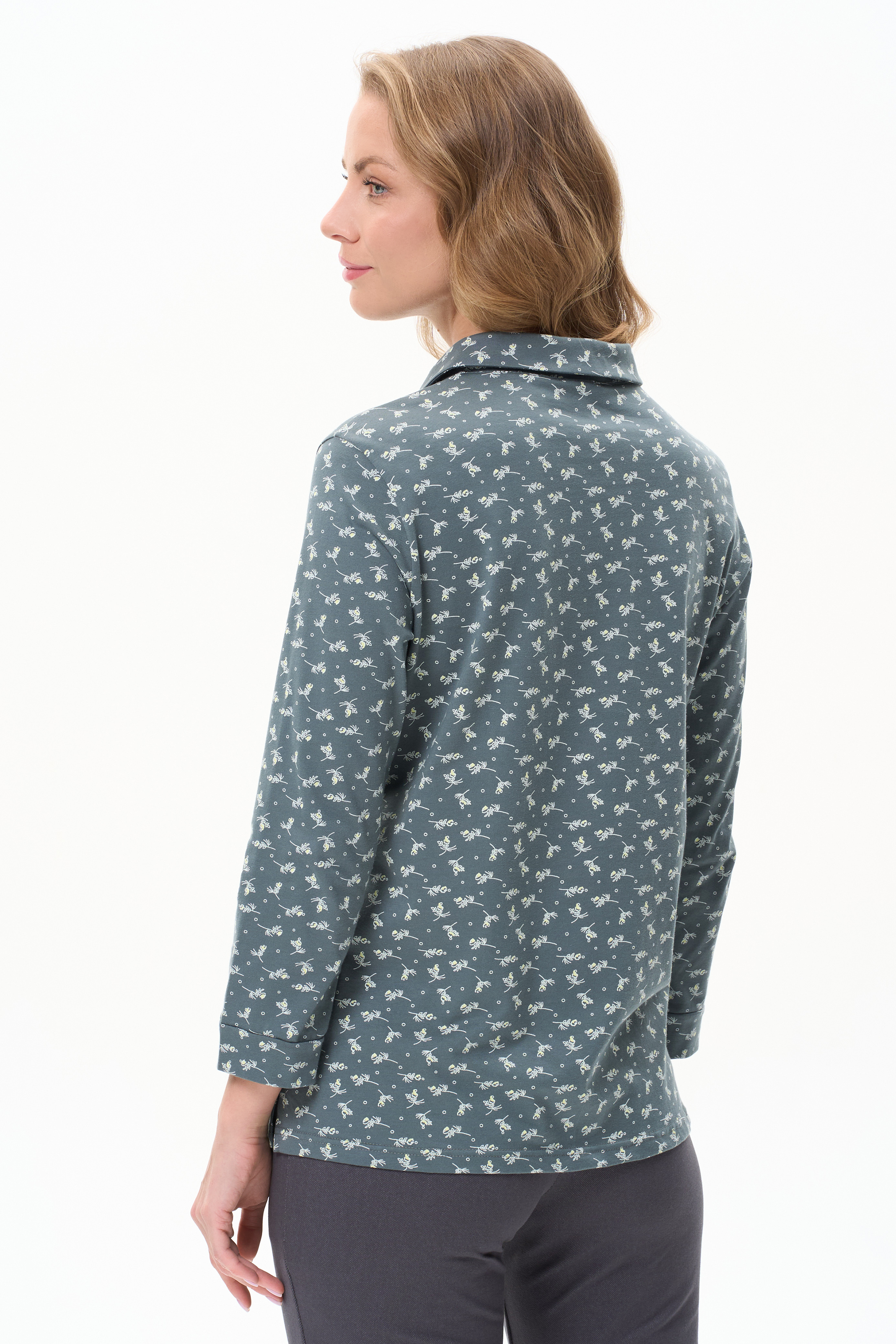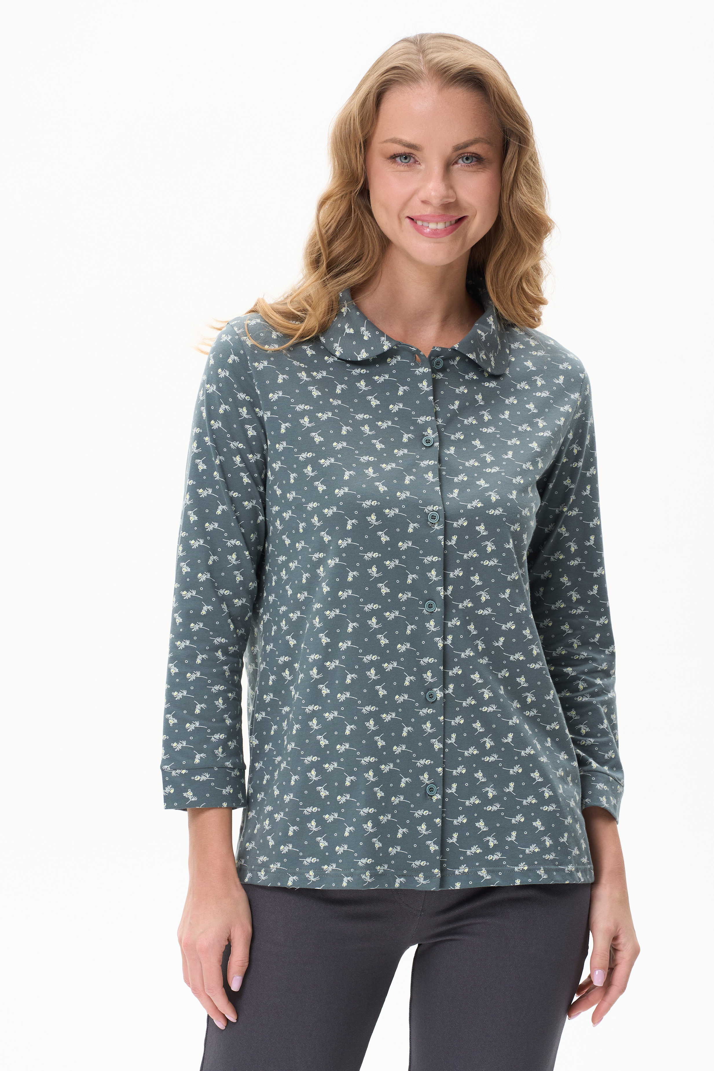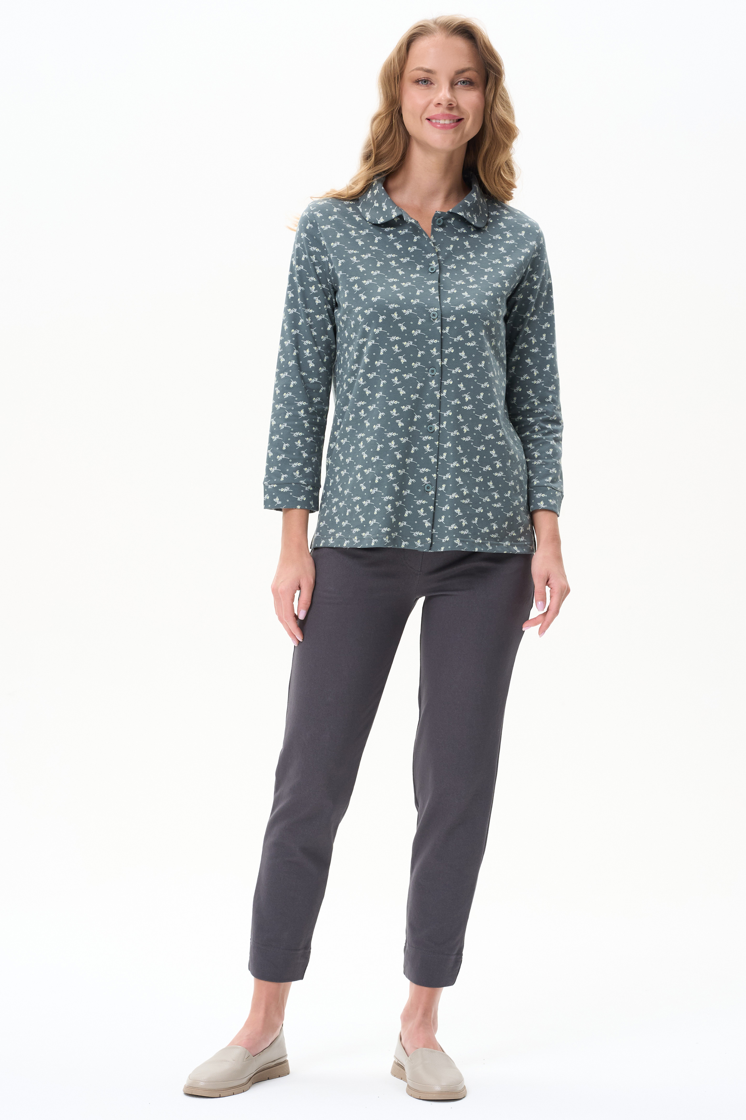 Блузка прямого силуэта из хлопкового трикотажного полотна. Отложной воротник, застежка на пуговицы. Укороченные втачные рукава с манжетами. Рост модели 175 см.