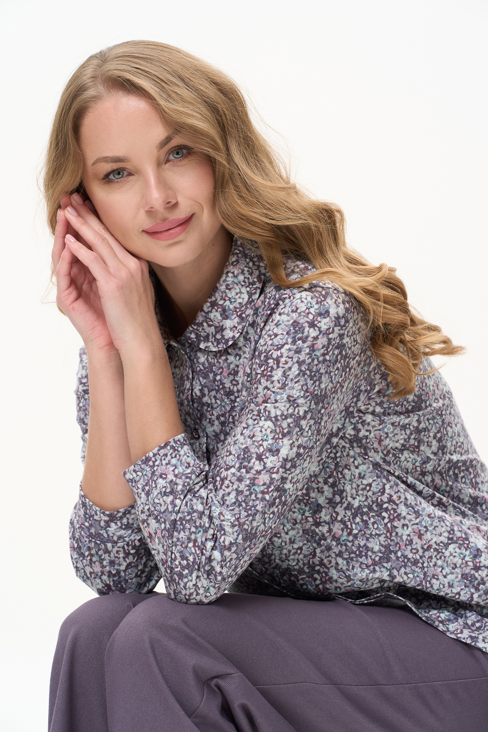 Блузка прямого силуэта из хлопкового трикотажного полотна. Отложной воротник, застежка на пуговицы. Укороченные втачные рукава, манжеты из трикотажного полотна рибана. Рост модели 175 см.
