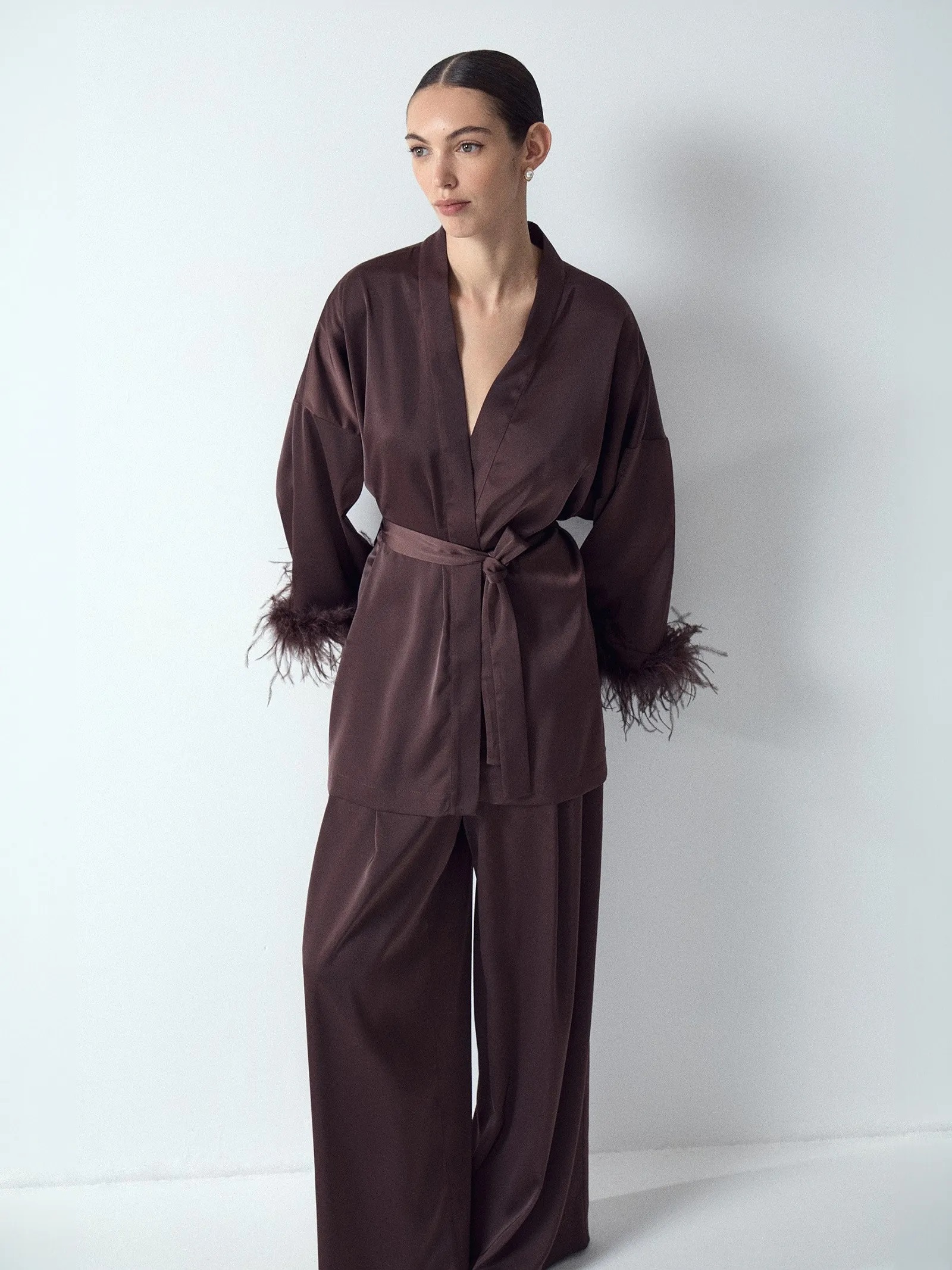 Блуза-пеньюар с поясом дополнена съемными перьями на рукавах. Они создают настроение праздника и радуют нежными прикосновениями к коже. Декор крепится на пуговицах с потайными шлевками: если снять перья, места крепления абсолютно незаметны. Ткань с содержанием вискозы приятна на ощупь, красиво струится и играет. Роскошный цвет горького шоколада с бордовым отливом добавляет образу глубины. В комплекте с брюками и топом из комплекта получится шикарный монохромный образ, который не останется незамеченным