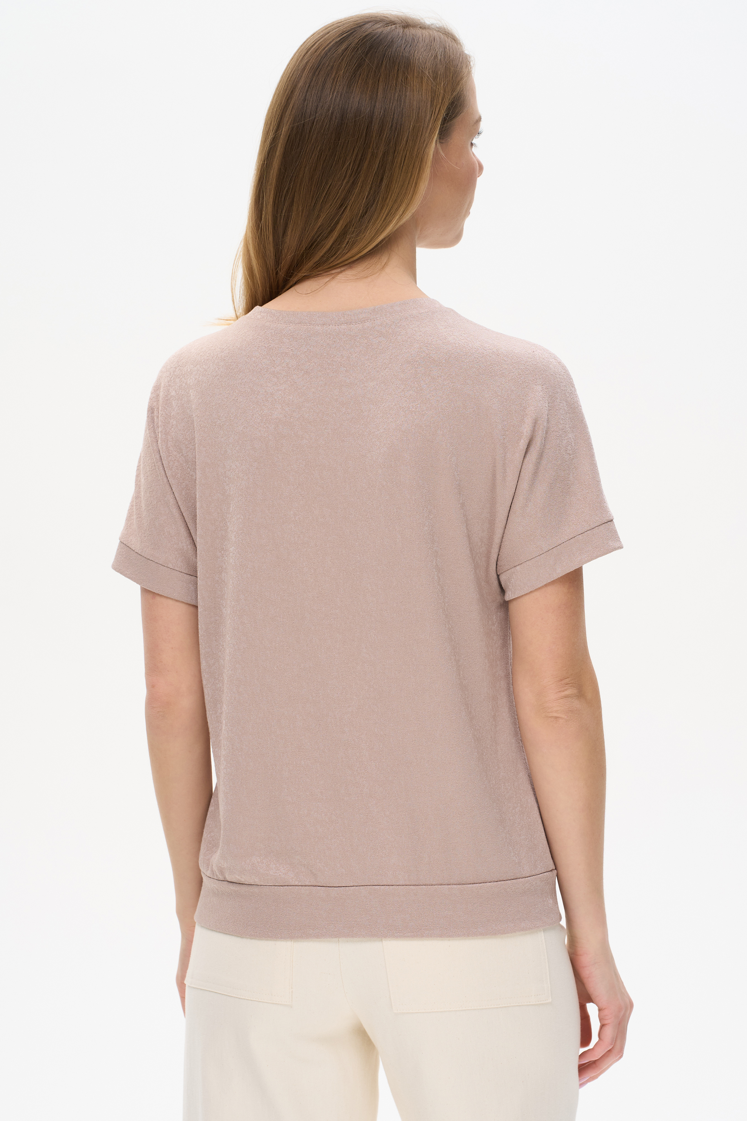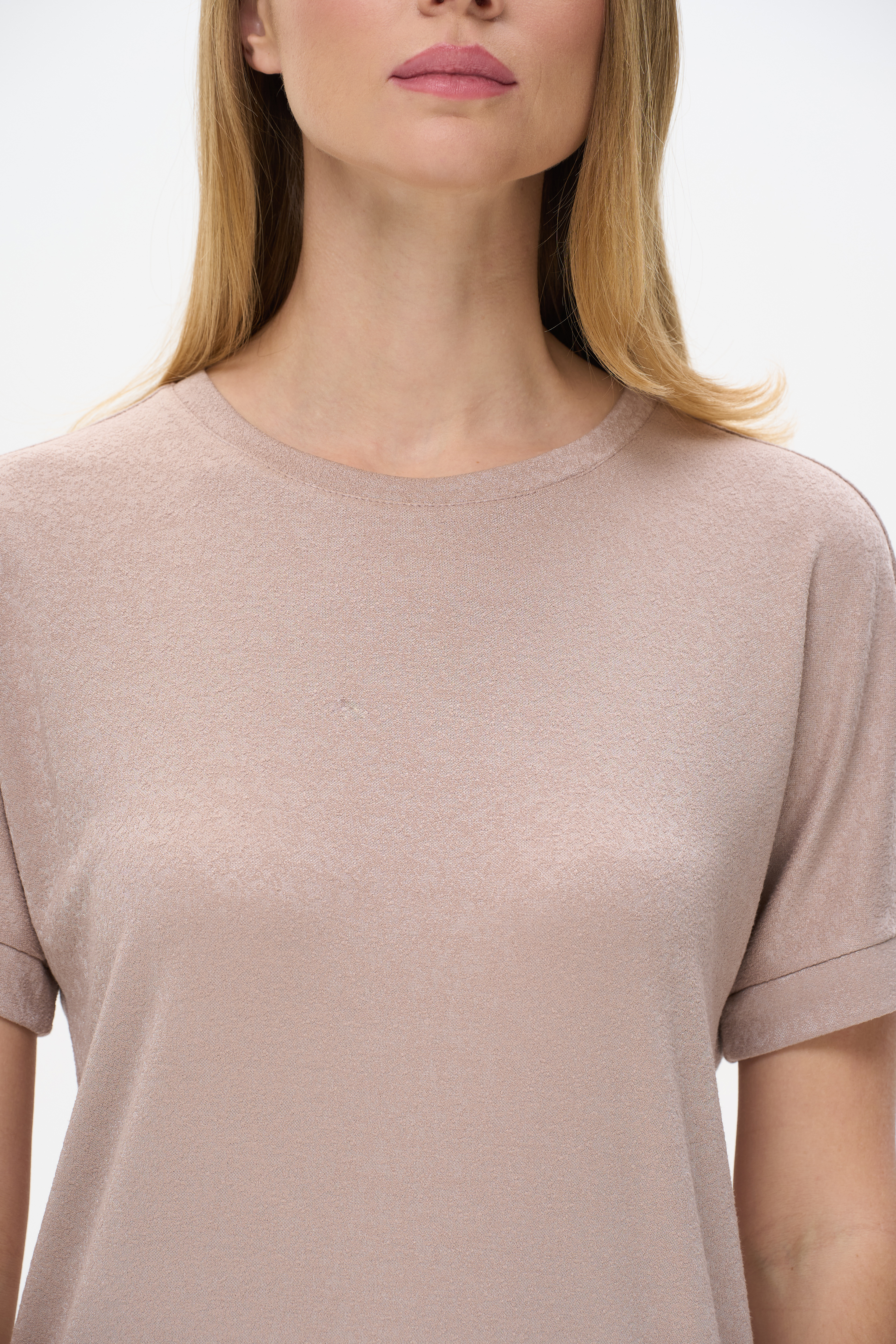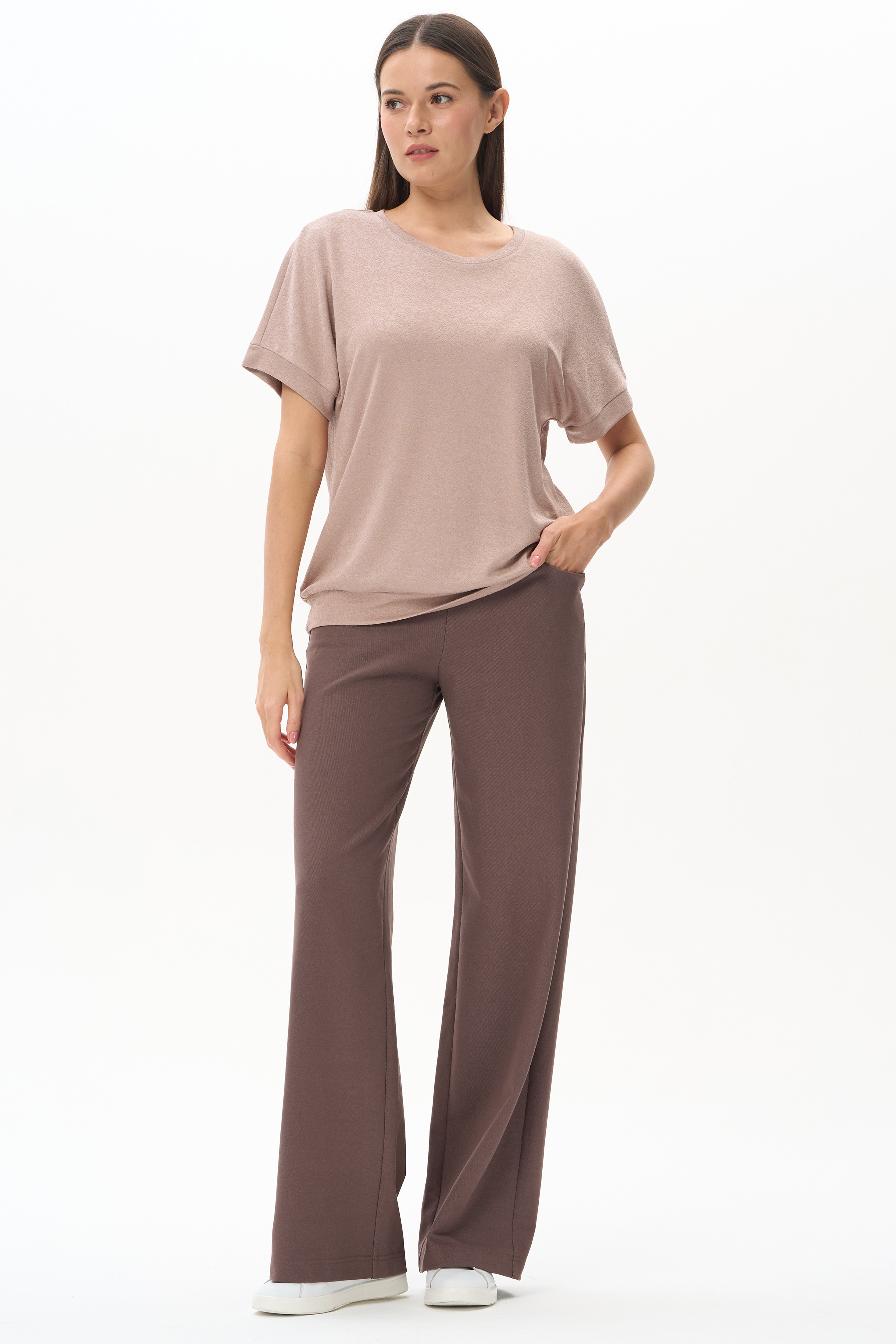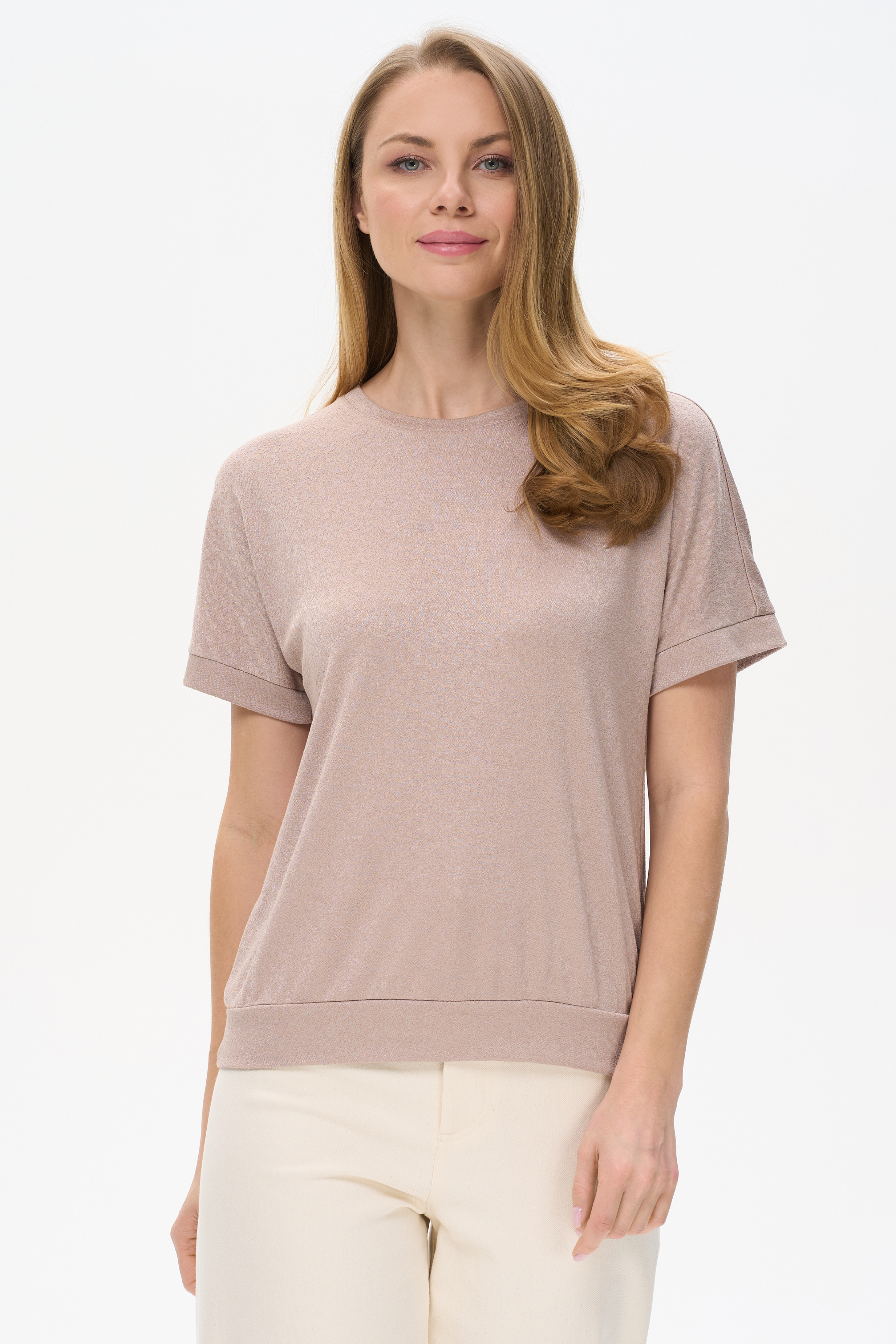 Блузка свободного силуэта из вискозного трикотажного полотна с эффектом 3D. Круглый вырез горловины, цельнокроеные короткие рукава с манжетами, по низу изделия - манжет. Рост модели 175 см.