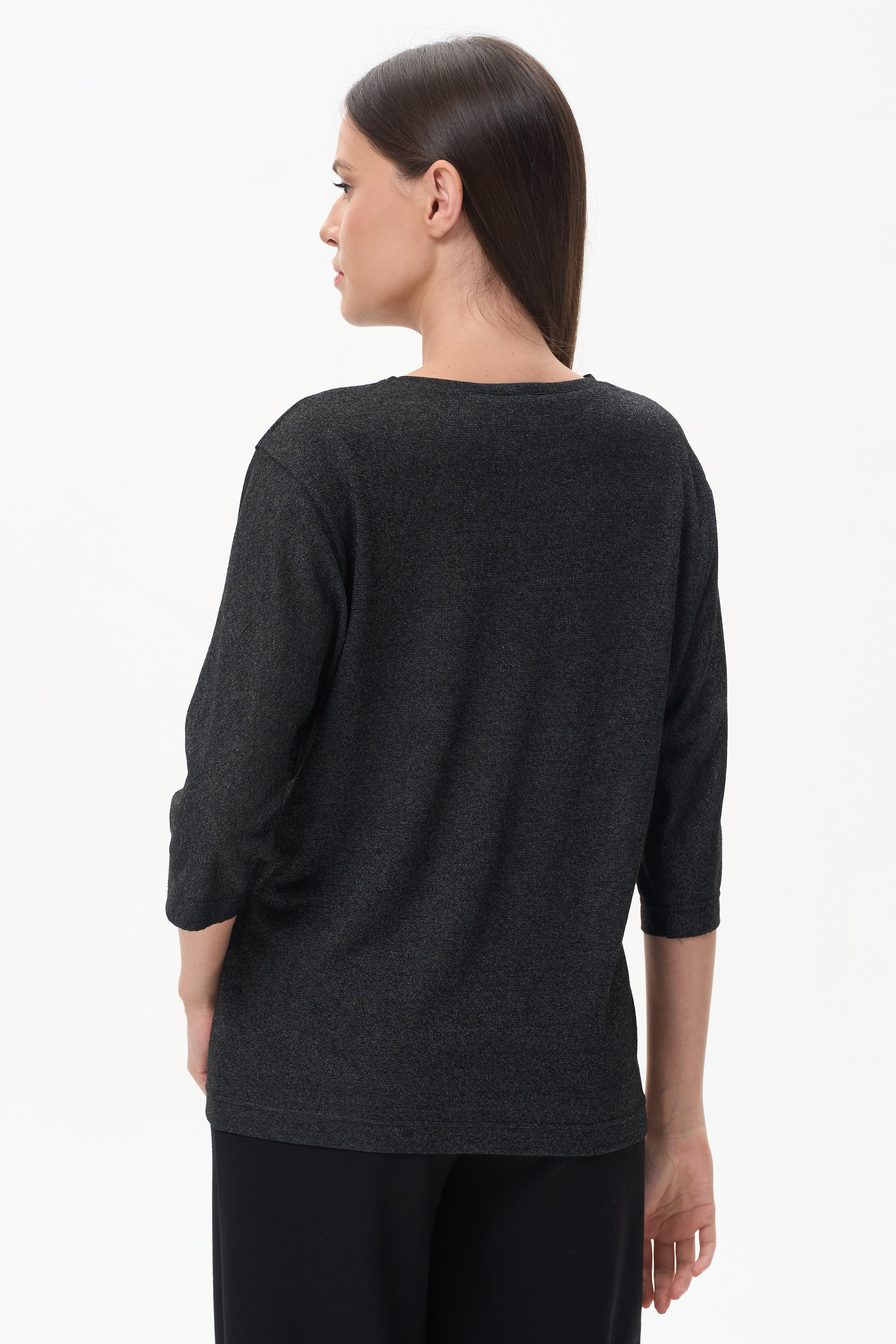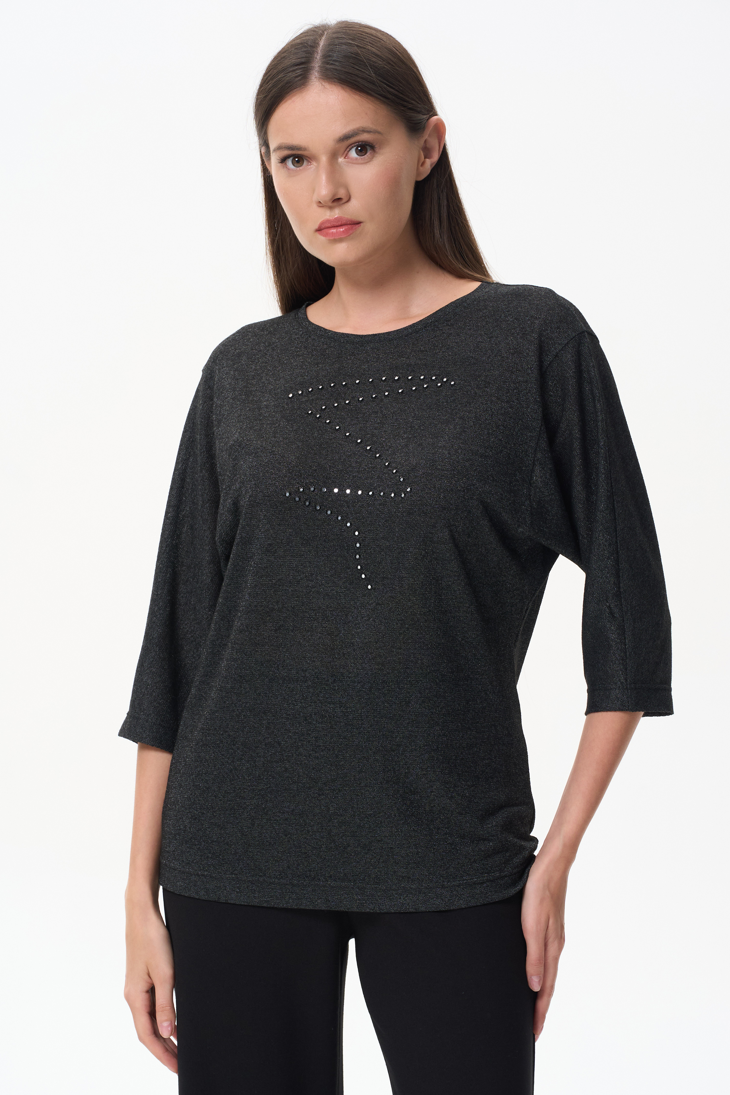 Нарядная свободная блузка из тонкого трикотажа с серебристым блеском. Рукава летучая мышь длиной 3/4, округлый вырез горловины, на полочке дизайнерский рисунок из чёрных страз. Блузка полупрозрачная с трендовым метализированным эффектом.