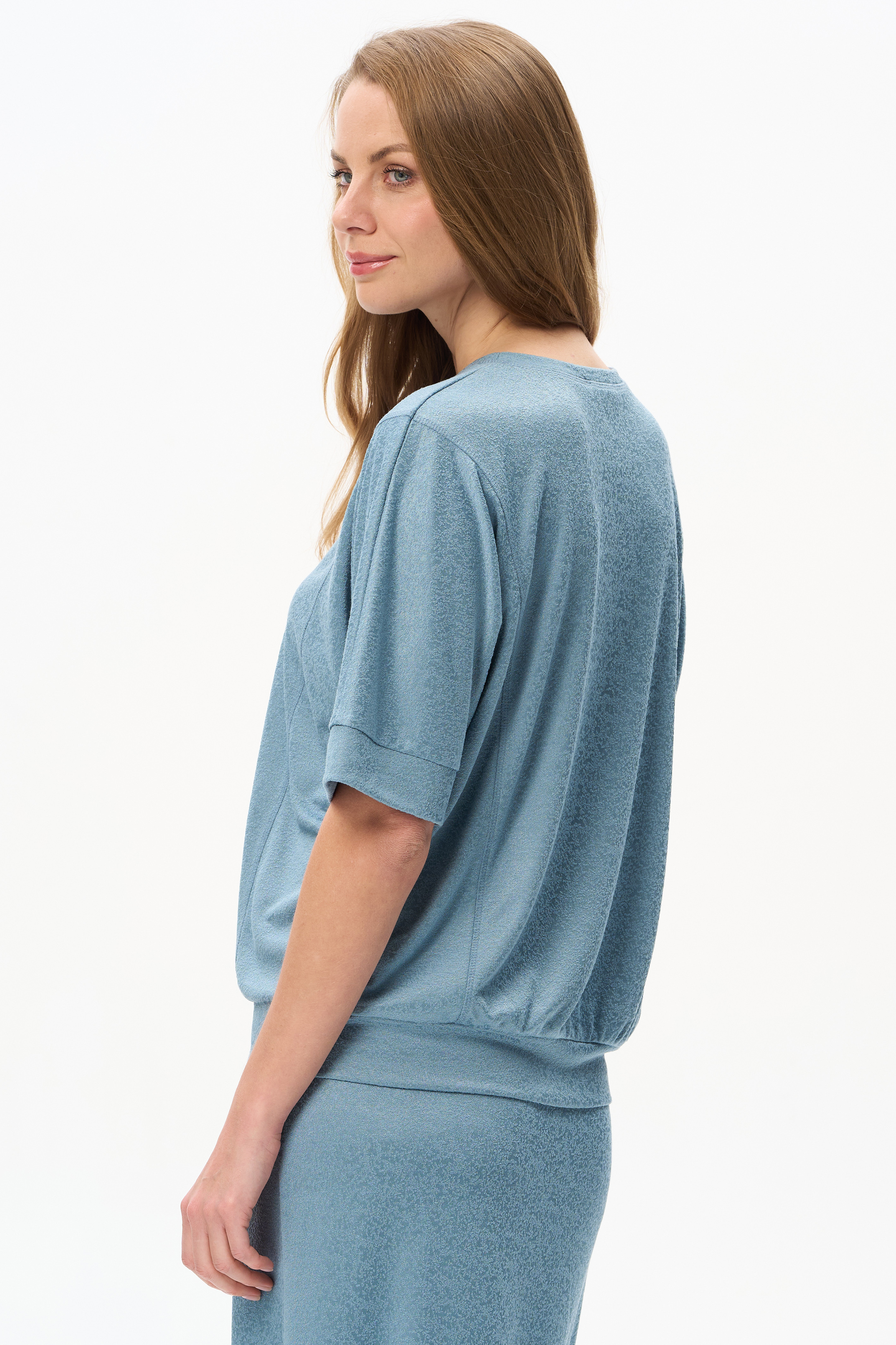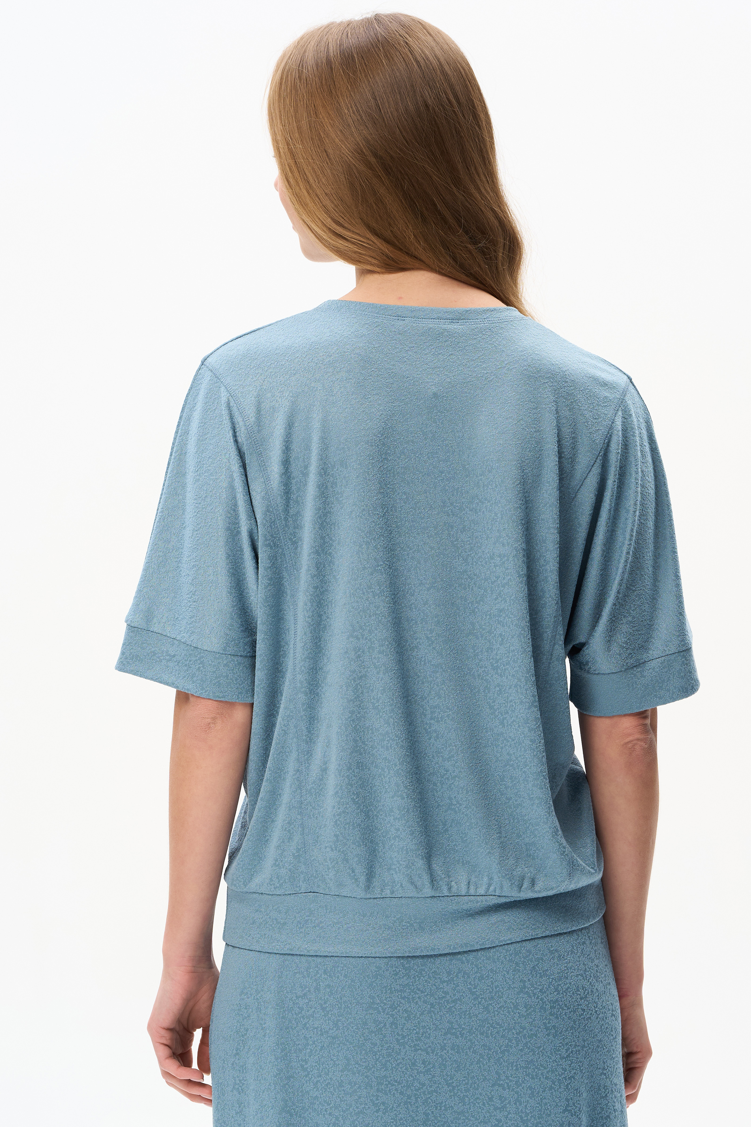80% вискоза/ 15% полиэстер/ 5% эластан Джемпер из вискозного жаккарда 230 гр с красивой фактурой и благородным блеском. Модель с цельнокроенными рукавами длиной до локтя и широкой планкой по низу рукавов. По рельефам - отделочная строчка в цвет полотна. Джемпер на планке по низу изделия для комфортной посадки.Идеально сочетается с юбкой из жаккарда. Рост модели 175 см
