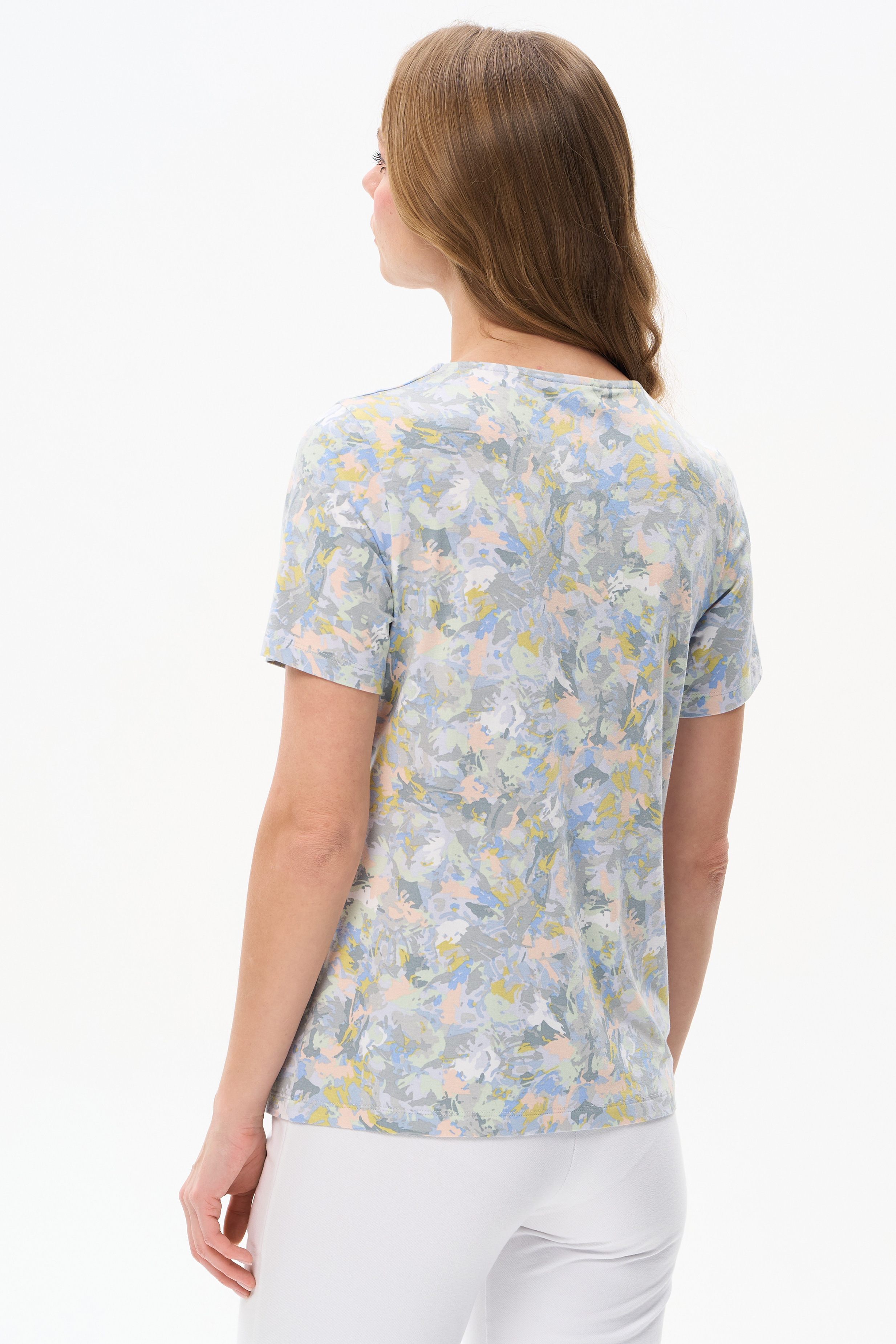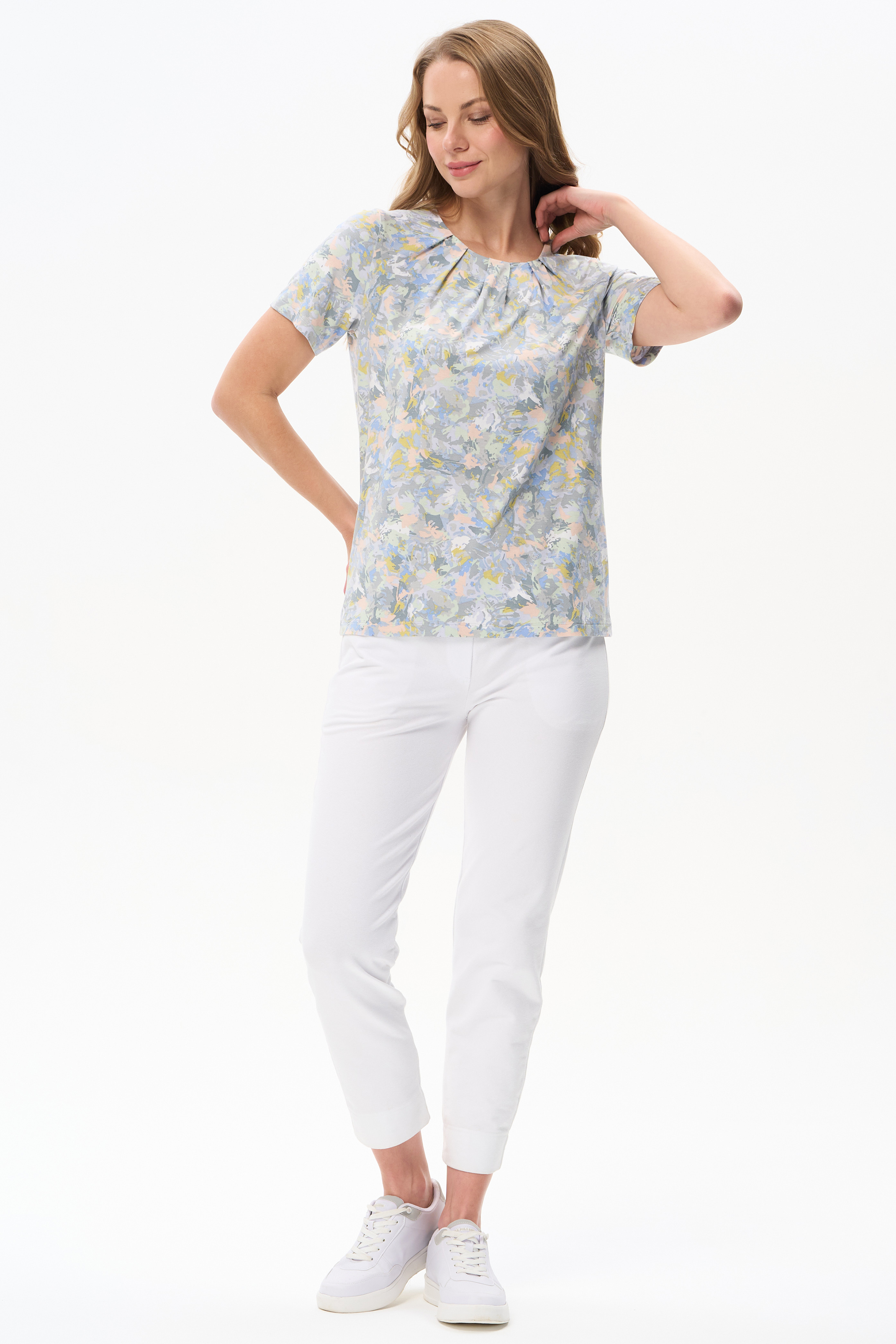 92% вискоза, 8% эластан Блузка из вискозного полотна. Модель с округлой горловиной и мягкими складками. Втачные короткие рукава. Рост модели 175 см.