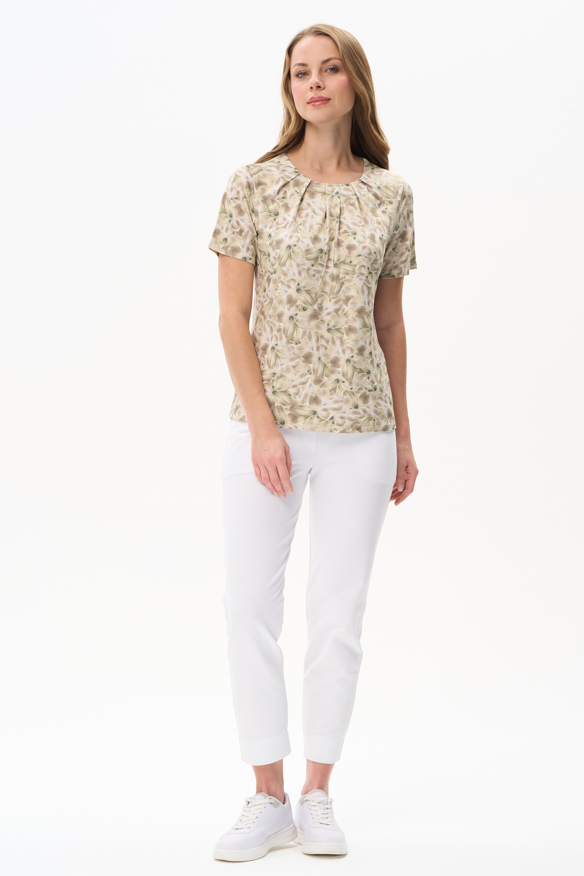 Блузка из вискозного полотна. Модель с округлой горловиной и мягкими складками. Втачные короткие рукава. Рост модели 175 см.