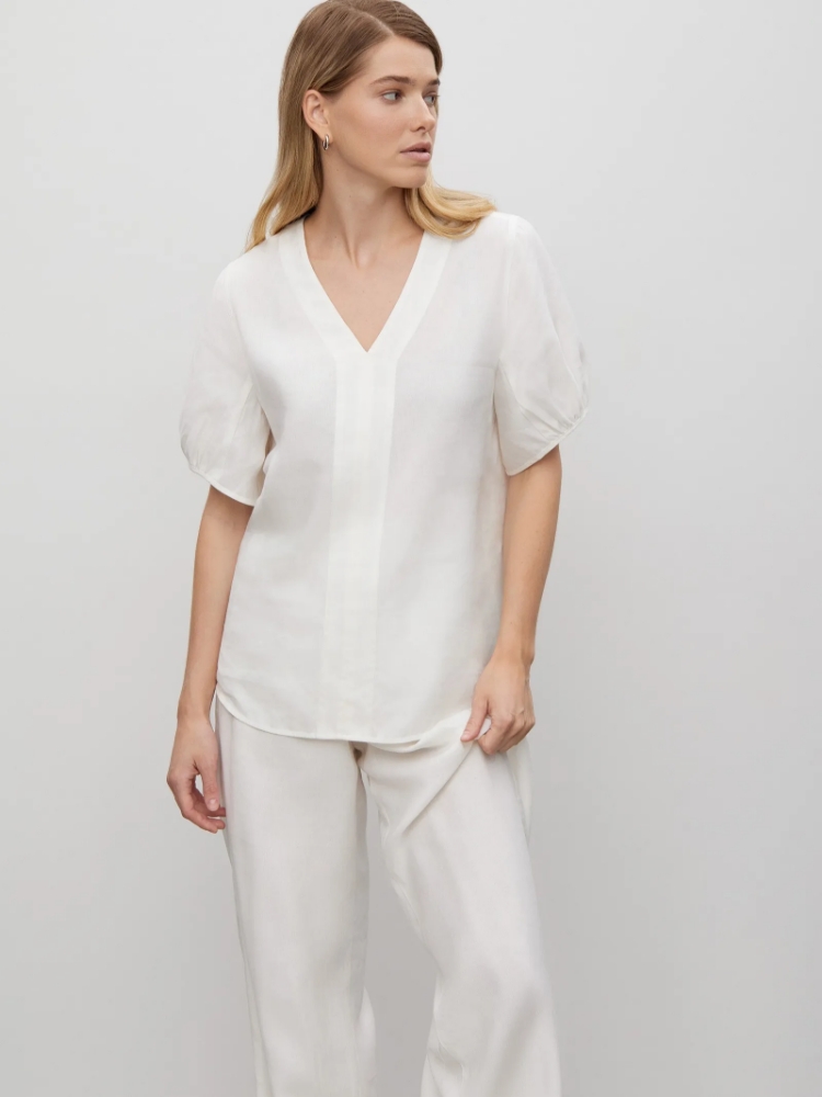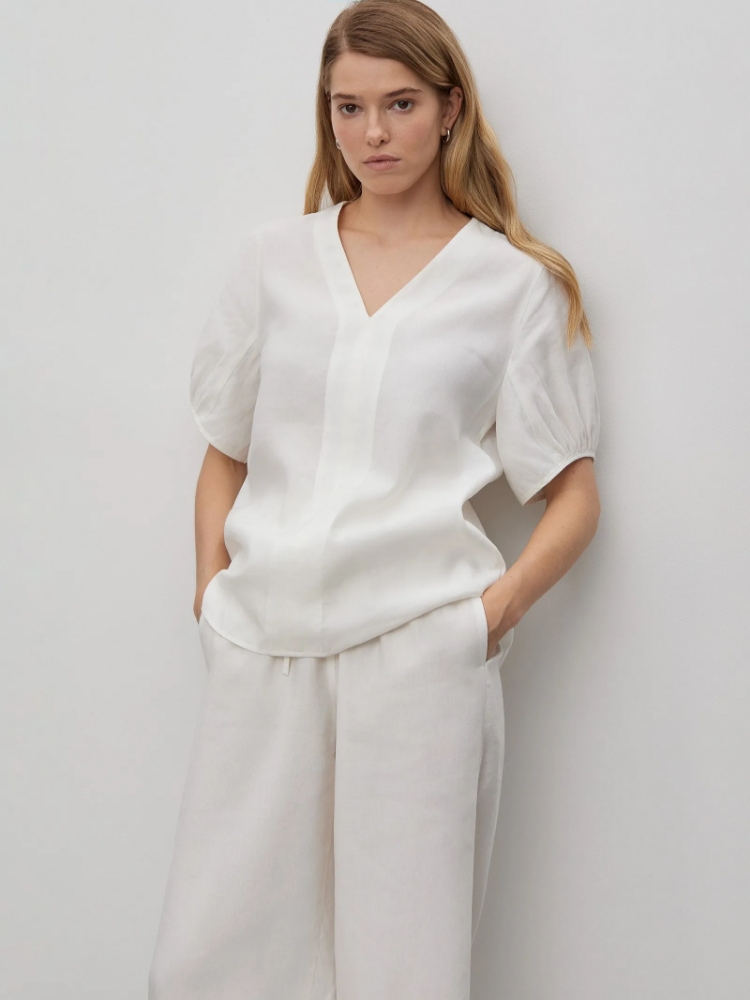 Женственная блуза изо льна и вискозы в молочном цвете — must have летнего гардероба. Модель без пуговиц имеет V-образный вырез, от которого к низу изделия спускается планка в тон. Изюминка этой модели — рукава с изящной сборкой по краям. Свободные короткие рукава приобретают более изысканные очертания за счёт мягких складок. Блуза отлично вписывается в стиль коттеджкор, станет базой для образов в стиле бохо-шик, придаст очарование кэжуальным образам на каждый день. Лаконичность кроя и цветового решения делает её универсальной. Дополнить блузу можно брюками из комплекта
