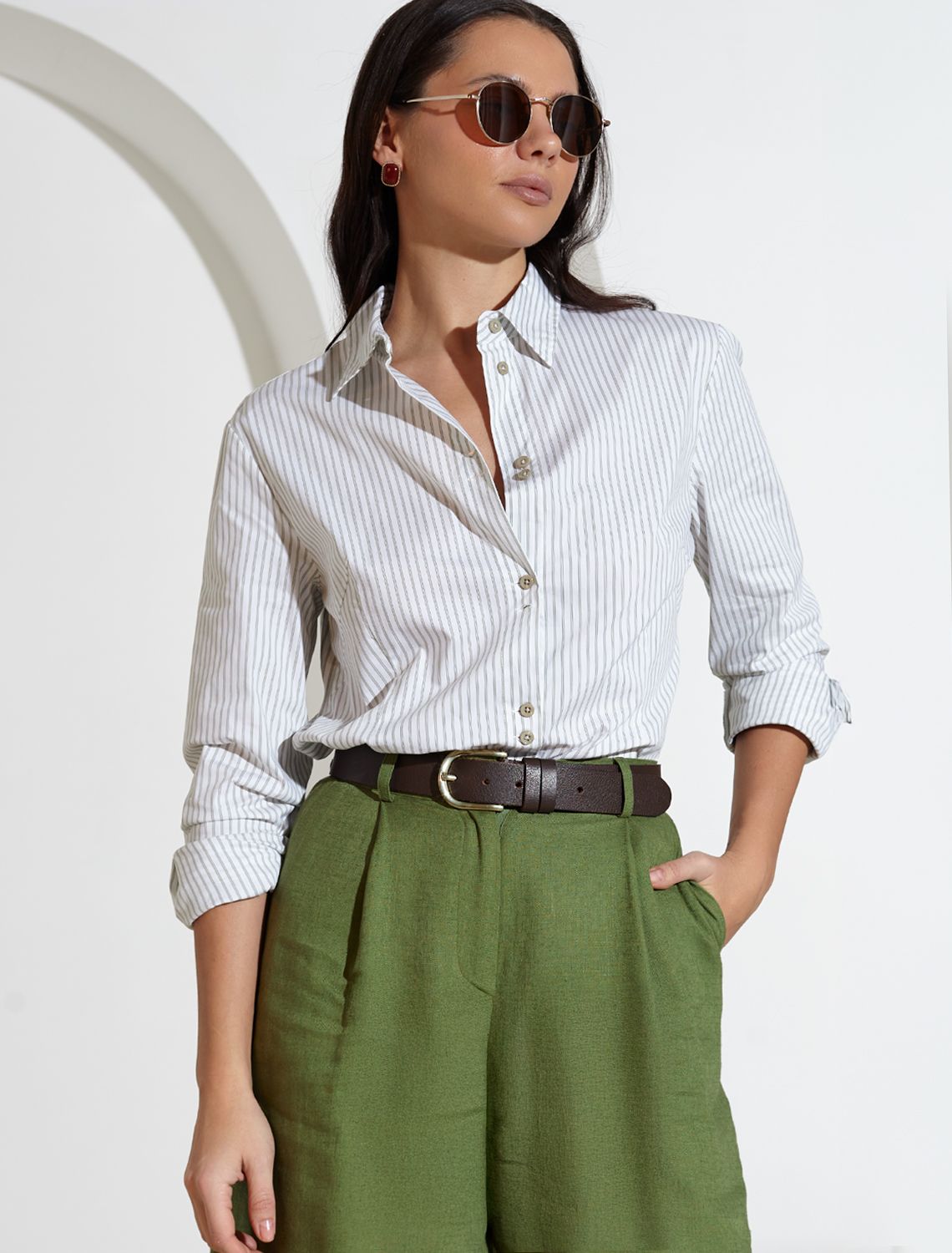 Блузка прилегающего силуэта выполнена из формоустойчивого хлопка. Фишкой изделия служат парные контрастные пуговицы. На спинке фирменный металлический логотип бренда. Изделие хорошо держит форму, подчеркивает силуэт и подходит для любой фигуры. Идеальный вариант для респектабельных образов в деловом стиле.