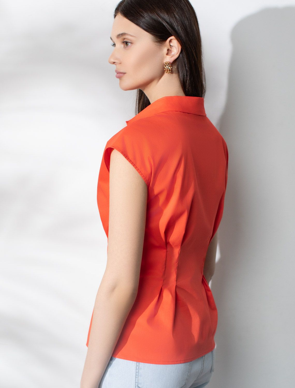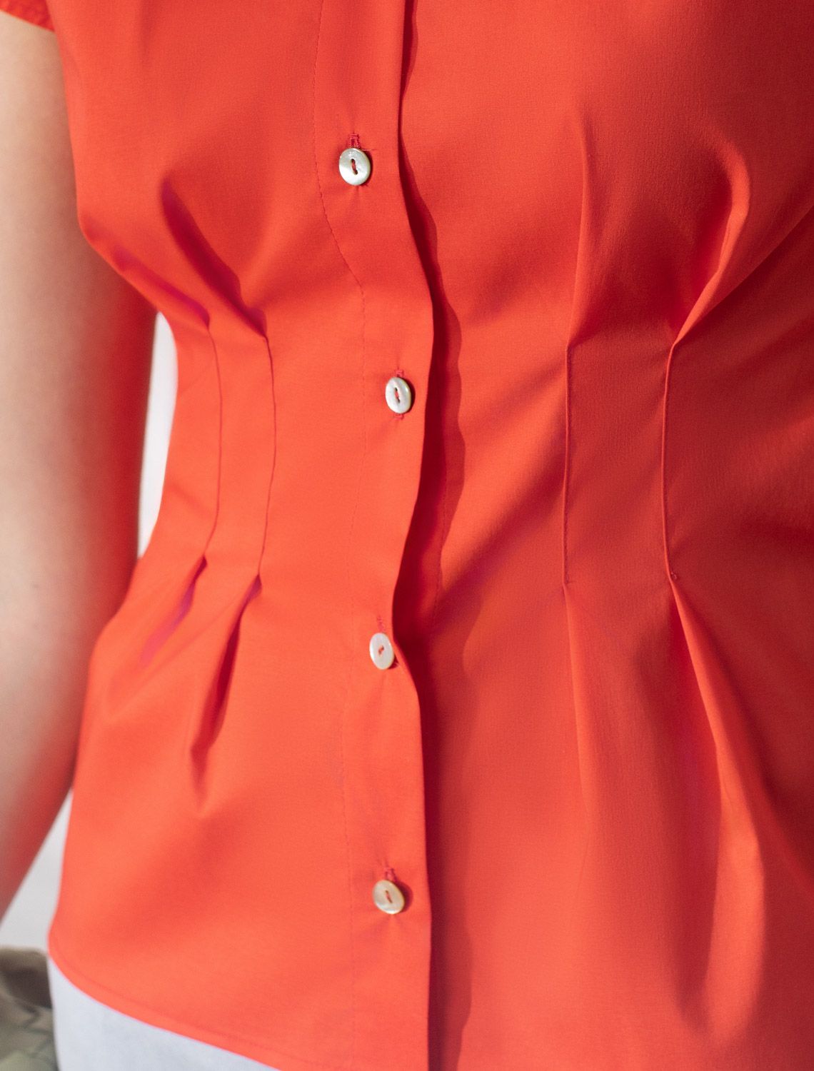 Изысканная женственная блузка кораллового цвета выполнена из легкого хлопкого поплина плотностью 96 Г/м2 и будет идеальна для создания комфортного и красивого образа в теплое время года. Натуральный материал отличается мягкостью и воздухопроницаемостью, что особенно ценно в жаркую погоду. Основное преимущество повседневной блузки — аккуратный приталенный силуэт, подчеркивающий достоинства фигуры и создающий акцент на линии талии. Короткий цельнокроеный рукав придает образу свежесть и легкость. Однотонная рубашка с отложным воротничком подойдет для работы в офисе, встреч с друзьями, прогулок, для особого случая или праздника. Лаконичная легкая блузка отлично сочетается с разнообразными элементами гардероба, благодаря ей можно создать классический или романтичный образ. коралловый