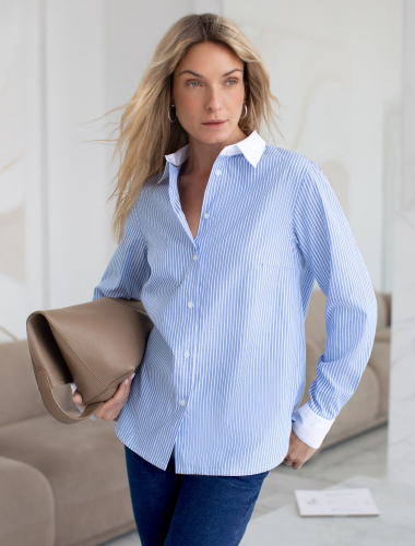Блузка прямого силуэта с контрастными манжетами и отложным воротником. Модель выполнена из хлопка с добавлением ПЭ, благодаря этому материал почти не мнется, долго сохраняет идеальный внешний вид. На спинке изделия металлический логотип бренда. голубой