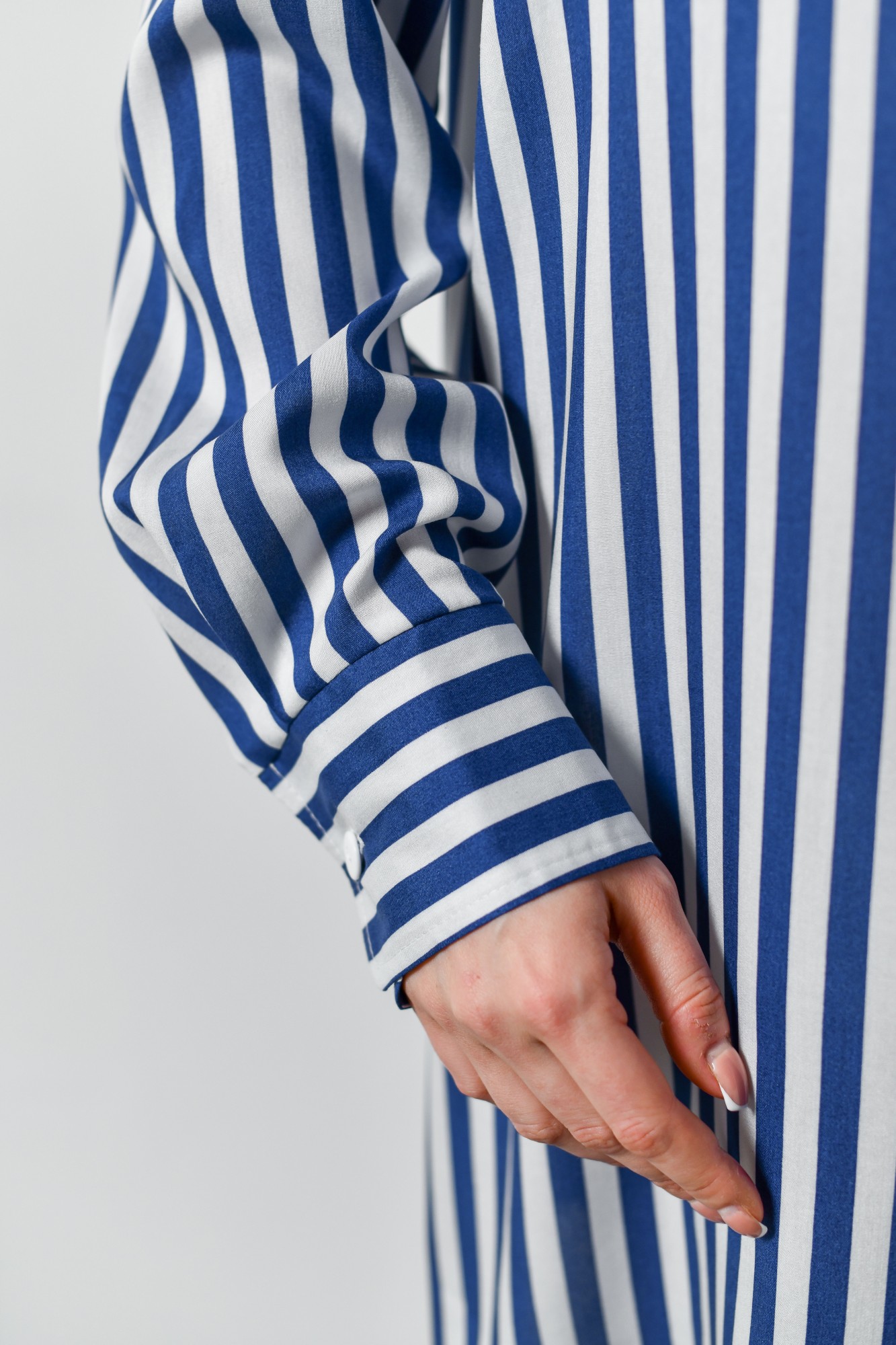 Блузка-рубашка женская из штапельного полотна с набивным рисунком «полоска», свободного кроя, удлиненная, со стояче-отложным воротником, спущенным длинным рукавом. Перед из двух частей с центральной бортовой застежкой на петли и пуговицы, спинка цельнокроеная. Низ рукава с притачной манжетой, застегивающейся на петлю и пуговицу.