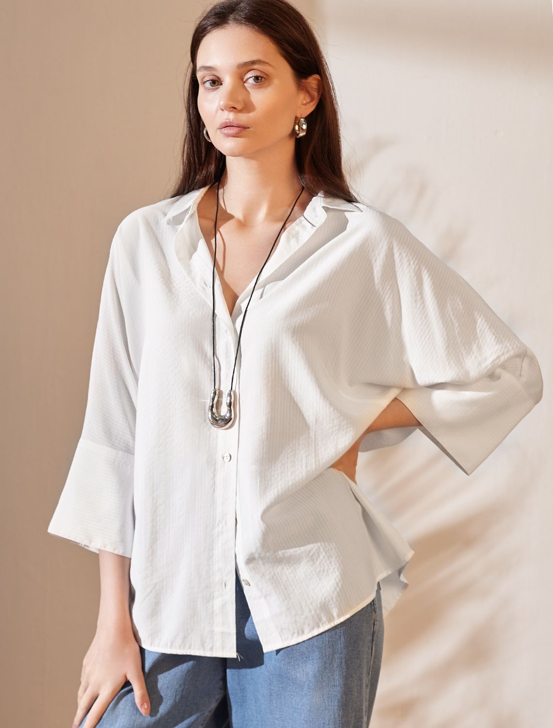 Стильная блузка белого цвета идеально держит форму и подчеркивает любую фигуру. Свободный крой с цельнокроеным рукавом 3/4 создает эффект легкой непринужденности и комфорта, а манжеты на рукавах добавляют аккуратности и завершенности образу. Отложной воротник придает блузке классическую нотку, которая гармонично сочетается в деловом образе. Хлопок с добавлением эластана гарантирует отличную посадку, подчеркивая достоинства и скрывая недостатки, при этом сохраняет свежесть на протяжении всего дня. Такая рубашка станет великолепным выбором для тех, кто ценит удобство и стиль одновременно. Модель удачно сочетается с различными предметами гардероба, позволяя создавать стильные и практичные образы в любую погоду.