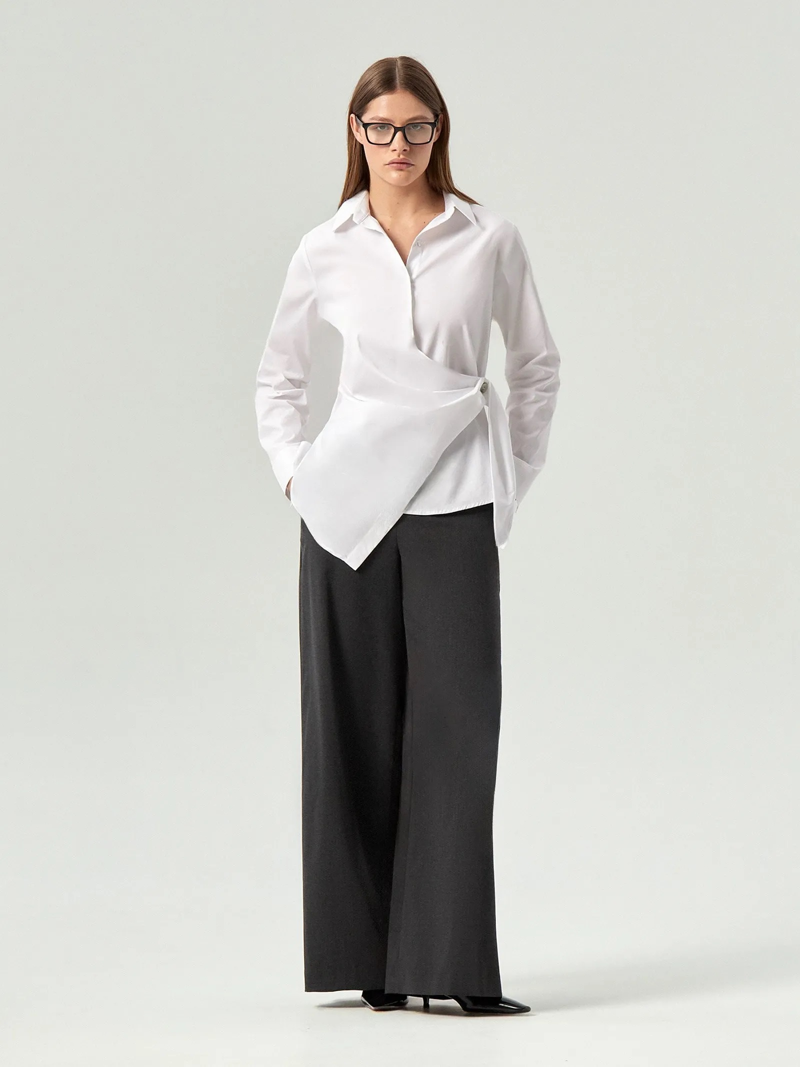 Блузка с крупной драпировкой в трендах года станет отличным вариантом для офиса и планов на вечер. Выполнена в белом цвете из комфортного материала с высоким содержанием хлопка. Отличной парой к блузке станут юбка-футляр или лаконичные костюмные брюки чёрного цвета