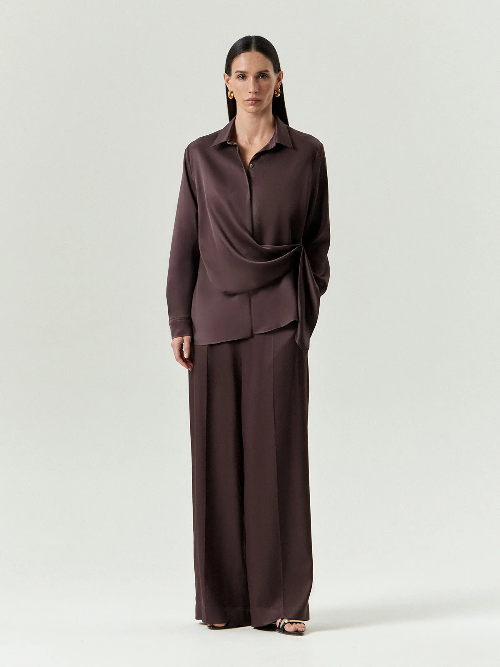 Блузка с крупной драпировкой в трендах года станет отличным коктейльным и выходным вариантом, отлично подойдёт как для корпоратива в офисе, так и для вечера в театре или воскресного бранча. Выполнена в шоколадном цвете из струящегося материала с высоким содержанием вискозы. Отличной парой к блузке станут брюки из комплекта.
