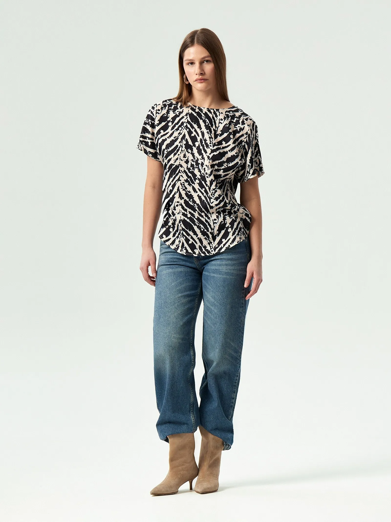 Блуза из комфортной вискозы с абстрактным принтом. Свободная модель прямого кроя с коротким рукавом и круглым вырезом подойдёт к любому базовому низу. Сзади под застёжкой имеется аккуратный вырез-капля. Блуза изготовлена без подкладки.