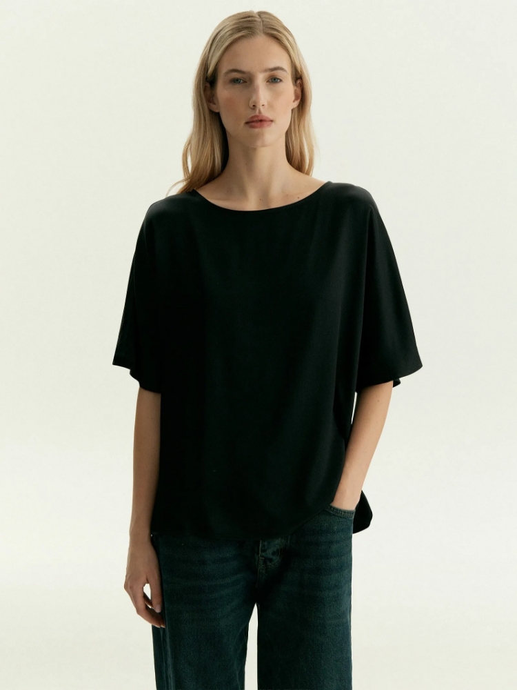 Блуза-футболка украсит повседневные образы и органично впишется в нарядные. Сделана из шелковистой ткани на основе вискозы. Модель имеет элегантный вырез-лодочку и стильный цельнокроеный рукав длиной до локтя. Сочетается с любым базовым низом и интересными юбками: сатиновыми, из органзы, тафты и так далее