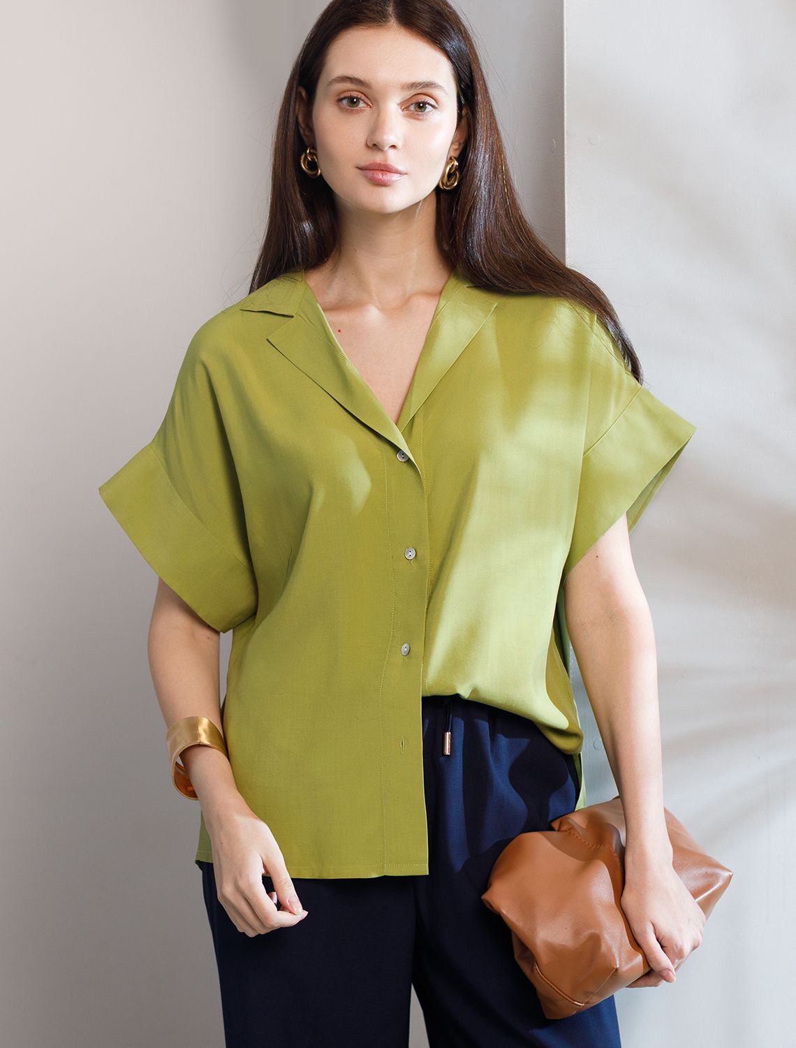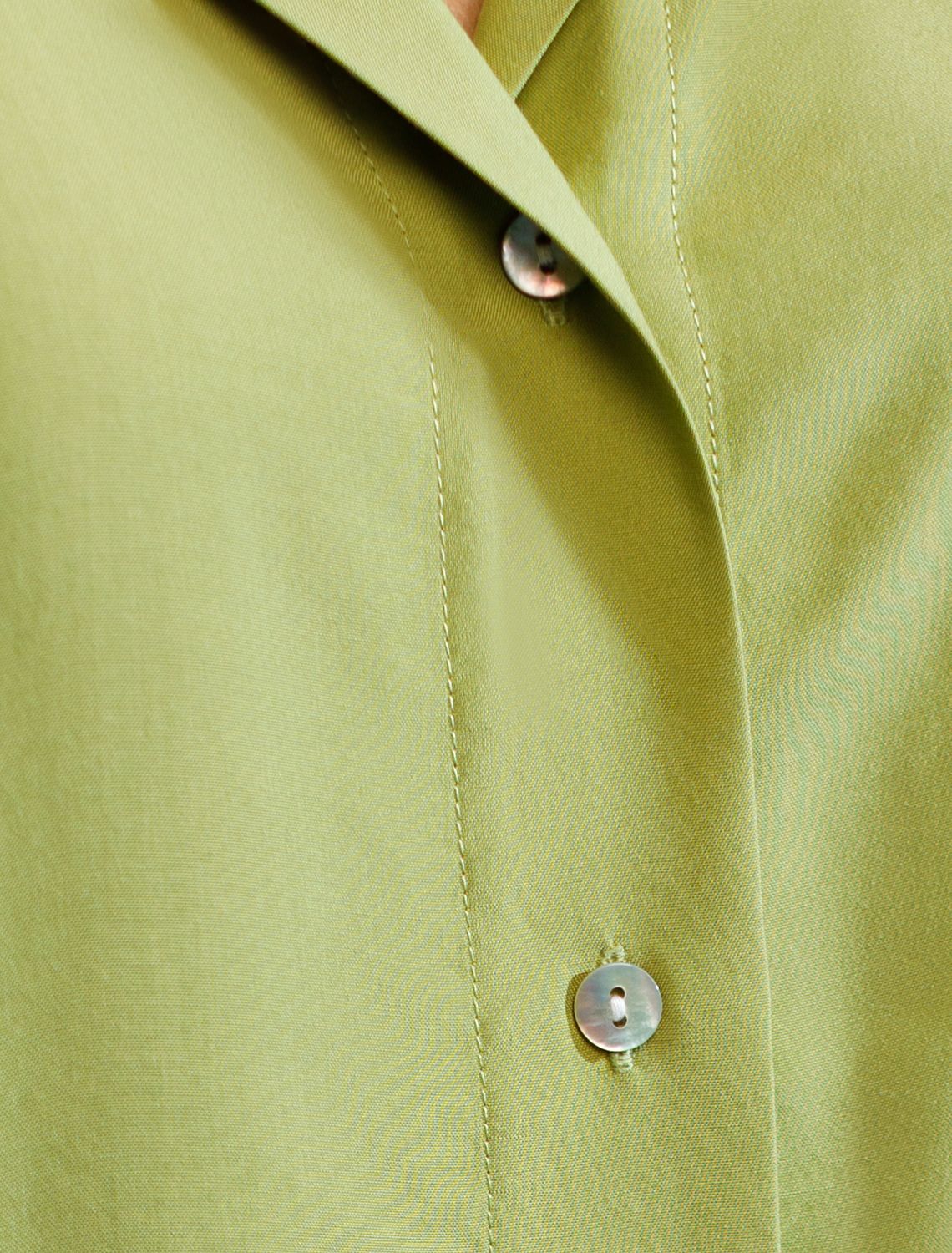 Блузка светло-оливкового цвета сочетает в себе комфорт и элегантность благодаря материалу из вискозы с лиоцеллом. Аккуратный отложной воротник подчеркивает утонченность образа, а широкие короткие рукава привлекают внимание и делают силуэт современным. Спущенная линия плеча формирует расслабленный, но стильный внешний вид, что идеально для тех, кто ценит индивидуальность и уверенность в деталях. Крой продуман так, чтобы подчеркивать достоинства фигуры и на больших размерах, создавая гармоничный силуэт без лишних усилий. Ткань из вискозы с добавлением лиоцелла обеспечивает приятные ощущения и отличную посадку, струится на теле и охлаждает в жаркую погоду. При пошиве использована технология «чистый край» по всей длине центральной планки и низу изделия. Это признак премиум качества — «чистый край» вместо оверлока. Блузку можно носить с топом, не застегивая — при этом распахнутая блузка будет выглядеть максимально эстетично. Рубашка легко впишется как в деловой гардероб, так и в повседневный стиль, позволяя выглядеть безупречно независимо от ситуации. светло-оливковый