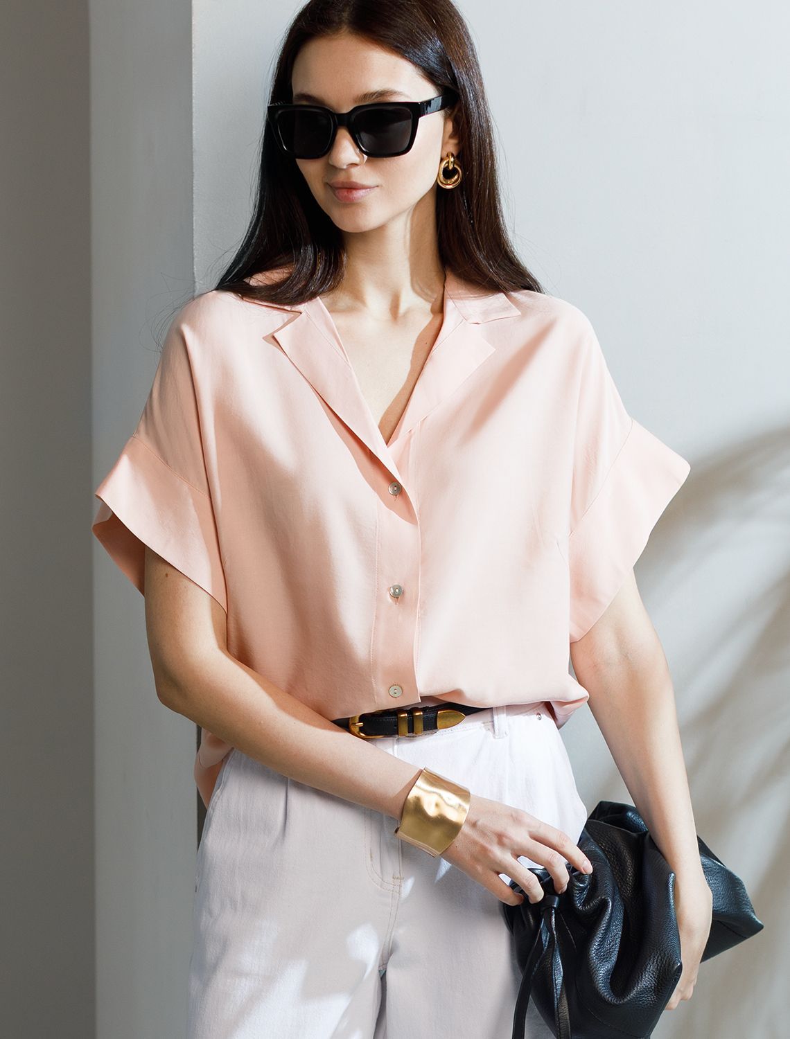 Блузка пудрового цвета сочетает в себе комфорт и элегантность благодаря материалу из вискозы с лиоцеллом. Аккуратный отложной воротник подчеркивает утонченность образа, а широкие короткие рукава привлекают внимание и делают силуэт современным. Спущенная линия плеча формирует расслабленный, но стильный внешний вид, что идеально для тех, кто ценит индивидуальность и уверенность в деталях. Крой продуман так, чтобы подчеркивать достоинства фигуры и на больших размерах, создавая гармоничный силуэт без лишних усилий. Ткань из вискозы с добавлением лиоцелла обеспечивает приятные ощущения и отличную посадку, струится на теле и охлаждает в жаркую погоду. При пошиве использована технология «чистый край» по всей длине центральной планки и низу изделия. Это признак премиум качества — «чистый край» вместо оверлока. Блузку можно носить с топом, не застегивая — при этом распахнутая блузка будет выглядеть максимально эстетично. Рубашка легко впишется как в деловой гардероб, так и в повседневный стиль, позволяя выглядеть безупречно независимо от ситуации.