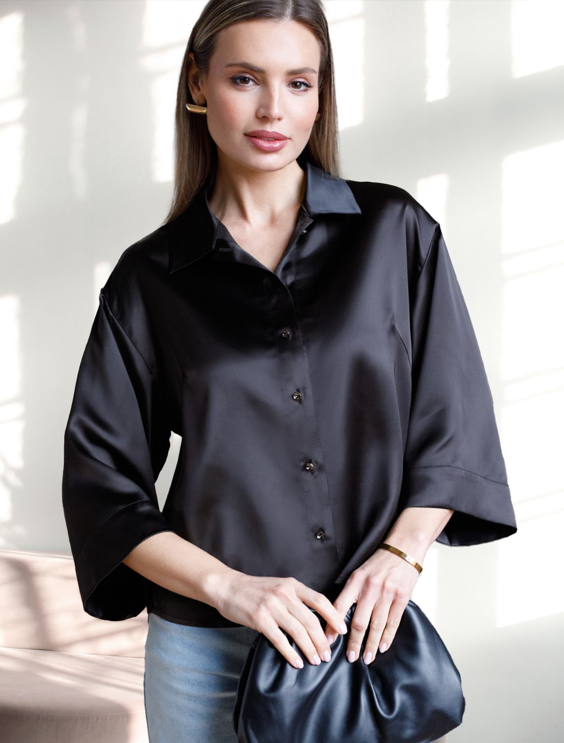 Элегантная блузка черного цвета на пуговицах выполнена из плотного струящегося сатина, который мягко ложится по фигуре и создает эффектную посадку. Отложной воротник придает образу женственную и изящную нотку. Материал отличается дышащей структурой, благодаря чему комфорт сохраняется даже в течение всего дня. Широкие рукава обеспечивают свободу движений и подходят для полных рук, делая блузку универсальной для разных типов фигур, в том числе для больших размеров. Красивая гладкая фактура материала подчеркивает утонченность изделия, добавляя легкое сияние к любому образу. Благодаря продуманному крою эта рубашка смотрится стильно как в повседневной жизни, так и на особых мероприятиях. Ткань практична, она приятна на ощупь, легко ухаживается и долго сохраняет первоначальный вид даже после многократных стирок и активной носки.